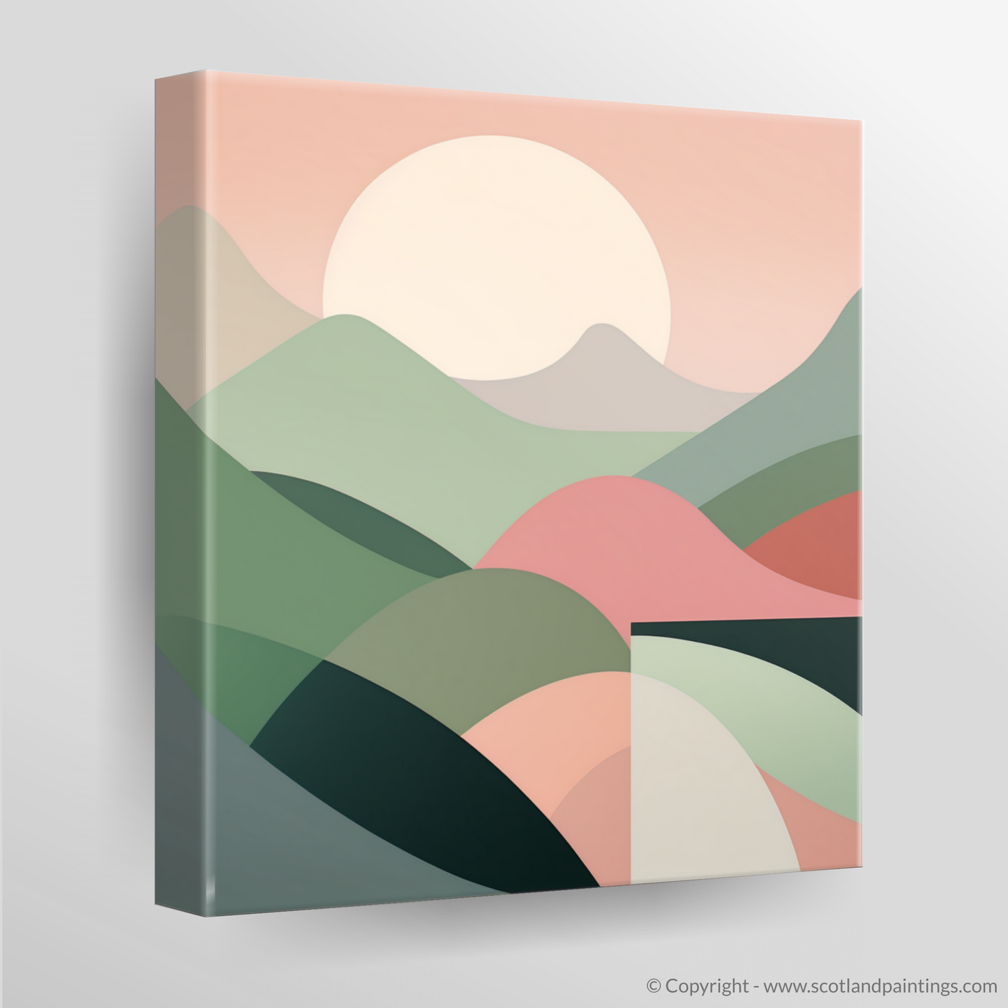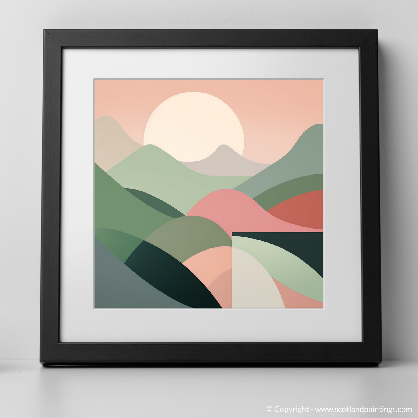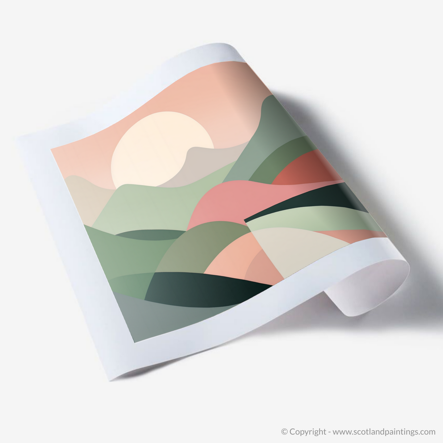 Soft blushes of dawn radiate from the canvas as the central orb of a stylised sun hangs low in the pastel-hued sky, casting a gentle luminescence that infuses the scene with tranquillity. The peaks and valleys are captured through an abstract lens, exhibited in a succession of curved forms that suggest rather than define the topography of this cherished Highland vista.