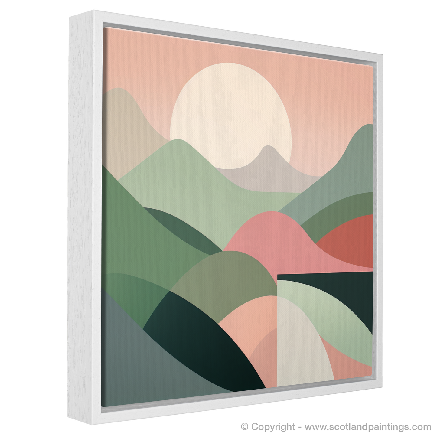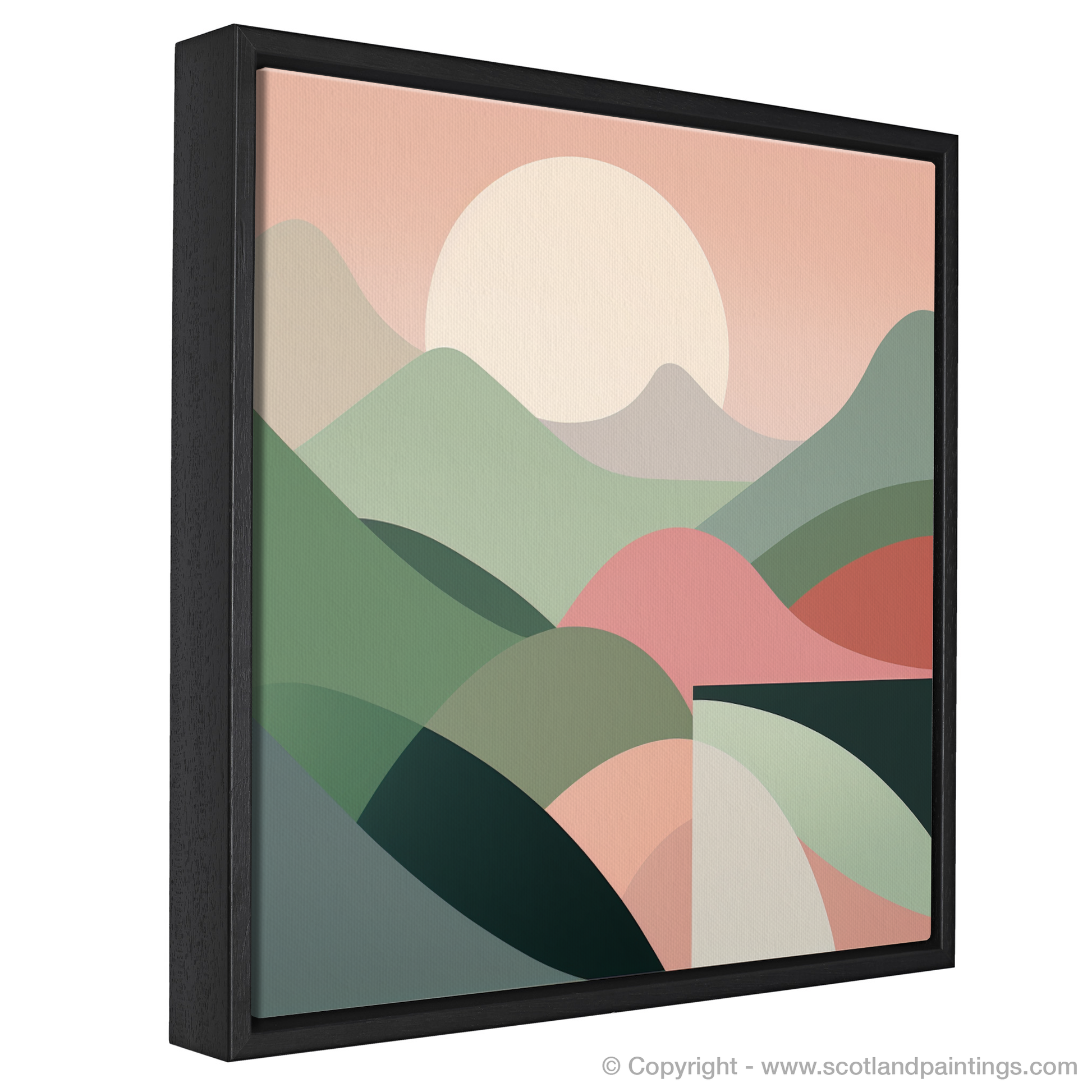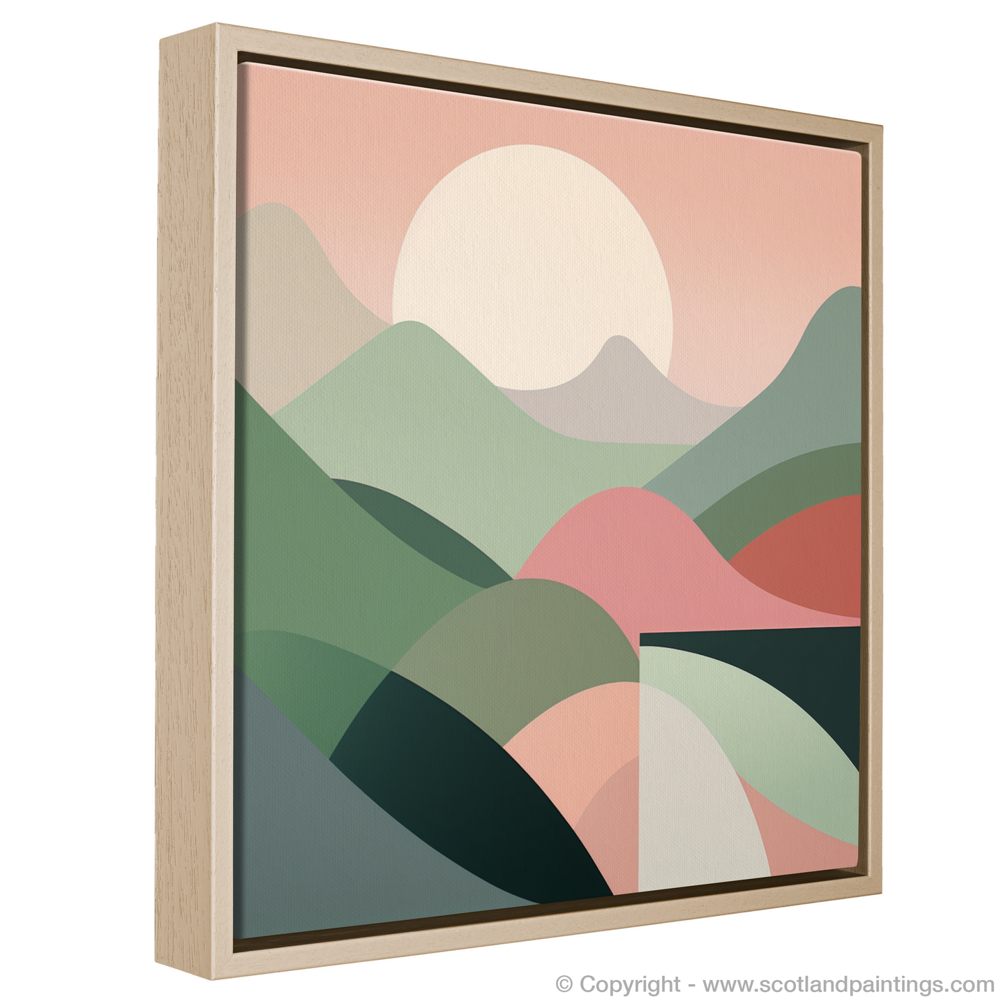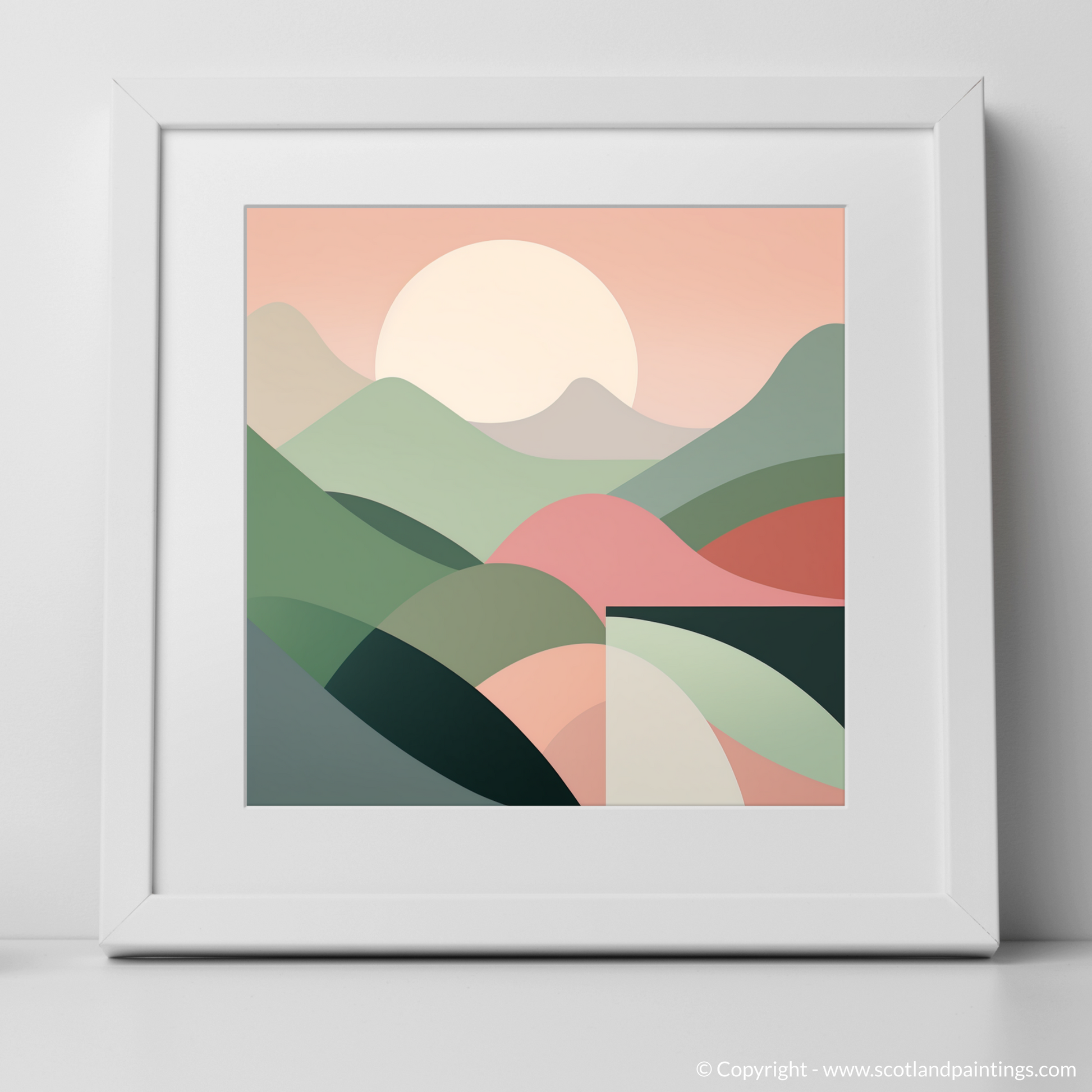 Soft blushes of dawn radiate from the canvas as the central orb of a stylised sun hangs low in the pastel-hued sky, casting a gentle luminescence that infuses the scene with tranquillity. The peaks and valleys are captured through an abstract lens, exhibited in a succession of curved forms that suggest rather than define the topography of this cherished Highland vista.