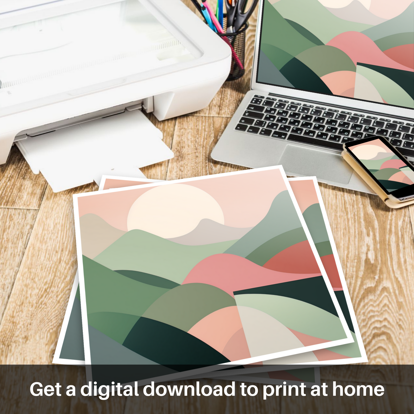 Moss greens, dusky pinks, and slate greys create a playful yet sophisticated palette that gently nudges the imagination towards the lush grasses, striking rocks, and open expanses of the real-world locale. This thoughtfully composed print, a part of our 'Modern & Minimal' collection, offers a simultaneously bold and understated aesthetic that is as versatile as it is captivating, ideal for any space that craves a touch of contemporary calm.