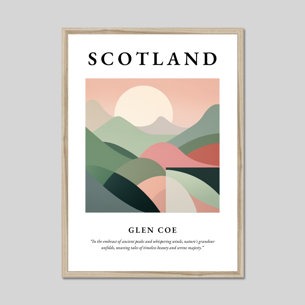 The poster features the word “SCOTLAND” in bold, capturing attention and evoking a sense of pride and nostalgia for those who cherish this enchanting land. Below, a stunning minimalist painting of Glen Coe unfolds. Soft, harmonious shapes and colours merge to convey the serene and timeless beauty of the ancient peaks. The gentle interplay of hues captures the essence of nature’s grandeur, inviting contemplation and appreciation from art lovers and Scotland enthusiasts alike.