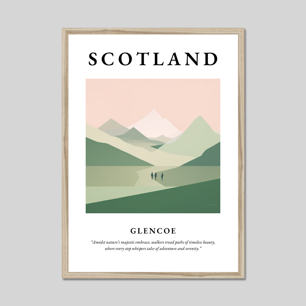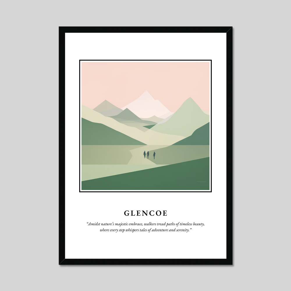 Beneath the image lies a heartfelt quote: “Amidst nature’s majestic embrace, walkers tread paths of timeless beauty, where every step whispers tales of adventure and serenity.” This encapsulates the spirit of Glencoe, making this poster an ideal addition for adventurers, art lovers, and anyone with cherished memories of this iconic locale.
