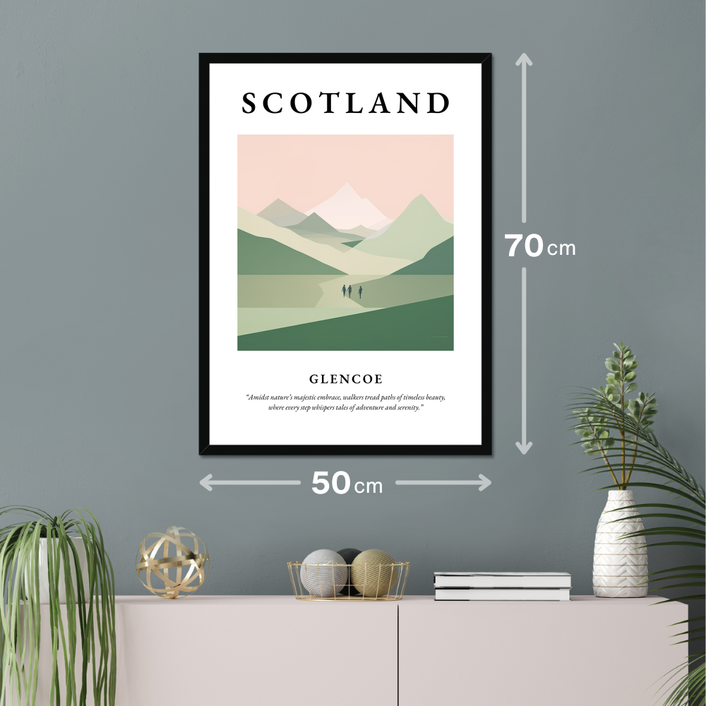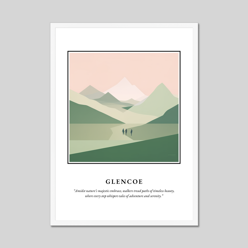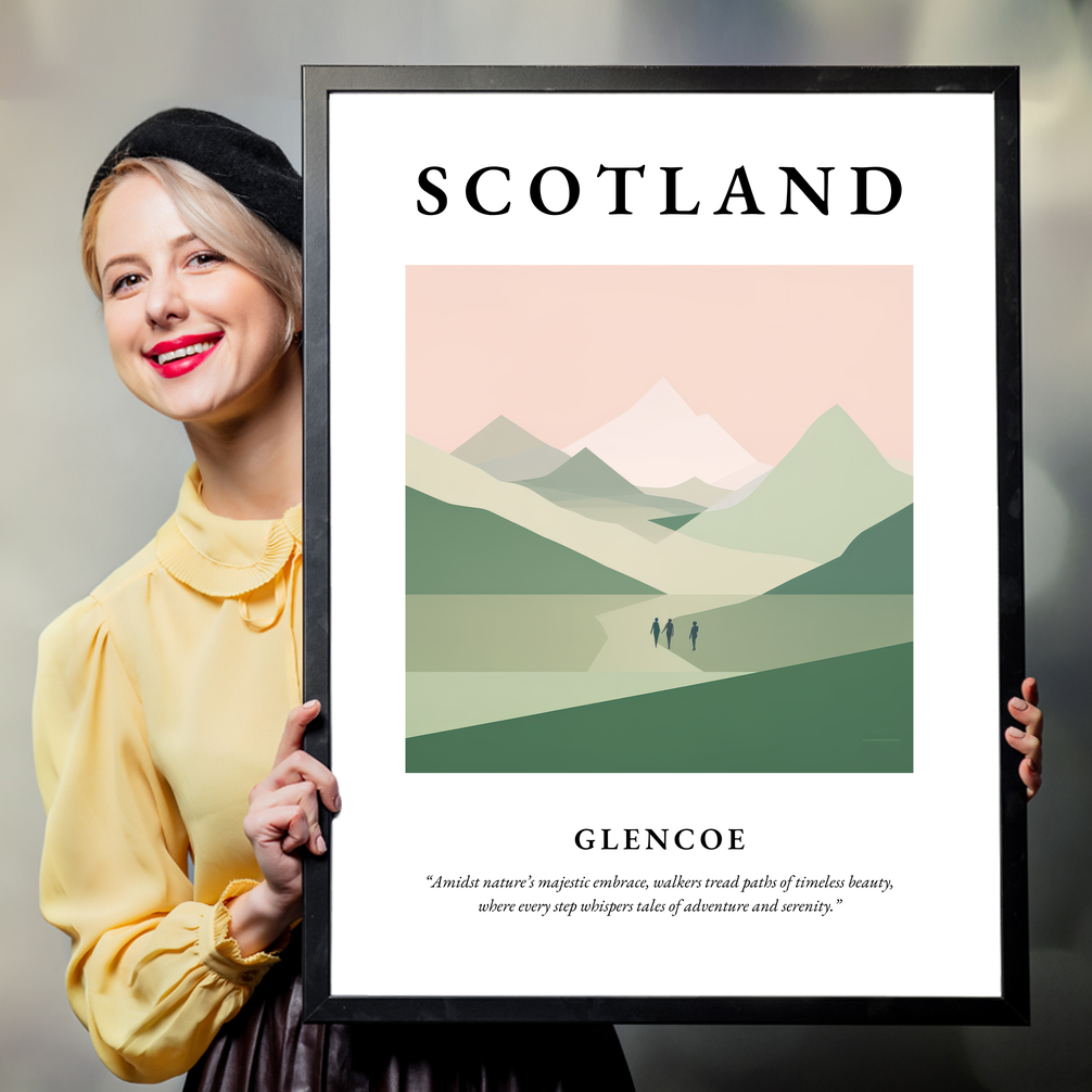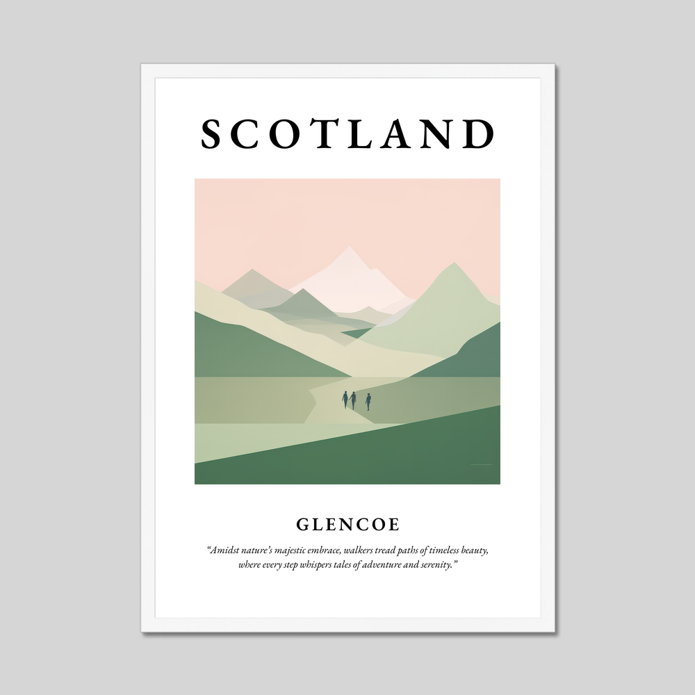 This print not only provides a window into the tranquil beauty of Glencoe but also serves as a reminder of the adventures waiting just beyond the horizon. Whether you have walked its paths, dream of exploring its wild expanse, or simply wish to bring a hint of Scotland's grandeur into your home, this poster is a timeless tribute to the magic and mystery of the highlands.