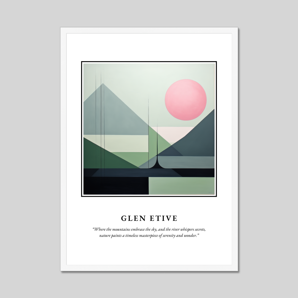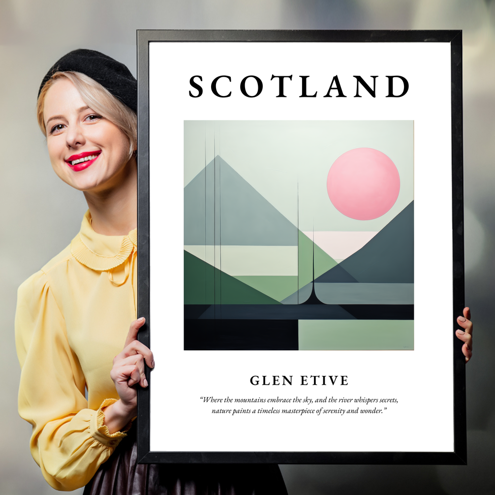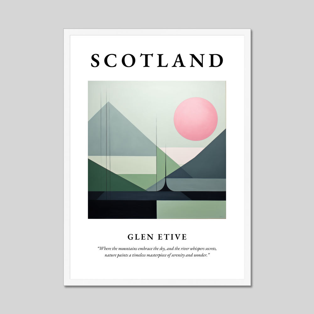The poster features the word "SCOTLAND" in bold lettering, setting the stage for the breathtaking minimalist painting below, which captures the essence of Glen Etive. The harmonious blend of abstract shapes and subdued tones beautifully evokes the tranquil atmosphere where mountains meet the sky. The gentle curves and lines hint at rolling hills and serene waters, inviting viewers to lose themselves in the calm allure of the landscape. Below the painting, a reflective quote further enhances the sense of wonder and serenity captured in this piece.