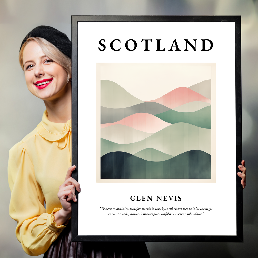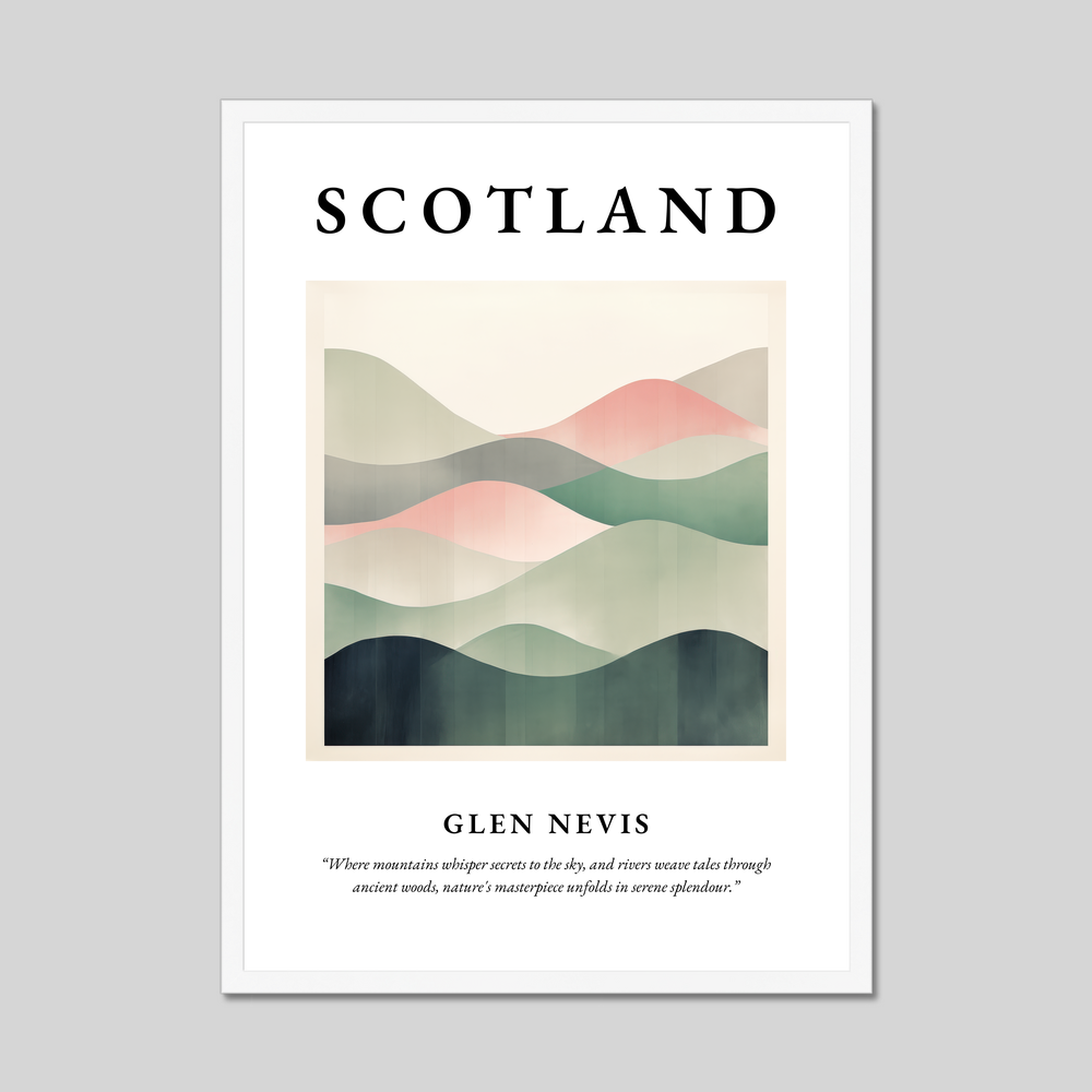 The poster begins with “SCOTLAND” emblazoned at the top, drawing the eye to the minimalist interpretation of Glen Nevis below. Muted tones of pink, green, and blue converge in fluid forms, evoking the tranquil undulations of the landscape. Beneath this visually striking painting, the poetic quote, “Where mountains whisper secrets to the sky, and rivers weave tales through ancient woods, nature's masterpiece unfolds in serene splendour,” invites viewers to lose themselves in the otherworldly charm of the Highlands.