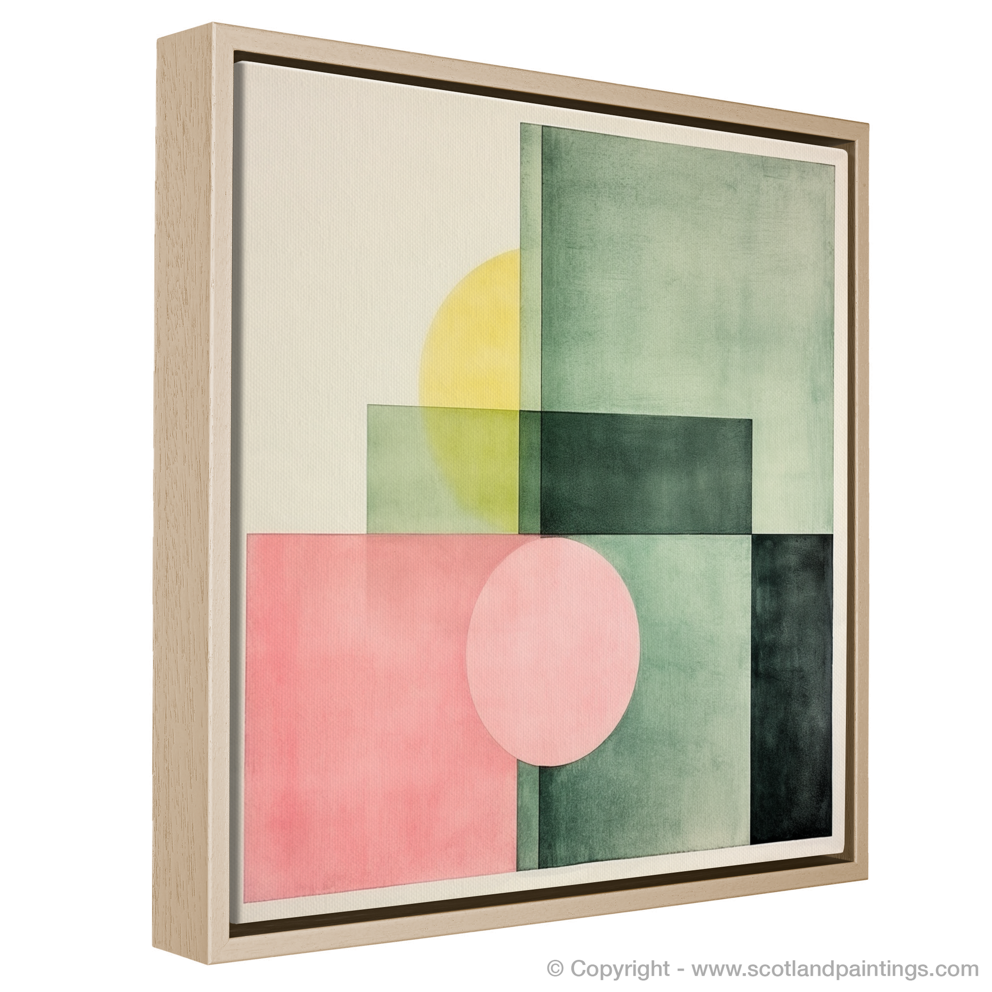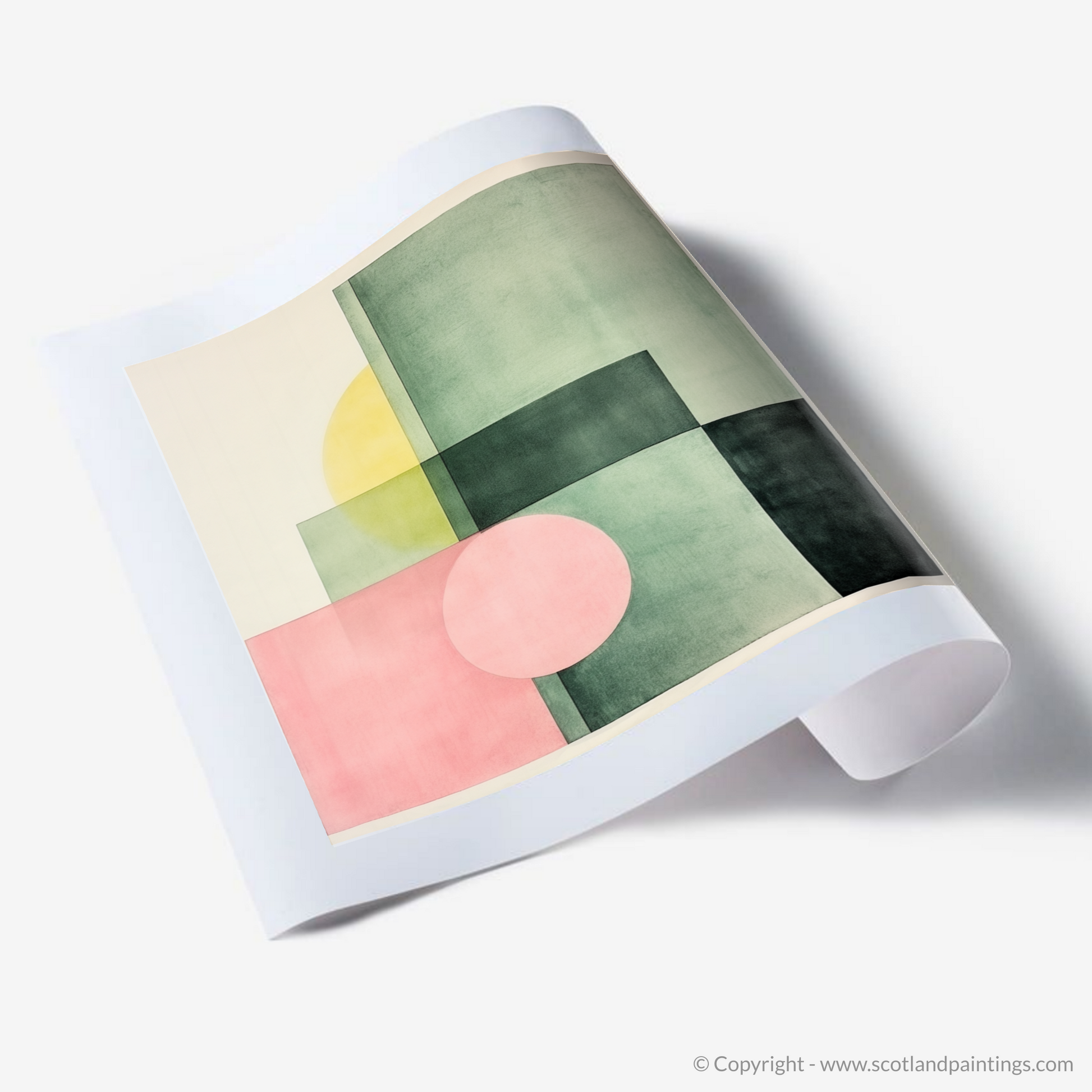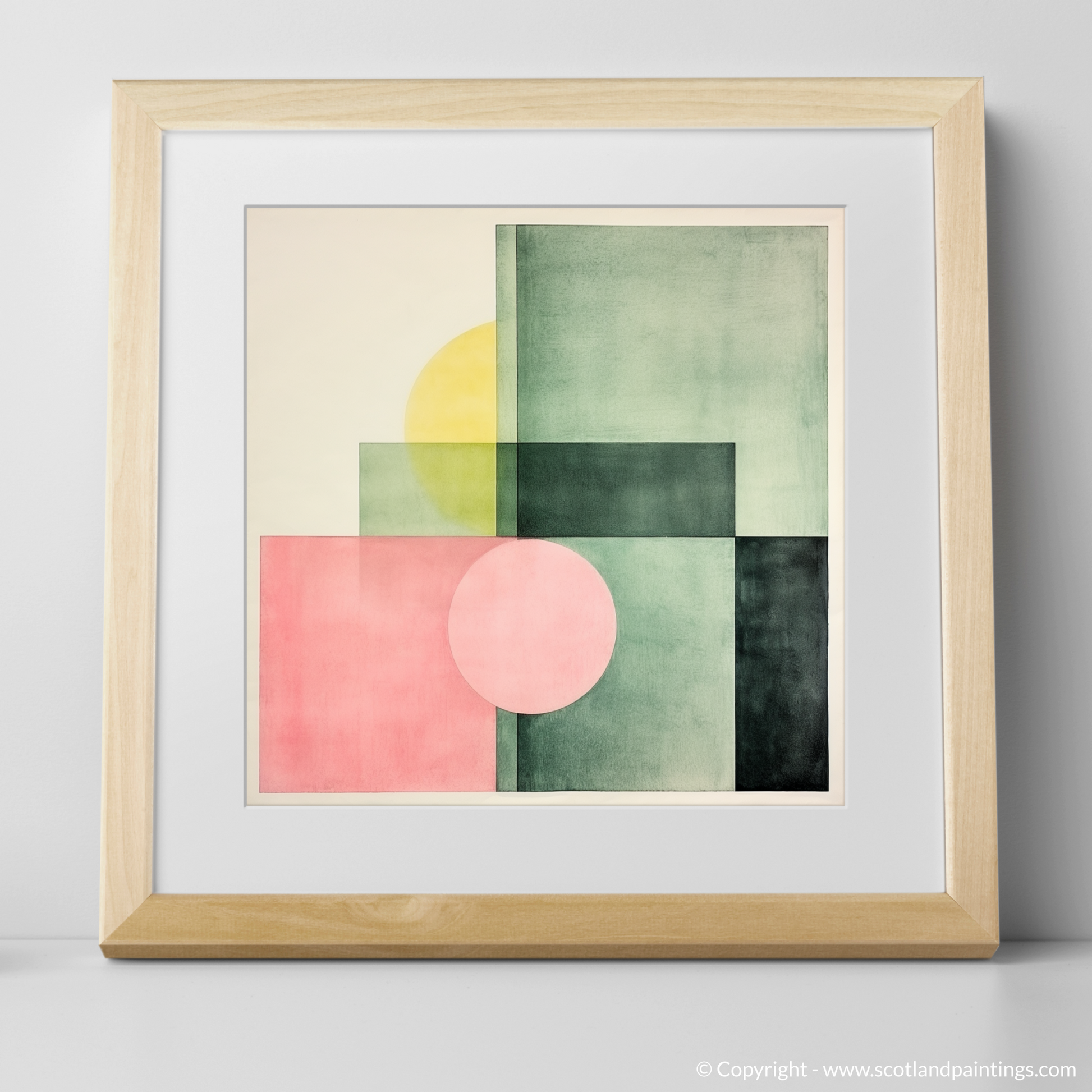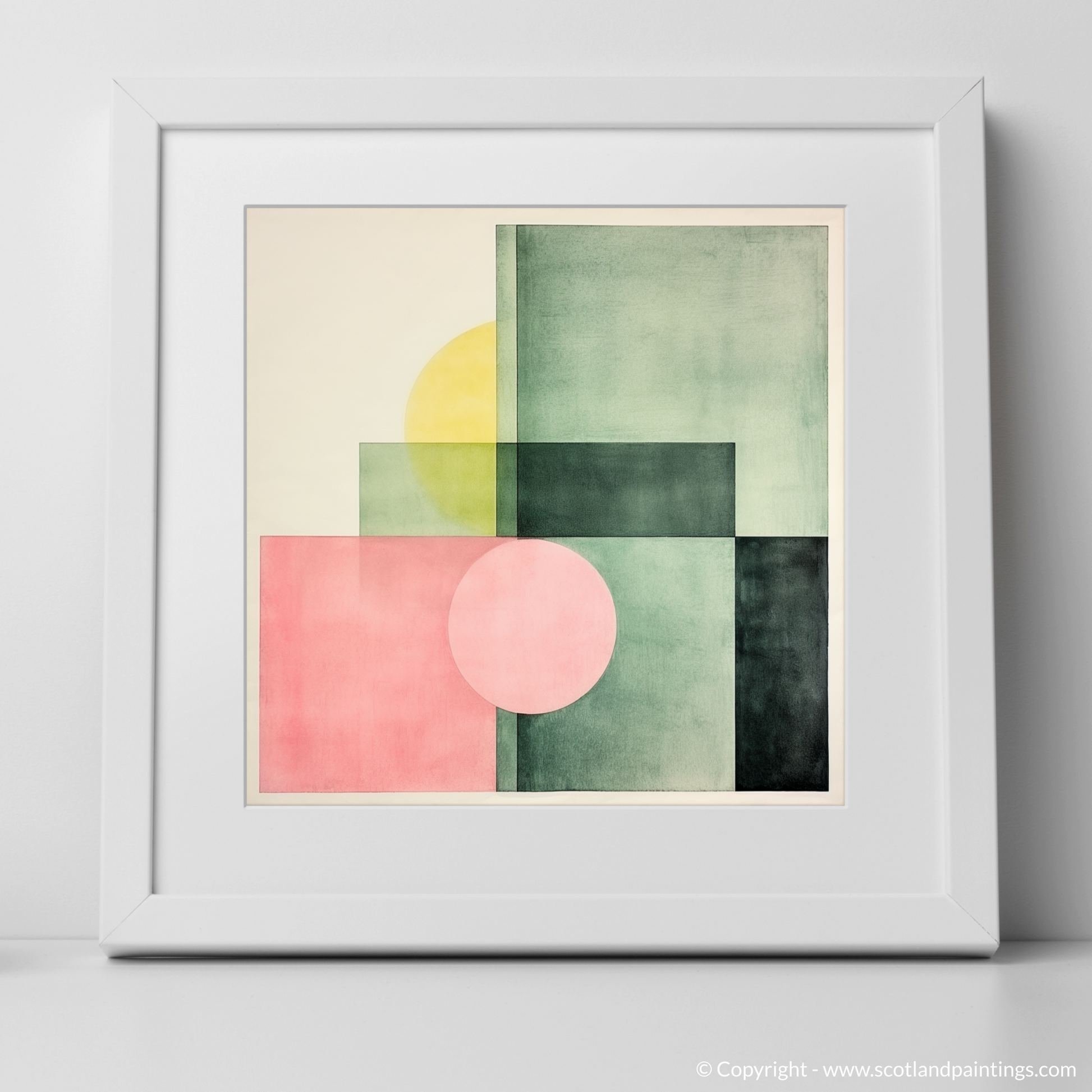 Subtle gradations of colour create a sophisticated interplay of shapes and spaces in this print. Gentle hues of dusky pink and sage green are bisected by deep, forest-toned blocks, crafting a composition that captures the imagination. Overlapping forms generate new hues and tones, underscoring the complexity hidden within the minimalist design. The infusion of a mellow yellow disc partially obscured by a square echoes the celestial presence of the sun playing hide and seek behind the town's iconic structures.
