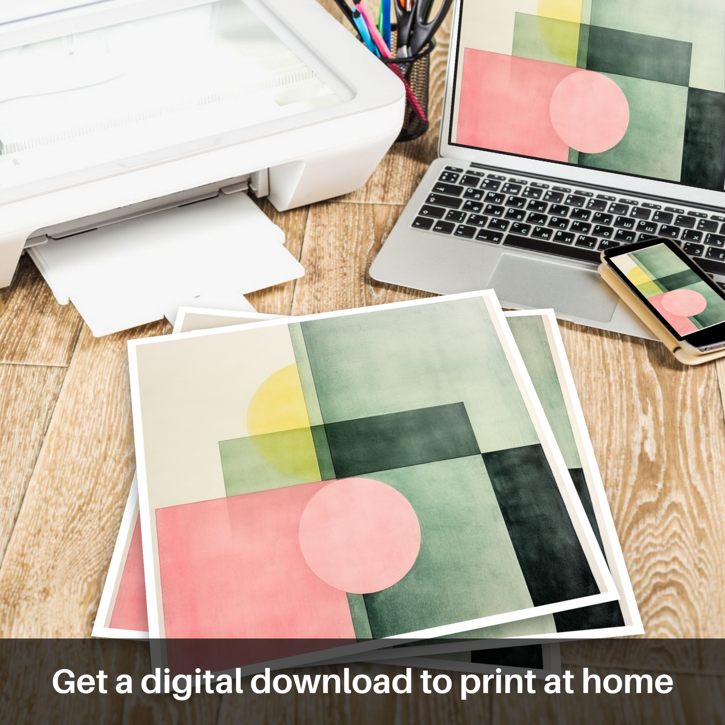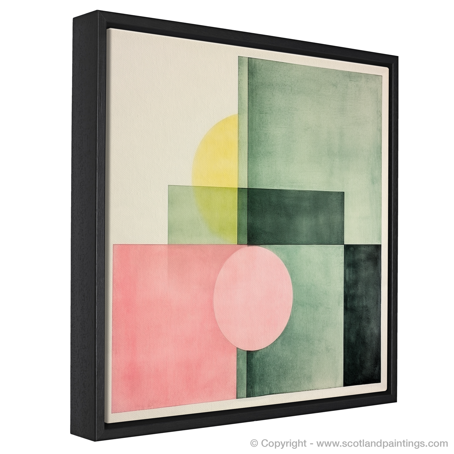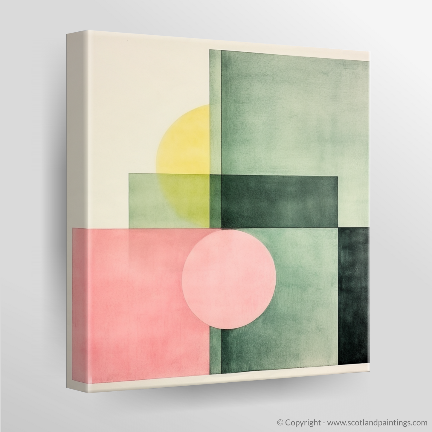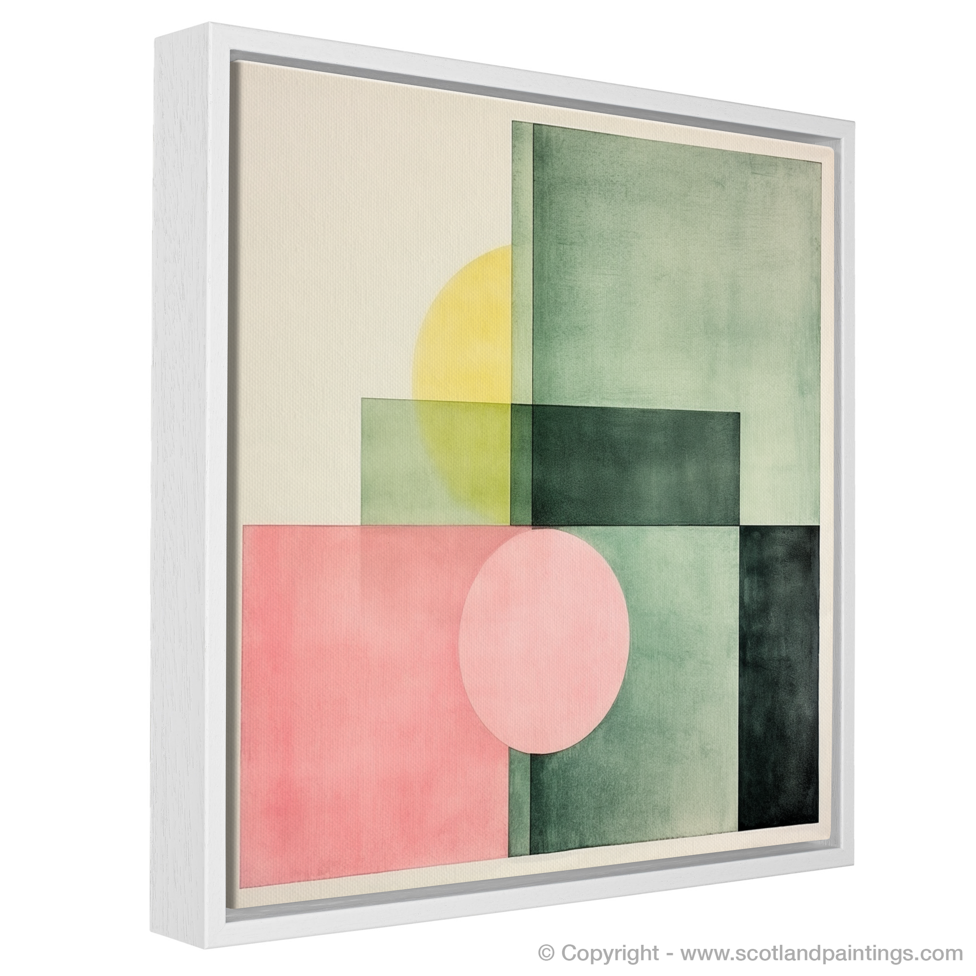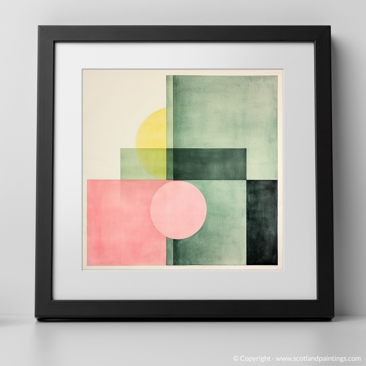 Subtle gradations of colour create a sophisticated interplay of shapes and spaces in this print. Gentle hues of dusky pink and sage green are bisected by deep, forest-toned blocks, crafting a composition that captures the imagination. Overlapping forms generate new hues and tones, underscoring the complexity hidden within the minimalist design. The infusion of a mellow yellow disc partially obscured by a square echoes the celestial presence of the sun playing hide and seek behind the town's iconic structures.