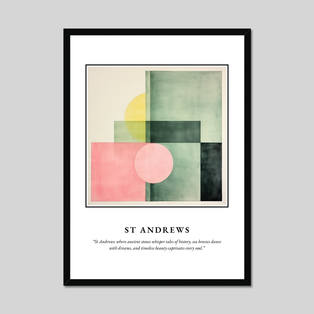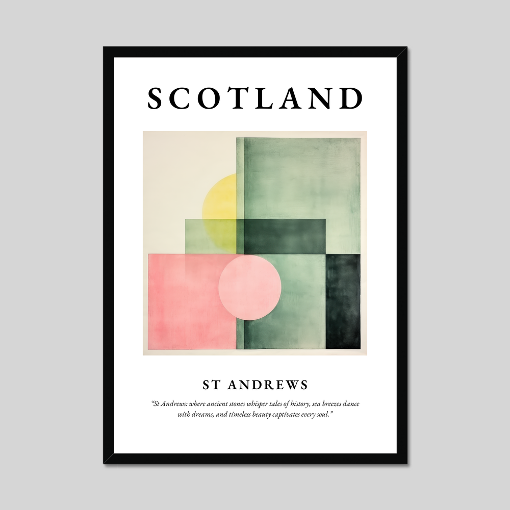 The minimalist portrayal in the poster encapsulates the essence of St Andrews' timeless allure. Its serene and storied character is beautifully captured in the artwork's simple but striking forms, a testament to the town’s enduring legacy and captivating appeal. Whether you've wandered its historic streets or dream of visiting, this artwork brings a piece of Scotland’s soul into your home.