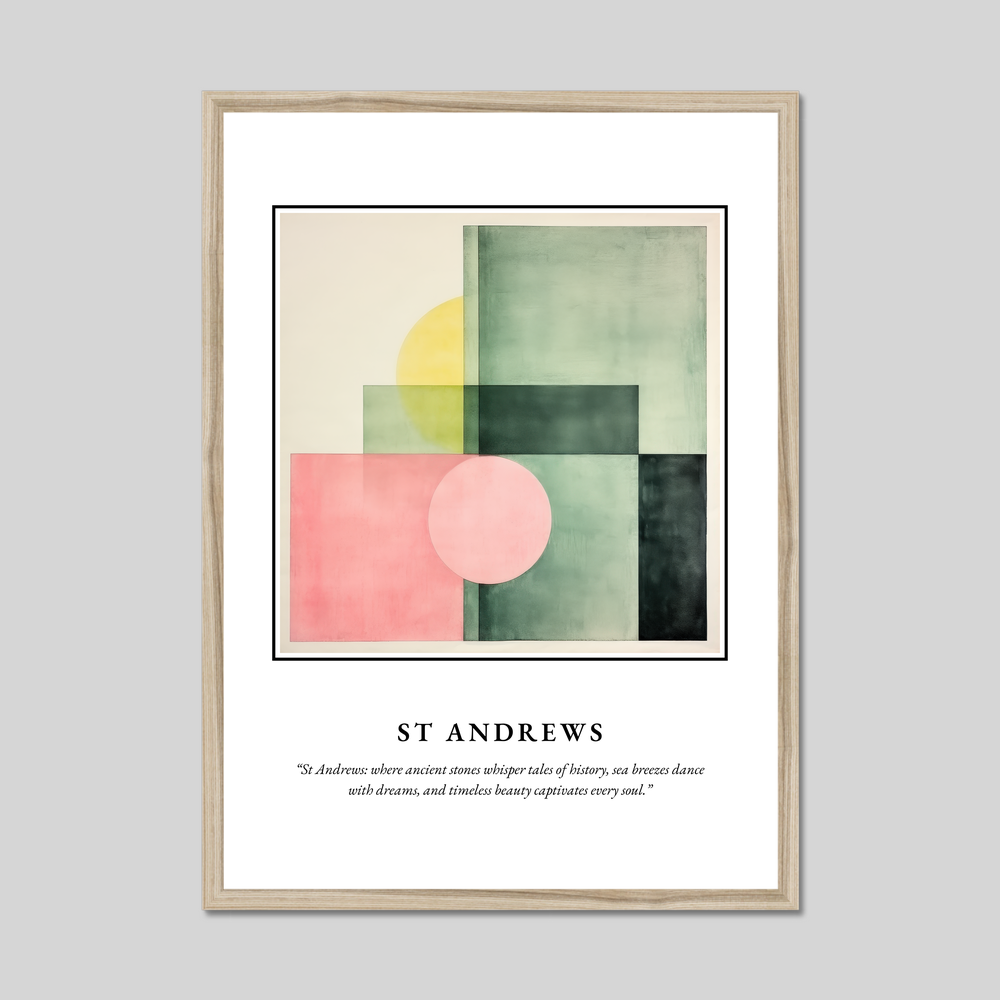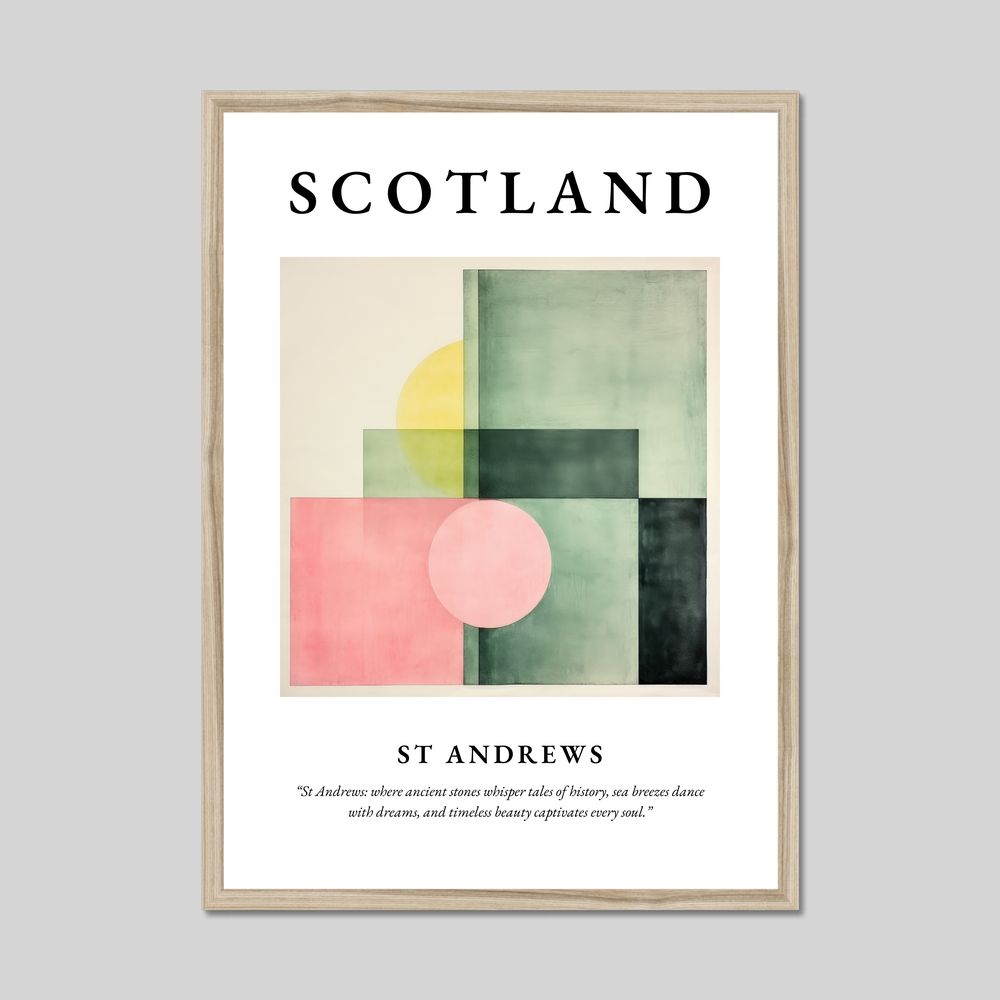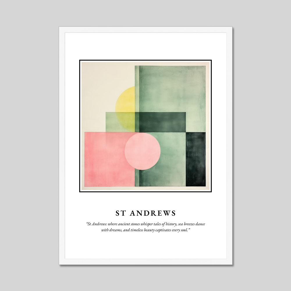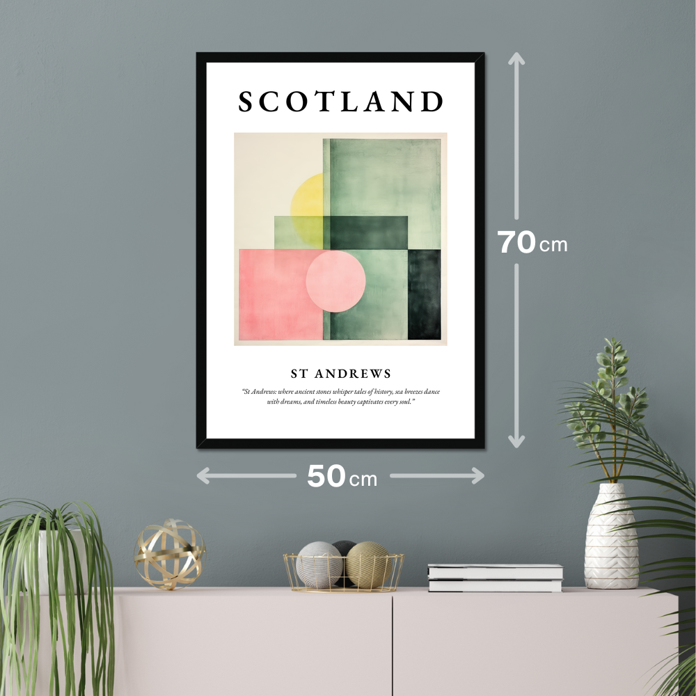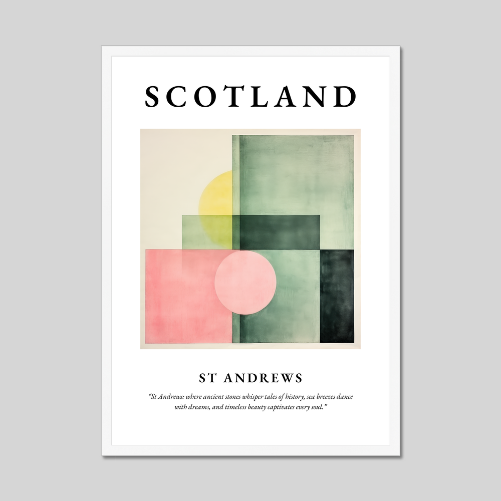 The poster's bold "SCOTLAND" lettering immediately captures attention, leading you into a minimalist masterpiece of St Andrews. The artwork distills the essence of this historic town into sleek shapes and harmonious colours, inviting the viewer to explore the subtleties and elegance of minimalism. Beneath the painting, a poignant quote invites reflection: “St Andrews: where ancient stones whisper tales of history, sea breezes dance with dreams, and timeless beauty captivates every soul.”