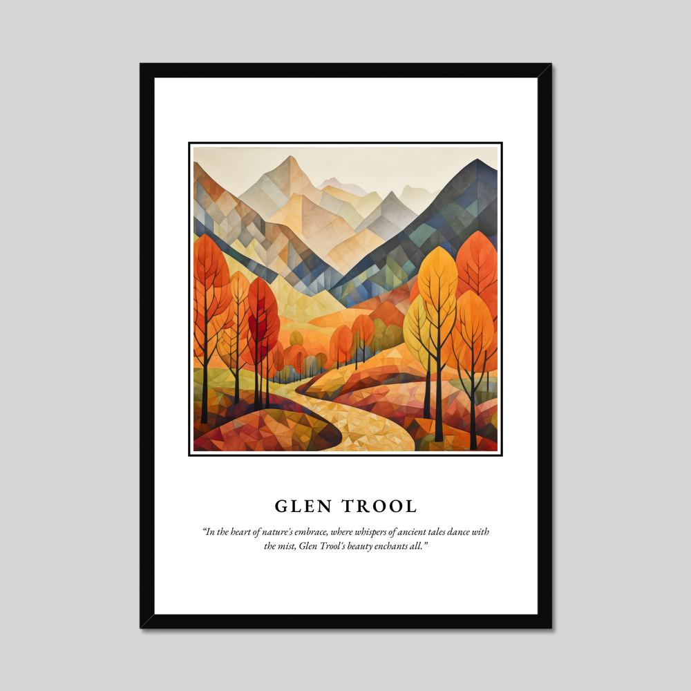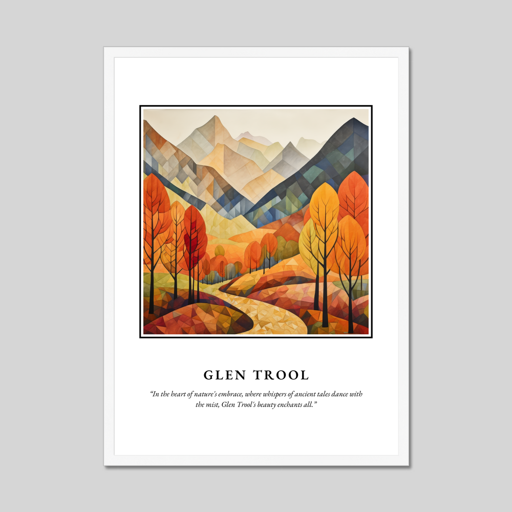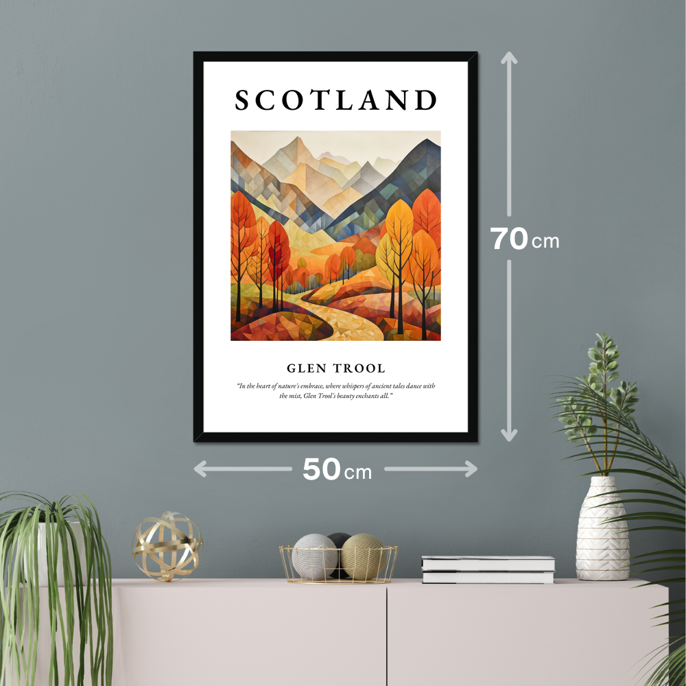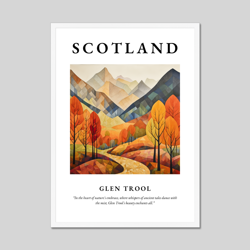 At the heart of this poster lies a captivating depiction of Glen Trool. Its geometric simplicity and bold, warm hues seamlessly evoke the Scottish landscape's tranquil beauty. Above the painting, the word “SCOTLAND” stands proudly in bold lettering, a testament to the rich heritage and timeless allure of this storied land. Below, an elegantly inscribed quote captures the mystical essence of Glen Trool: “In the heart of nature's embrace, where whispers of ancient tales dance with the mist, Glen Trool's beauty enchants all.”