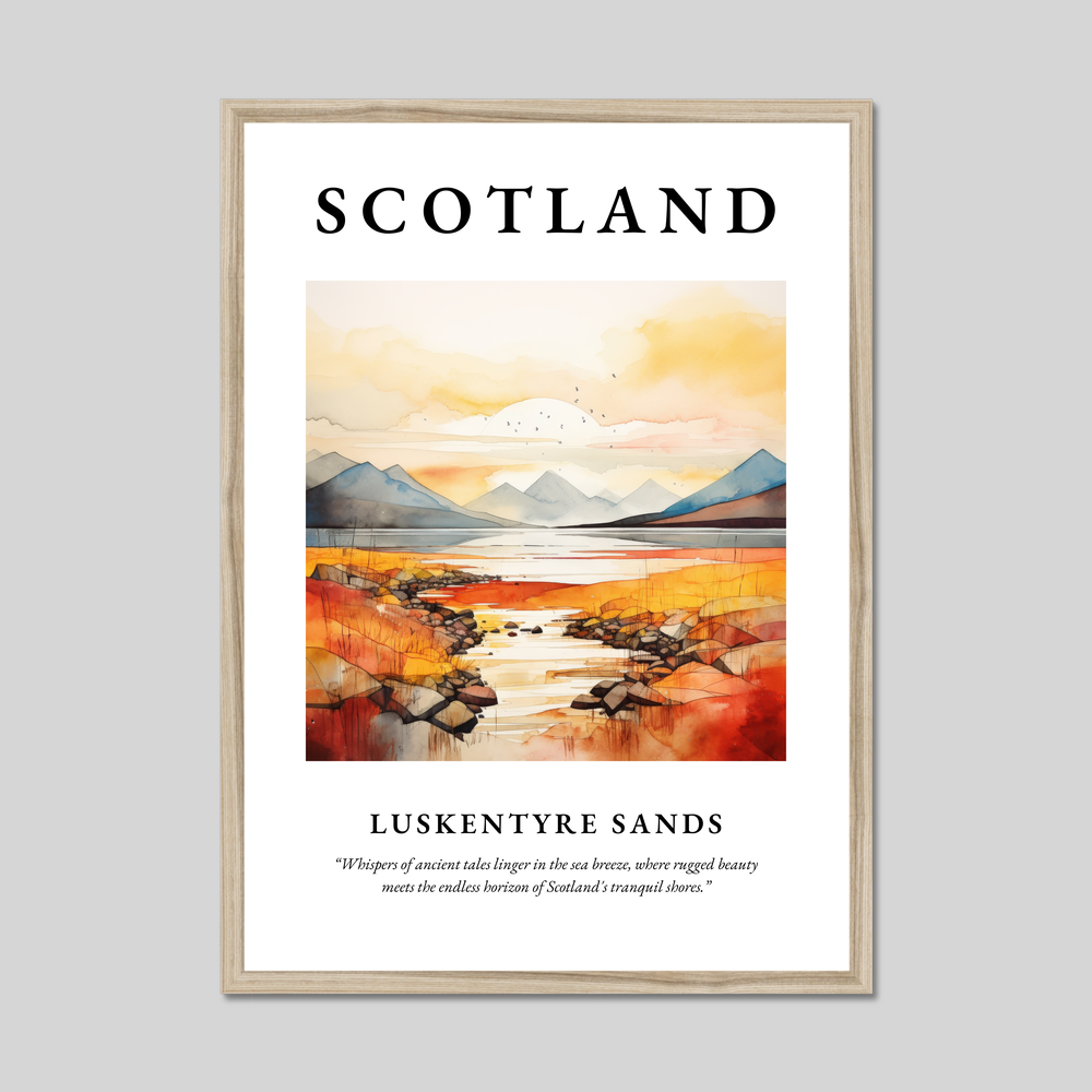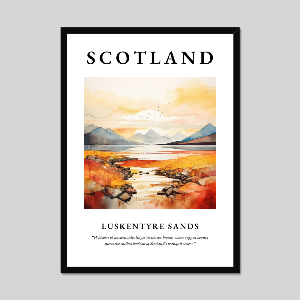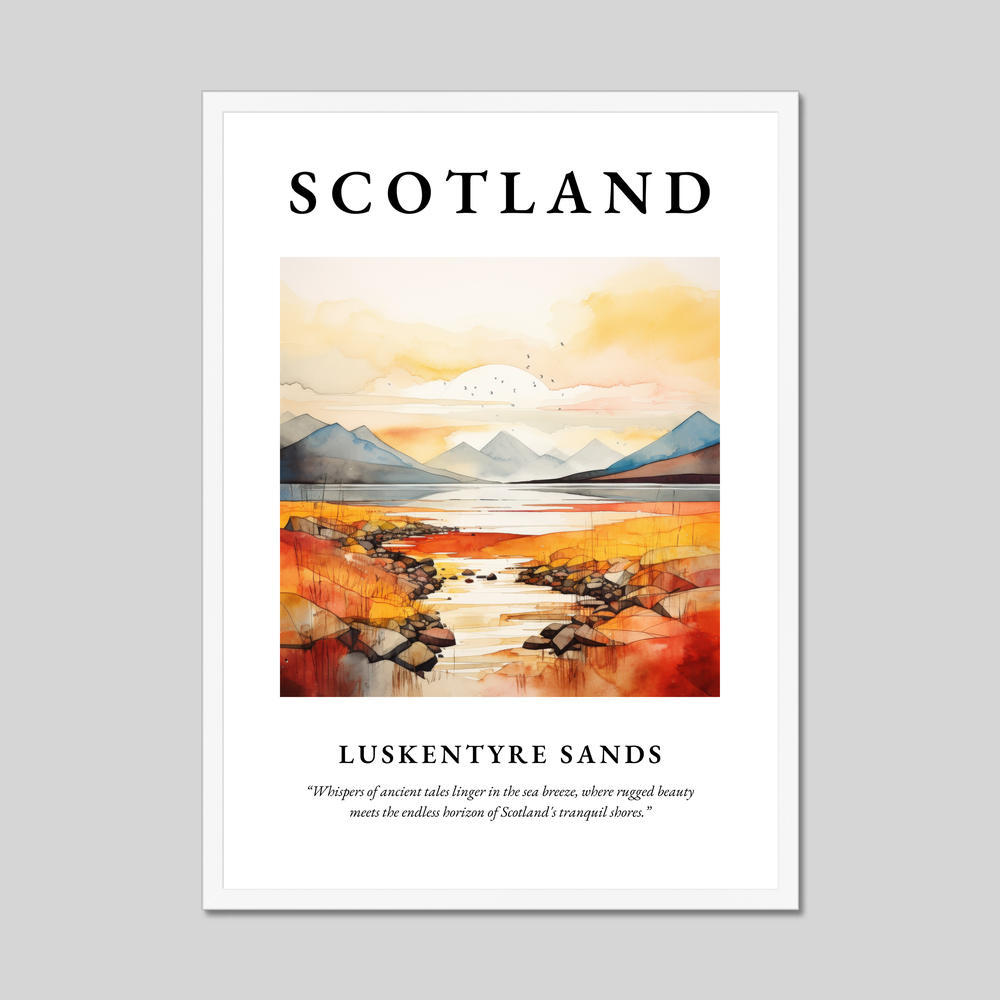This captivating poster begins with the word “SCOTLAND” emblazoned at the top in bold, confident letters. Below, the minimalist painting of Luskentyre Sands beckons with its understated beauty. The harmonious blend of soft, earthy colours and striking contrasts brings the scene to life, inviting you to wander into a world where nature whispers its ancient secrets. Beneath the painting, the quote “Whispers of ancient tales linger in the sea breeze, where rugged beauty meets the endless horizon of Scotland's tranquil shores” perfectly encapsulates the magic of this enchanting location.