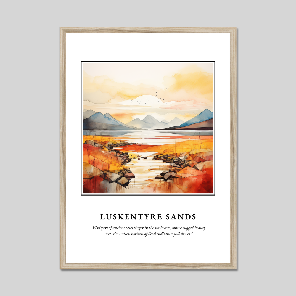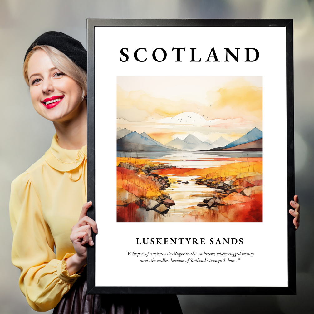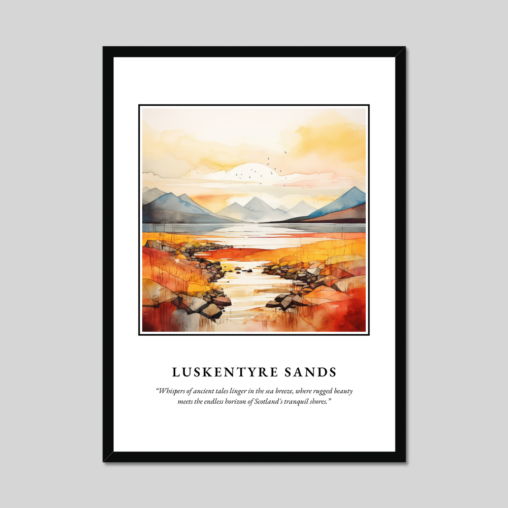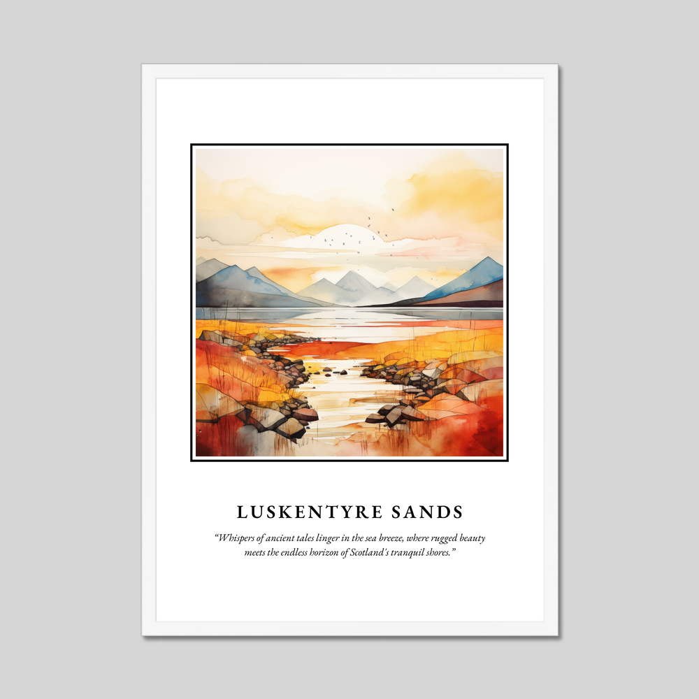 This captivating poster begins with the word “SCOTLAND” emblazoned at the top in bold, confident letters. Below, the minimalist painting of Luskentyre Sands beckons with its understated beauty. The harmonious blend of soft, earthy colours and striking contrasts brings the scene to life, inviting you to wander into a world where nature whispers its ancient secrets. Beneath the painting, the quote “Whispers of ancient tales linger in the sea breeze, where rugged beauty meets the endless horizon of Scotland's tranquil shores” perfectly encapsulates the magic of this enchanting location.