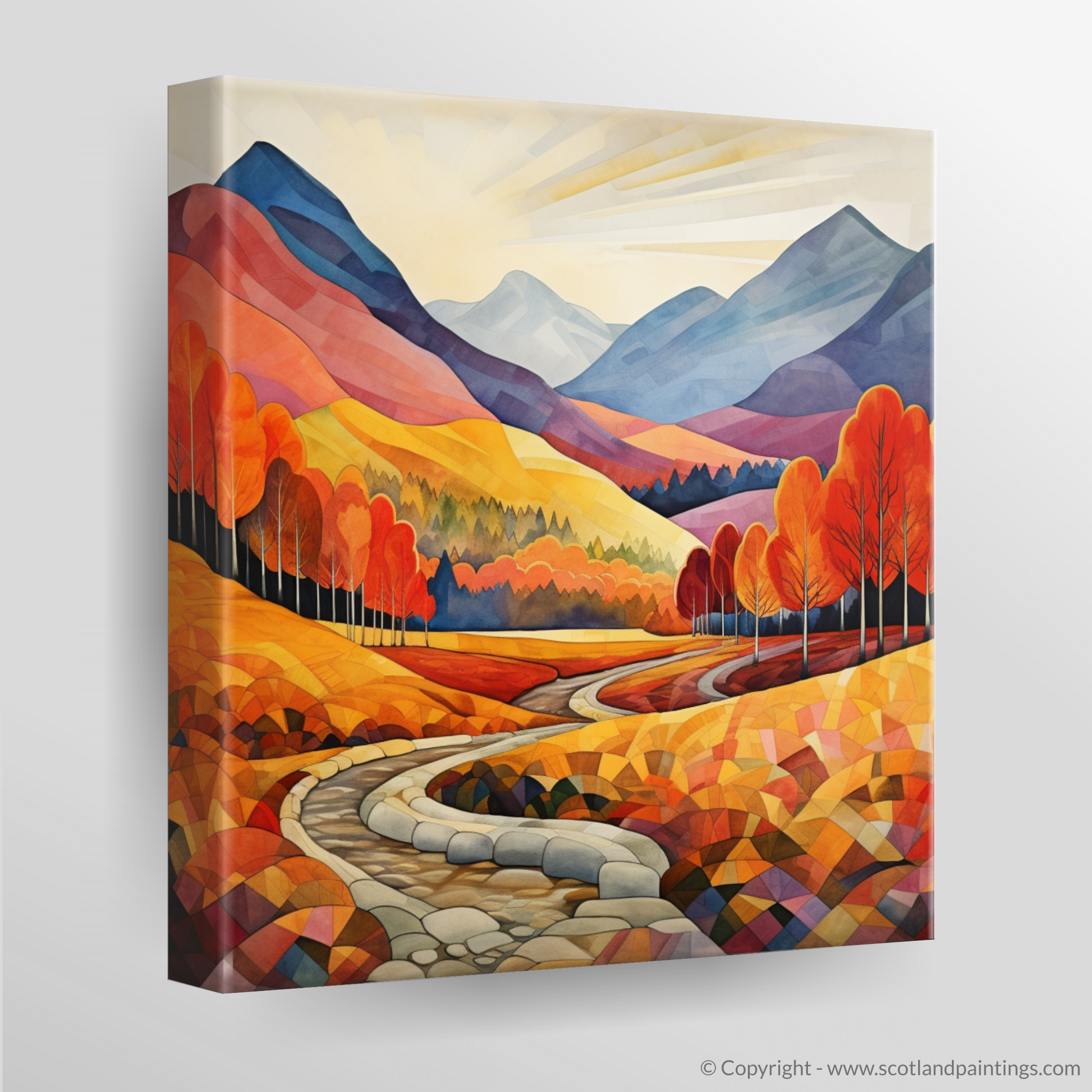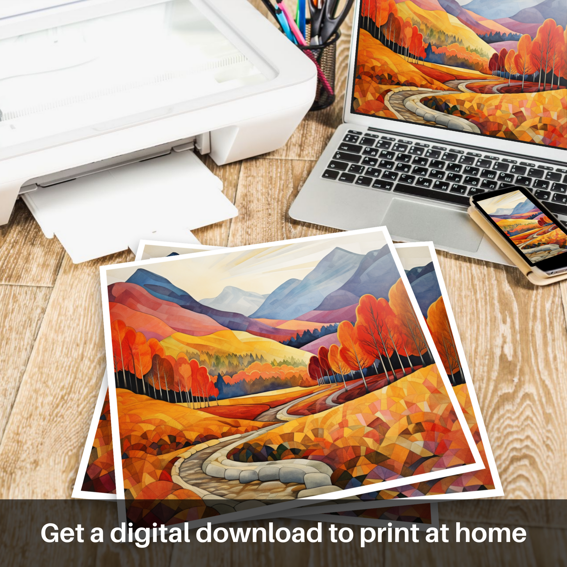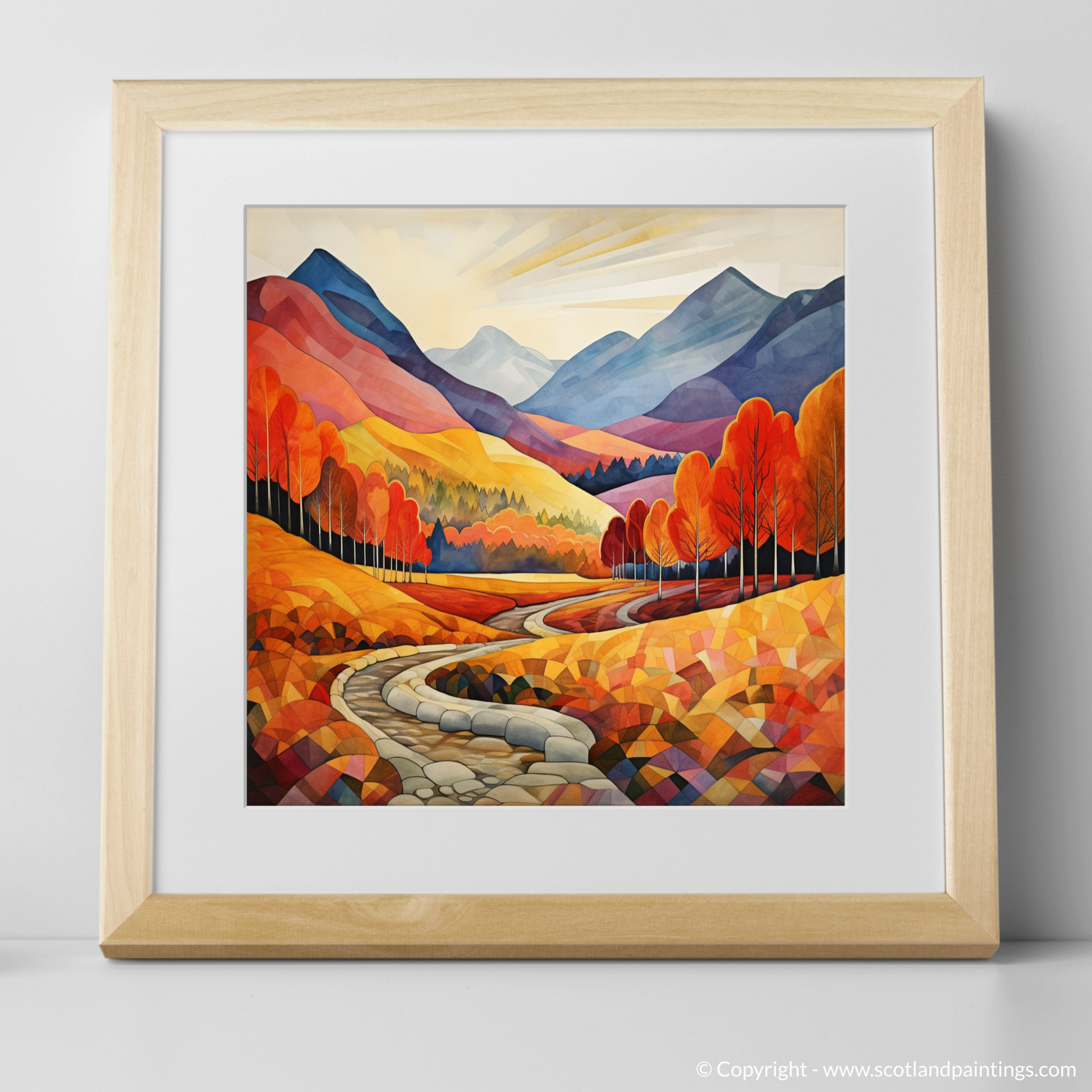 Immerse yourself in the simplicity of nature with this exquisitely minimalistic interpretation of Glen Shiel. The essence of serene Scottish landscapes is distilled into an unrestrained composition, where each sweep and curve invites viewers into a world where form and colour harmonise. The inviting scene captures a winding path that meanders through a patchwork of burnished oranges and profound golds, a homage to the mellow hues of autumn.