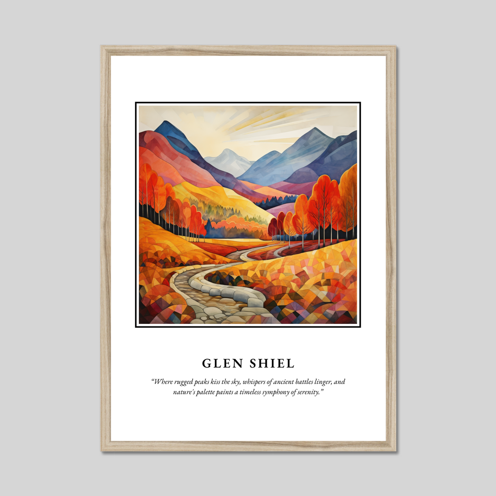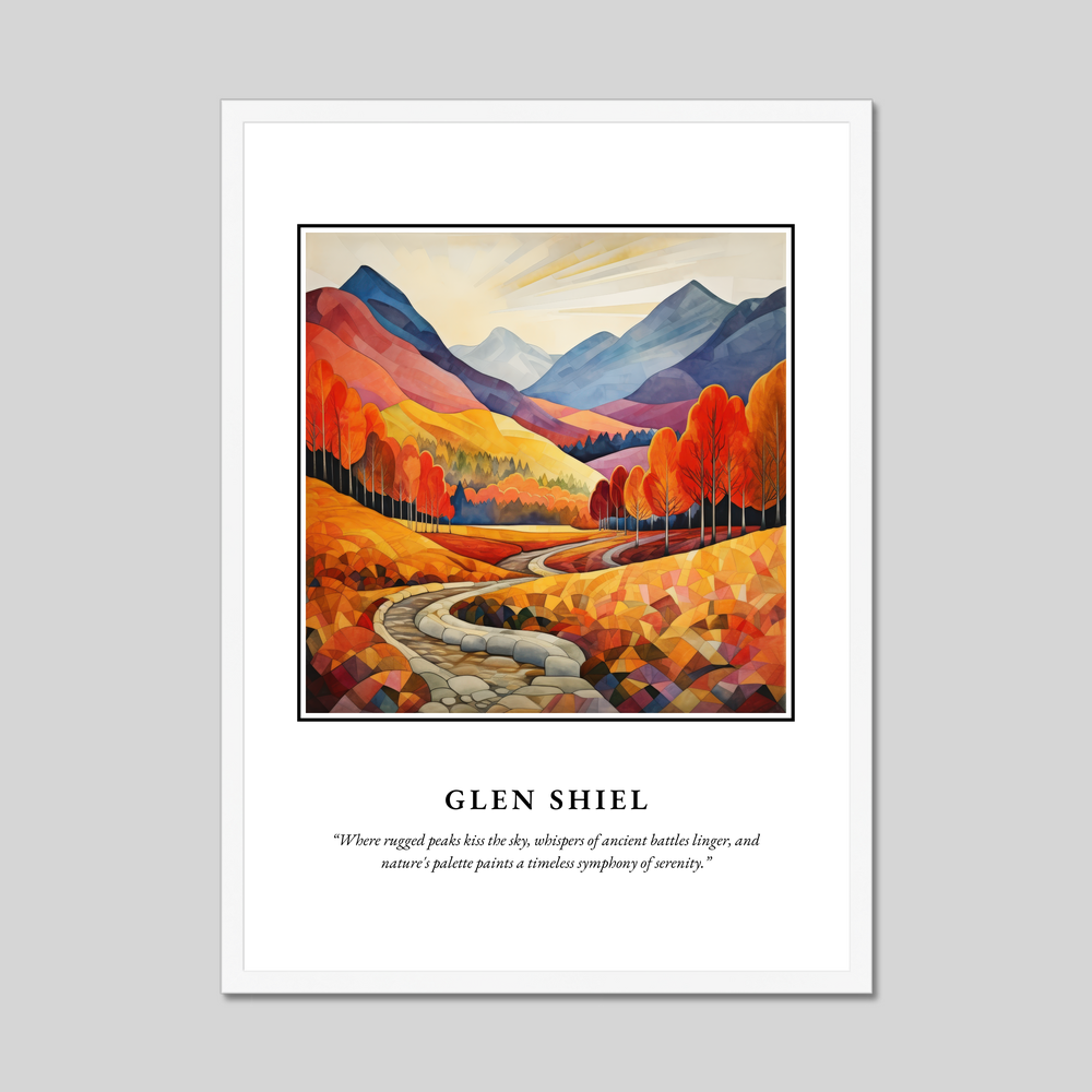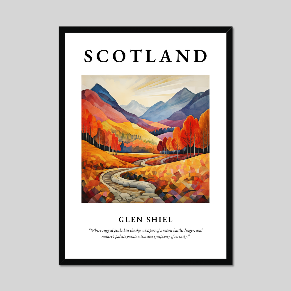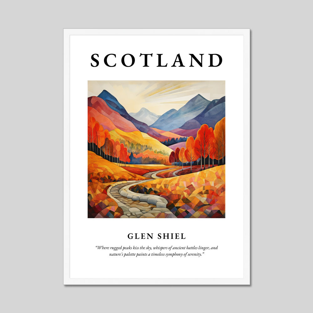 Glen Shiel, nestled in the heart of the Scottish Highlands, is renowned for its breathtaking vistas and historical significance. Known for its dramatic mountain ranges and tranquil valleys, it is a place where nature's beauty and history harmonise. The Battle of Glen Shiel, fought in 1719, echoes through the rugged terrain, making this location steeped in stories of the past. The minimalist painting in the poster captures this essence, with its smooth lines and muted tones reflecting the tranquil yet resilient spirit of the Highlands.