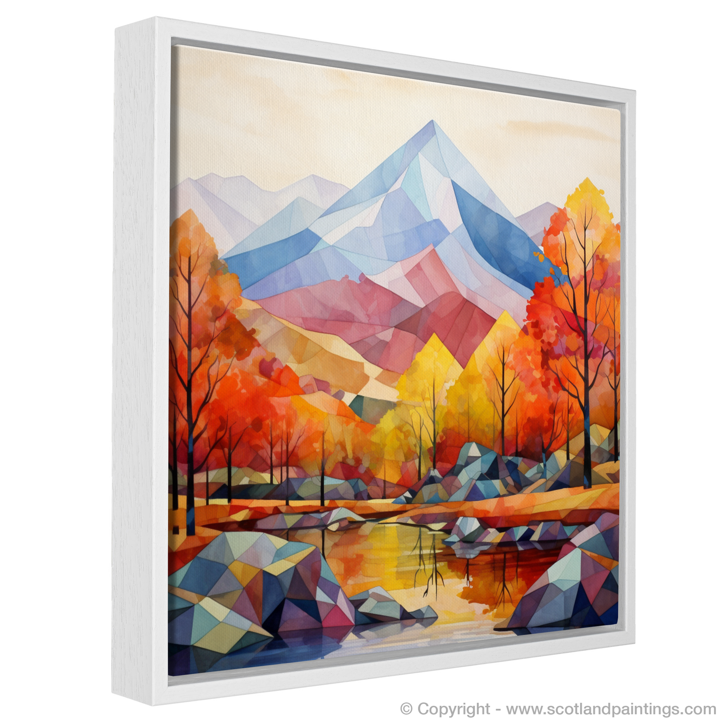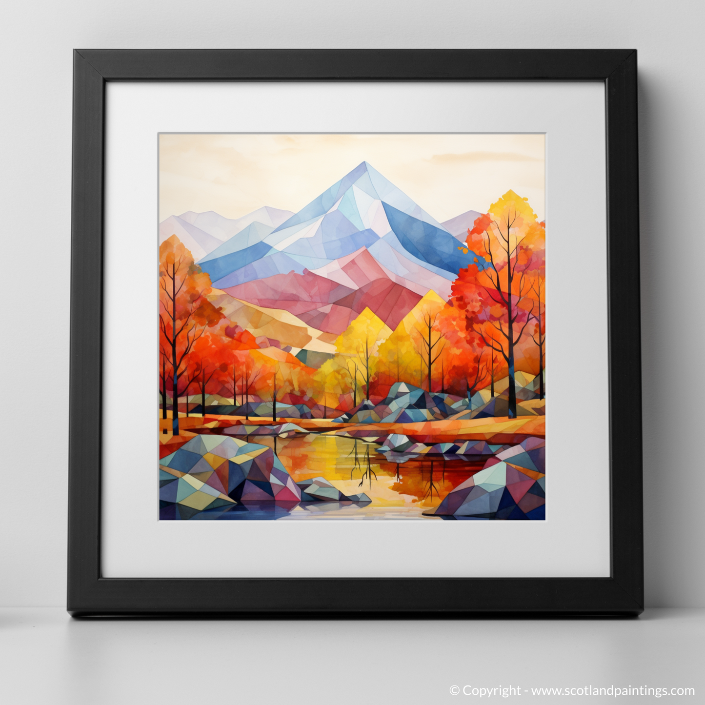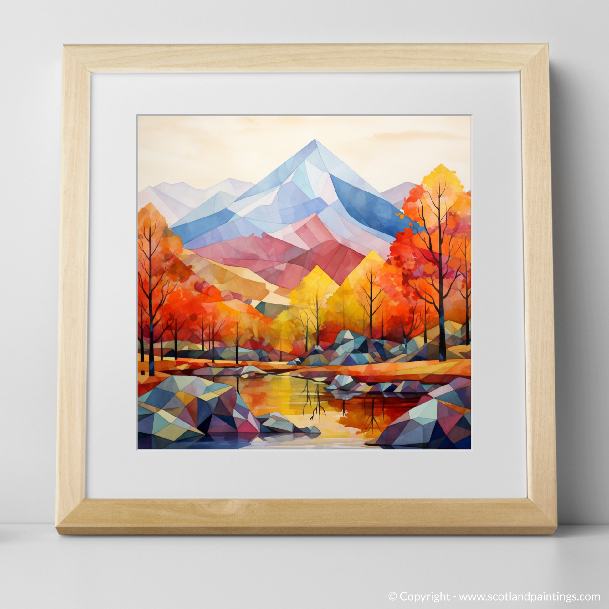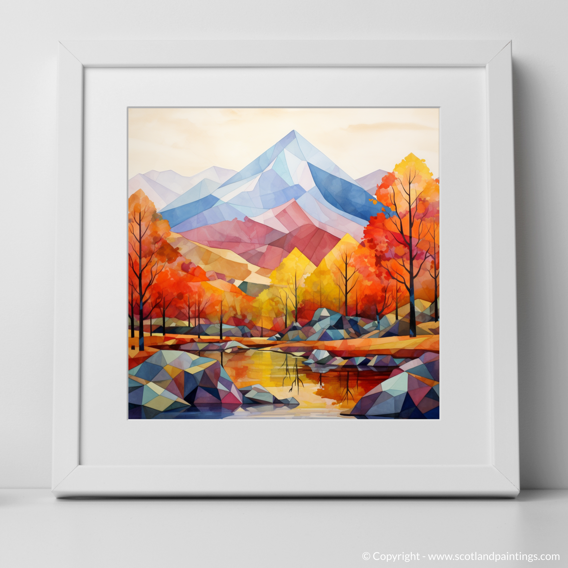 Embrace the distilled beauty of nature with this striking minimalist interpretation of Ben Nevis. The visual representation captures the essence of the UK's highest peak through a symphony of geometric shapes and a palette that flirts with both the autumnal and the frozen. Steeped in a blend of warm crimson, russet, and gold, the foliage around the base of the mountain is set ablaze against the cooler, serene blues and purples that dance their way up the rugged peak, creating an arresting contrast representing the mountain's diverse climate.