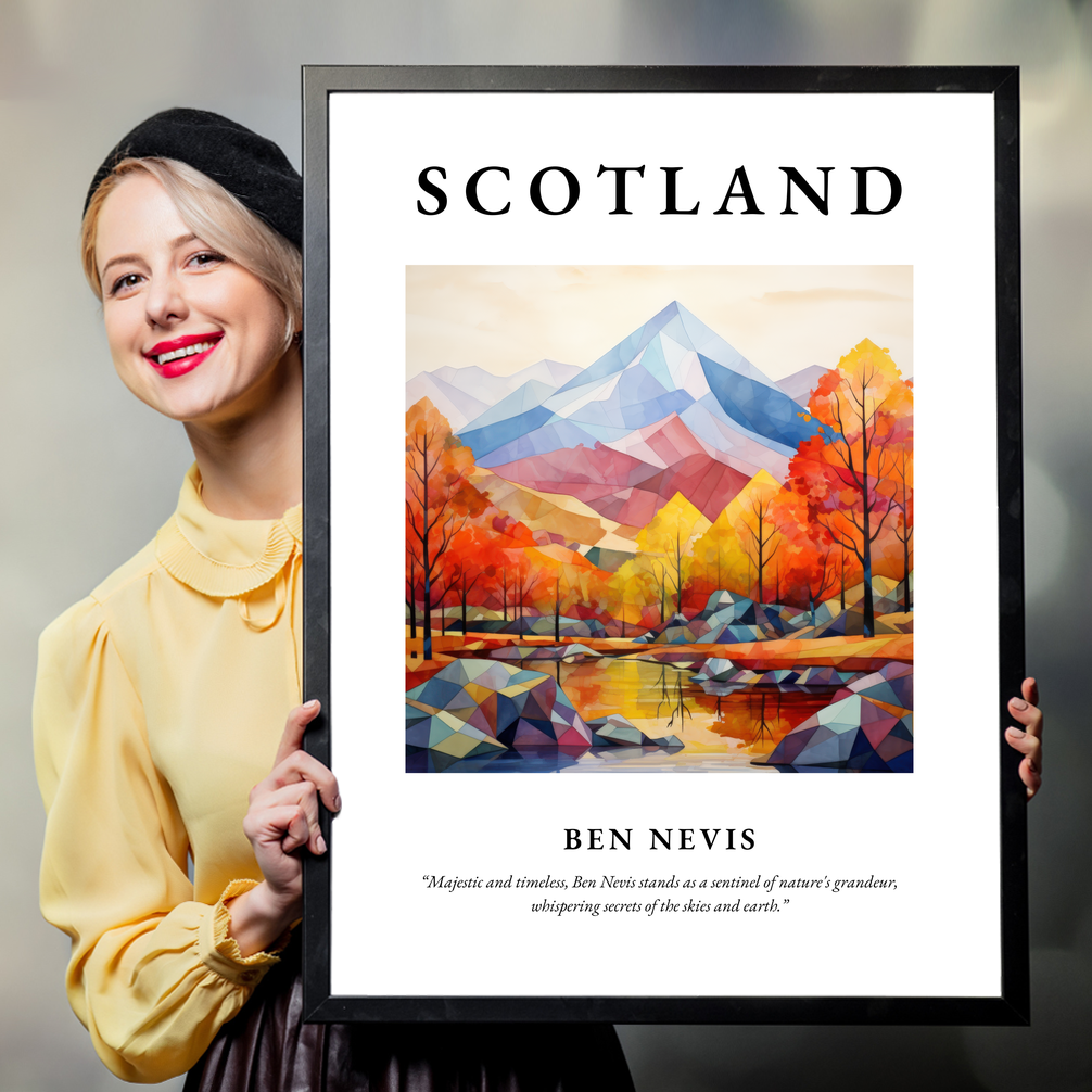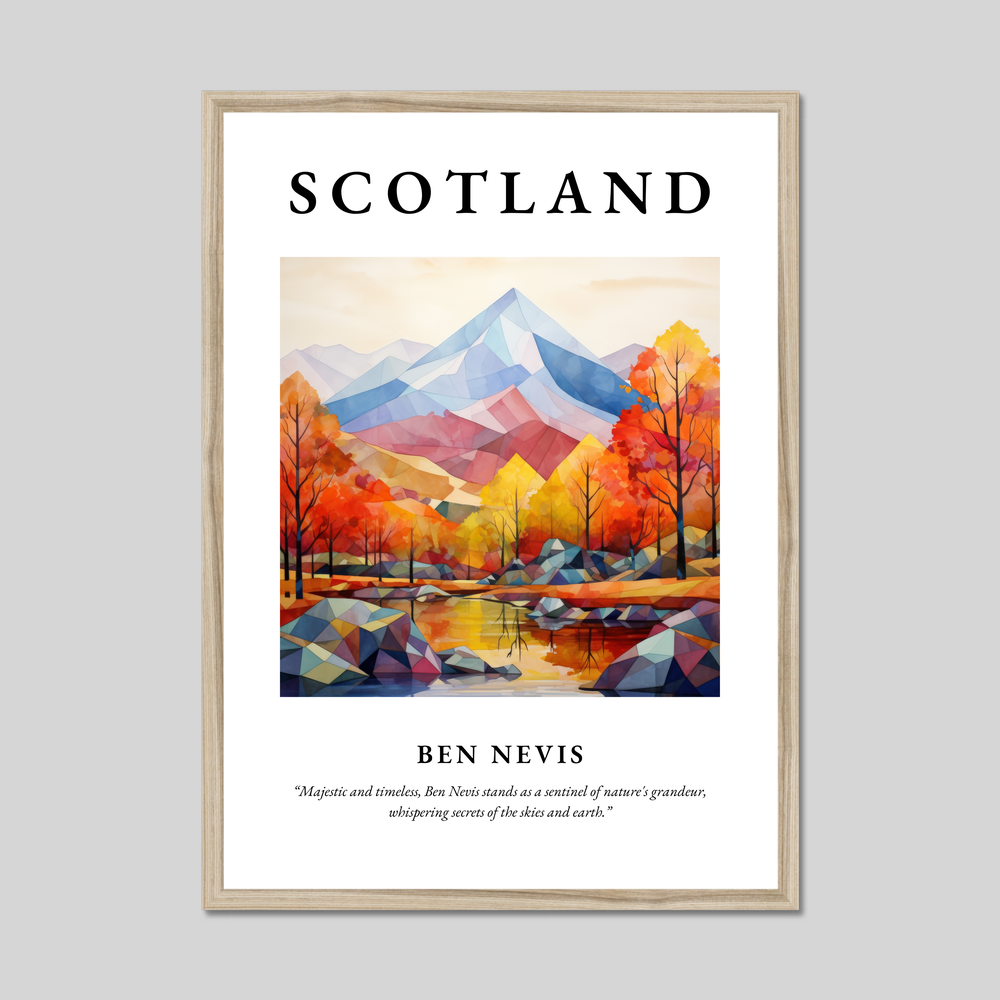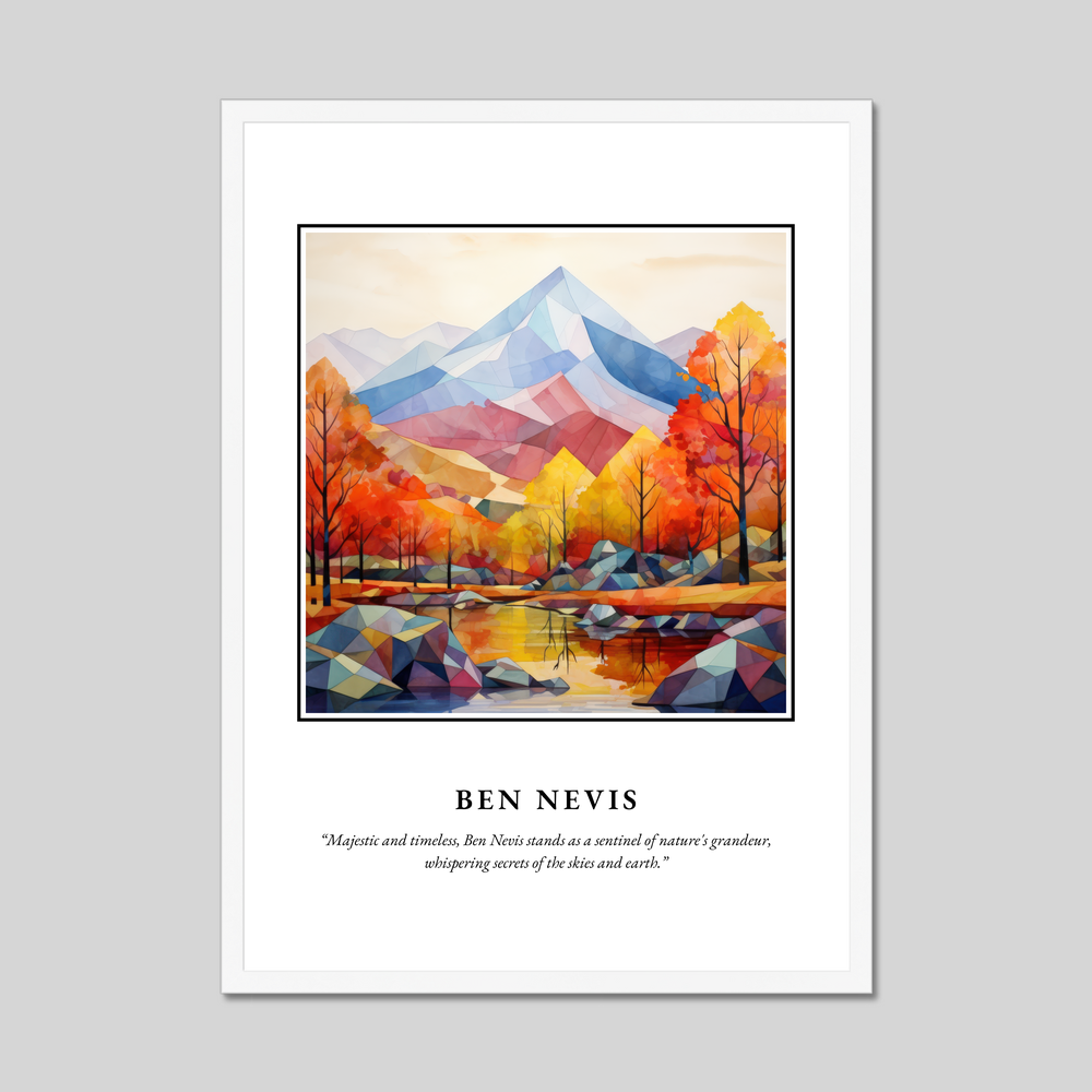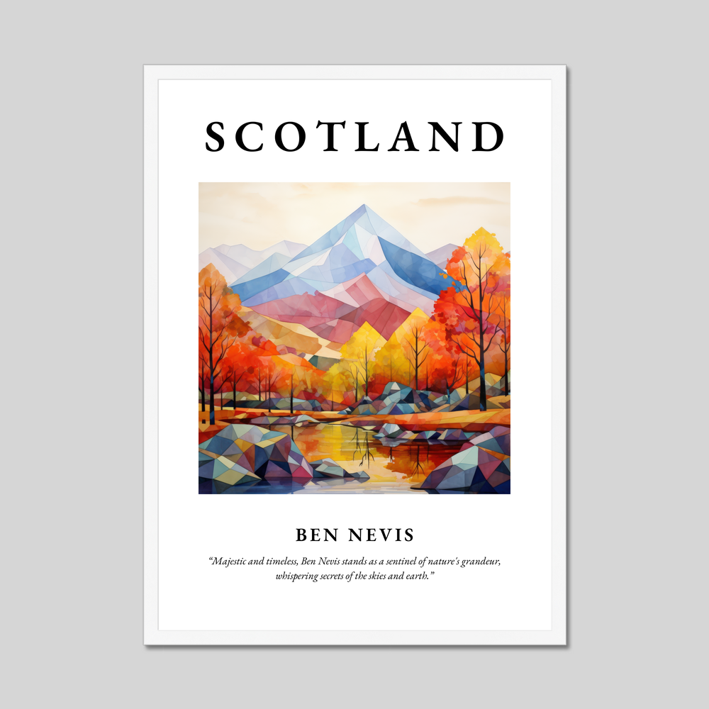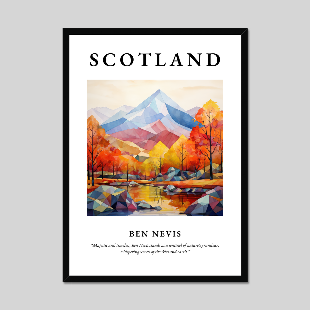Available in black, white, or a natural wood-effect frame, this minimalist artwork beautifully highlights the breathtaking silhouette of Ben Nevis. The simplicity and elegance of the minimalism style bring a contemporary touch, allowing the vibrant hues of autumnal trees and reflective waters to create a striking composition. Above this serene depiction, “SCOTLAND” stands proudly in bold lettering, while beneath, the quote “Majestic and timeless, Ben Nevis stands as a sentinel of nature's grandeur, whispering secrets of the skies and earth,” invites contemplation and admiration.