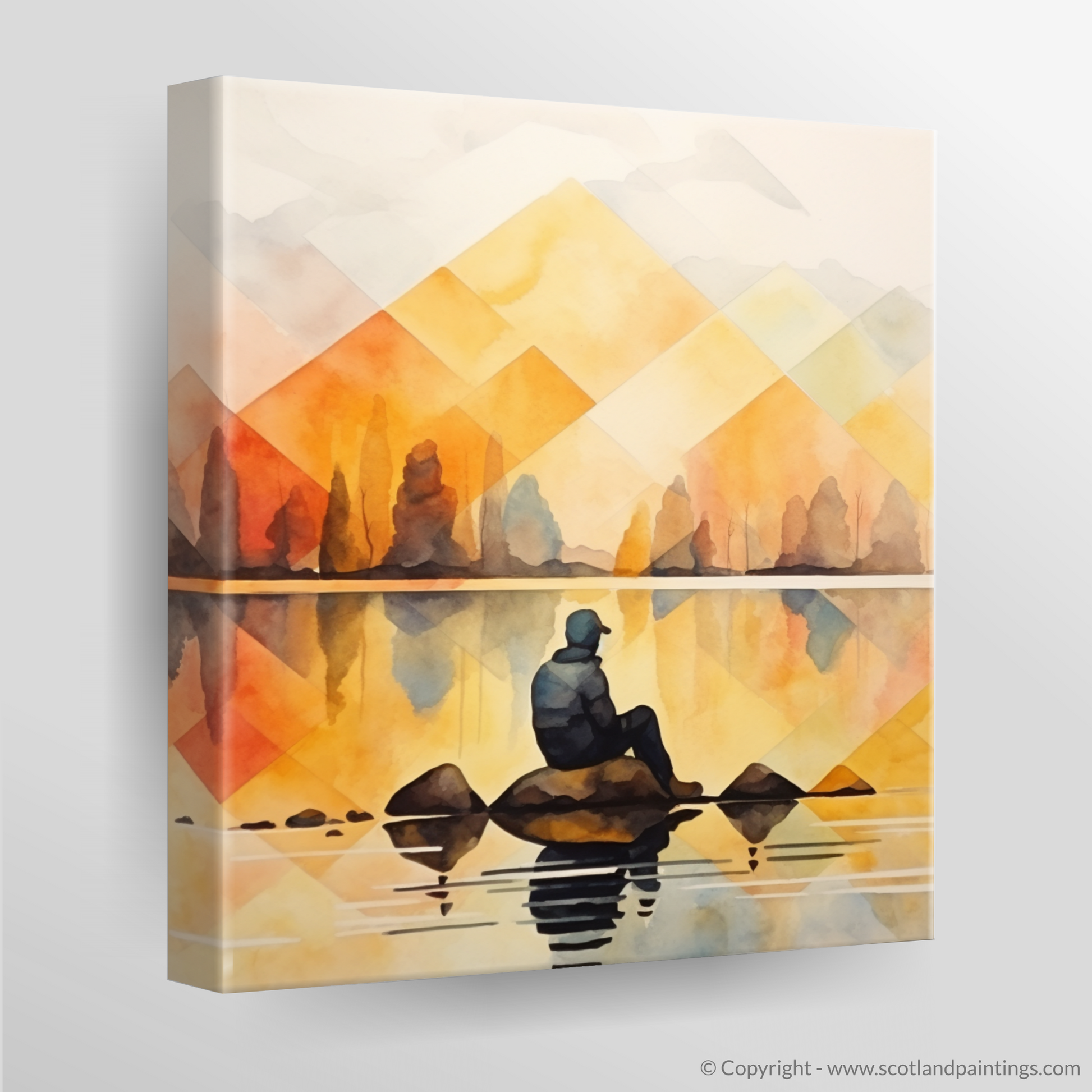 The backdrop is a masterclass in minimalist artistry, with geometric shapes layering shades of warm amber, delicate yellow, and soft blues to suggest the majestic mountains for which Loch Lomond is renowned. This geometric abstraction gives way to the water's edge, where the mirrored image dips into the loch, creating a reflection that speaks of the quietude of early morning or the gentle hush of dusk.