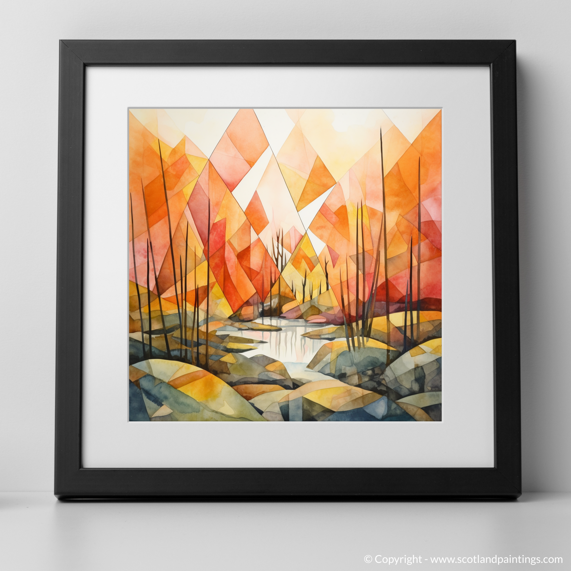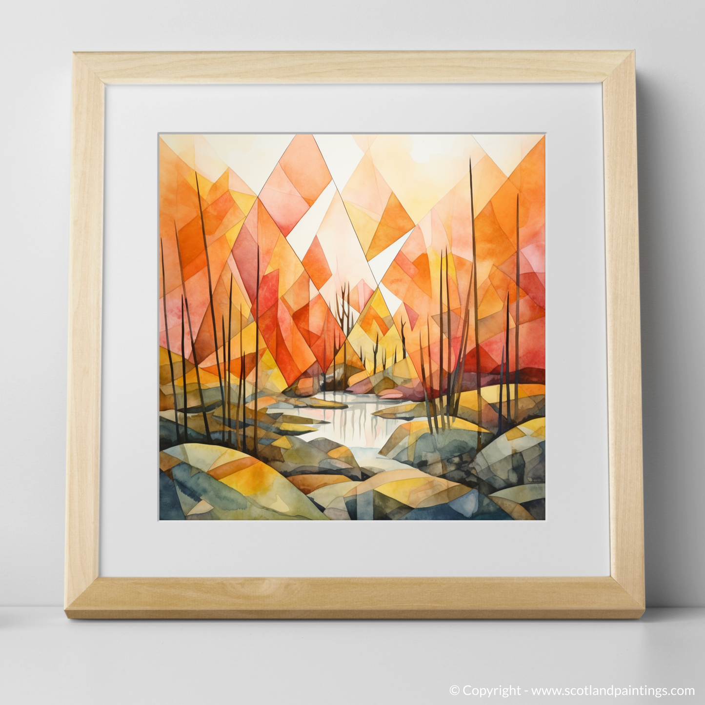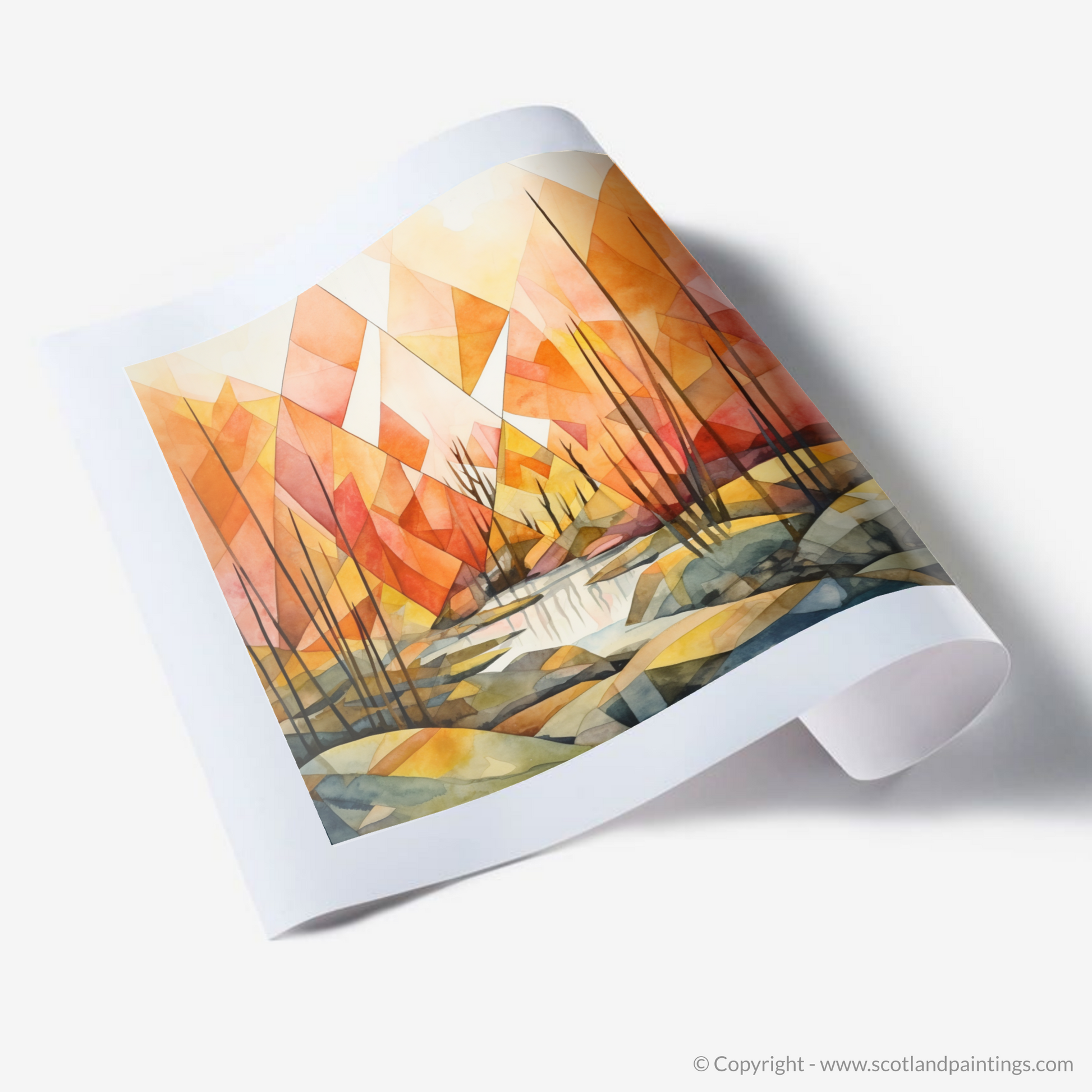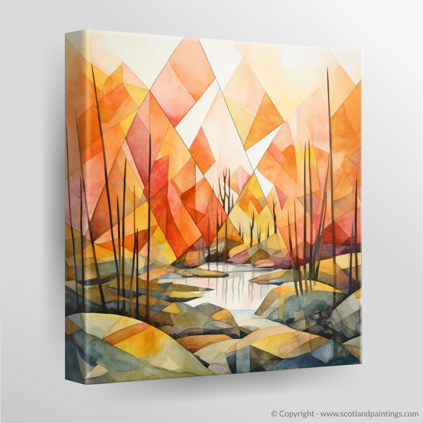 Immerse yourself in the serene beauty of Glen Moriston, brought to life through bold minimalism on canvas. This stunning print captures the essence of the highland landscape through a symphony of geometric forms and a warm, earthy palette. Delicate washes of colour blend seamlessly, evoking the soft light of dawn as it kisses the rugged terrain. Burnt oranges and fiery reds suggest the heather-clad hills that are synonymous with this part of the Scottish Highlands, while the cool blues and greys gently whisper of the meandering river that carves its way through the valley.