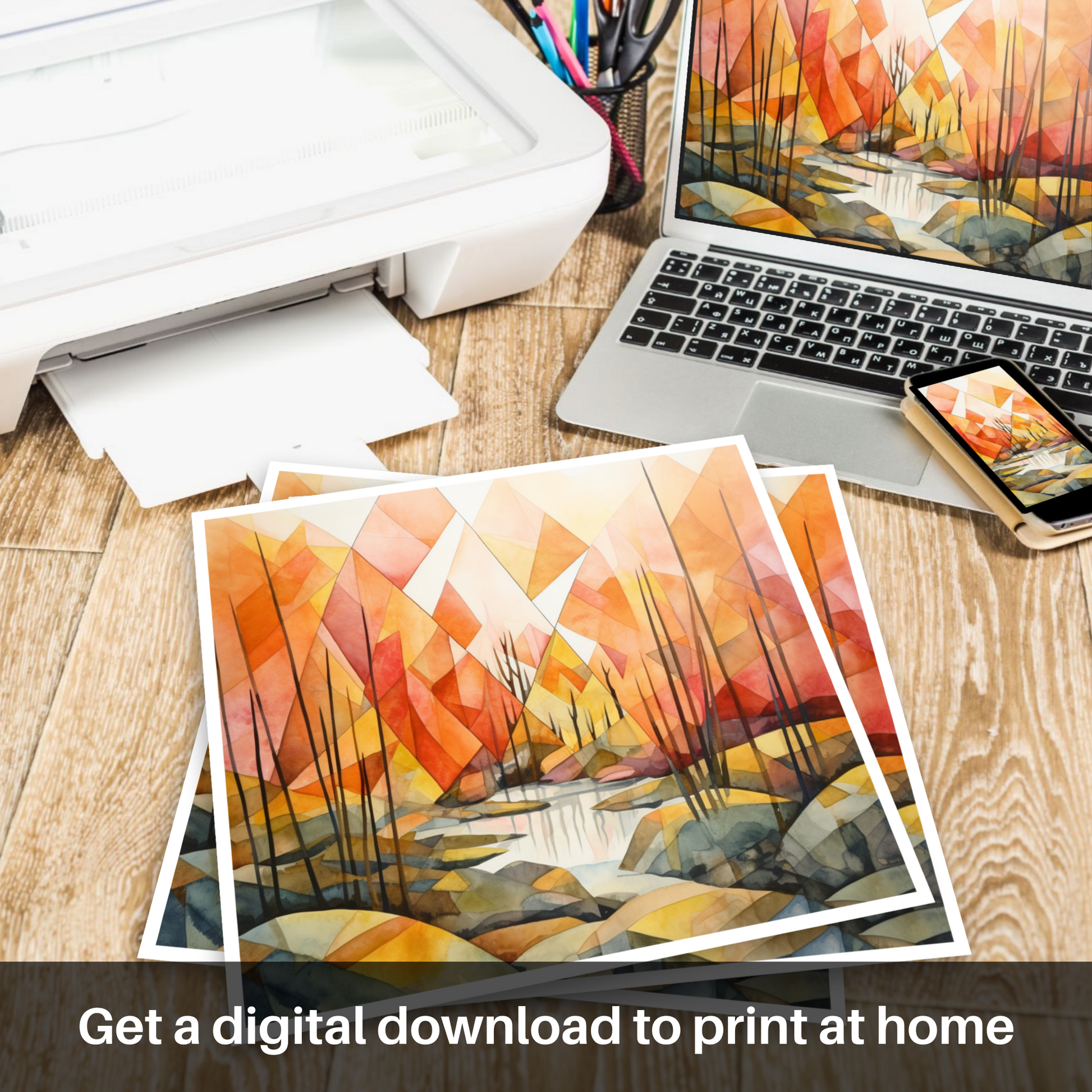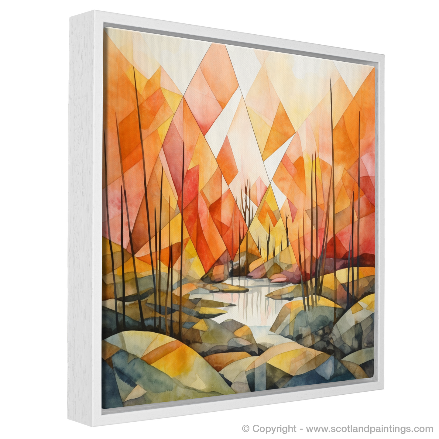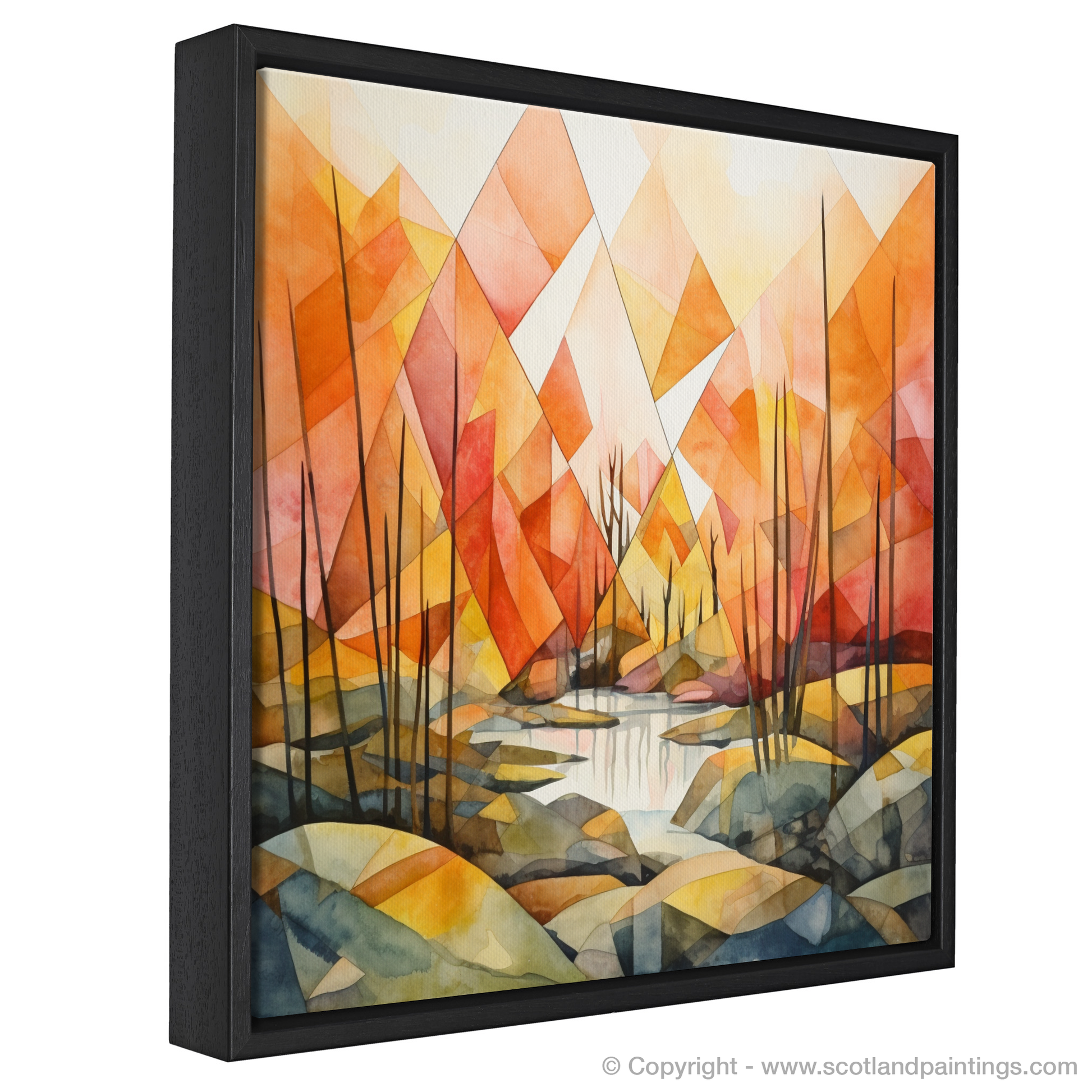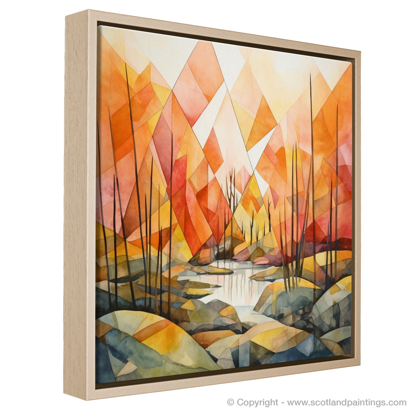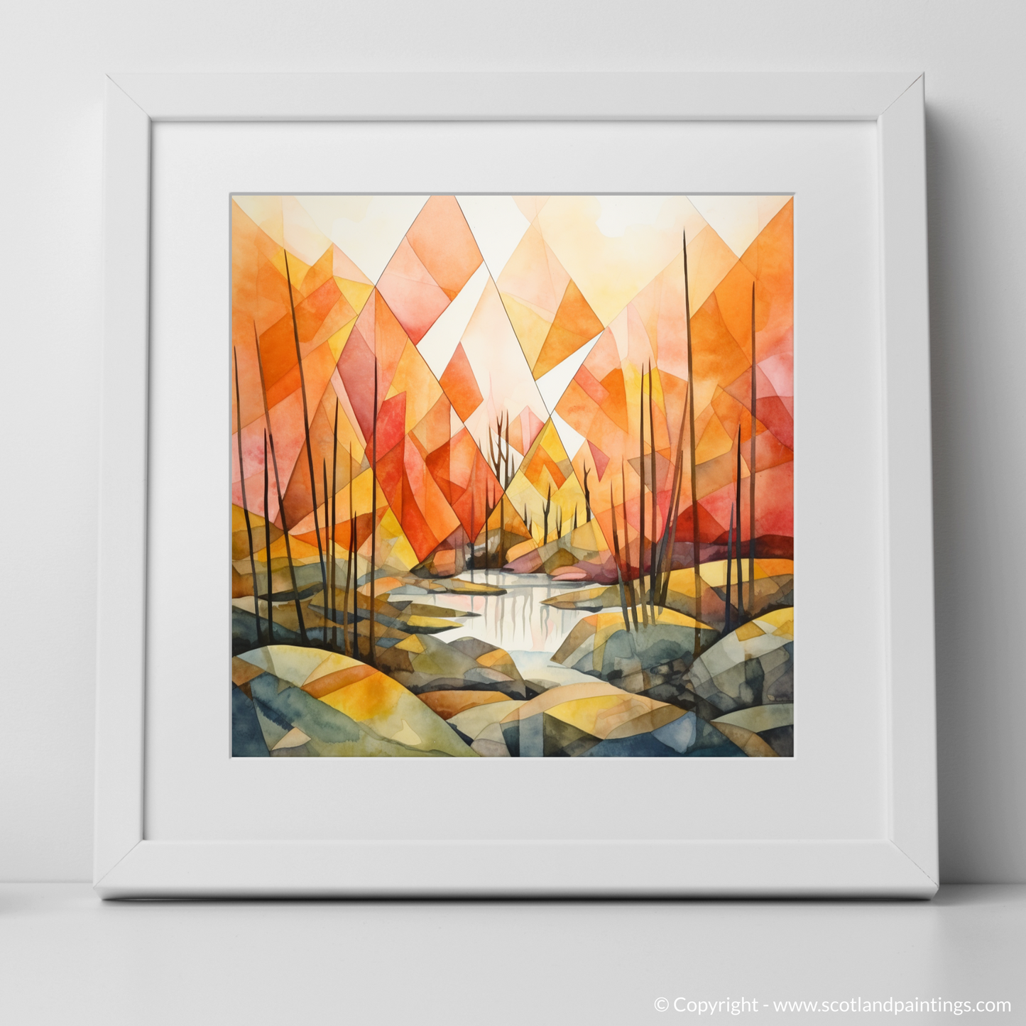 Immerse yourself in the serene beauty of Glen Moriston, brought to life through bold minimalism on canvas. This stunning print captures the essence of the highland landscape through a symphony of geometric forms and a warm, earthy palette. Delicate washes of colour blend seamlessly, evoking the soft light of dawn as it kisses the rugged terrain. Burnt oranges and fiery reds suggest the heather-clad hills that are synonymous with this part of the Scottish Highlands, while the cool blues and greys gently whisper of the meandering river that carves its way through the valley.