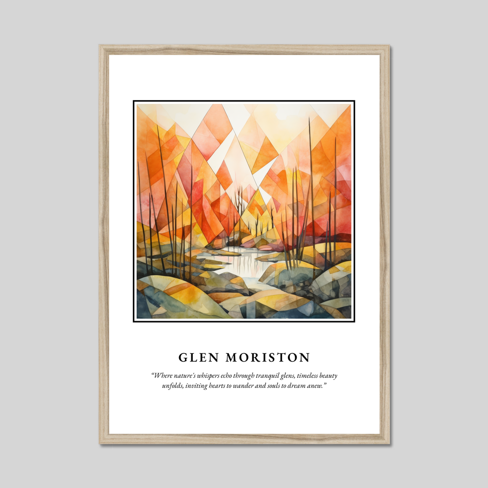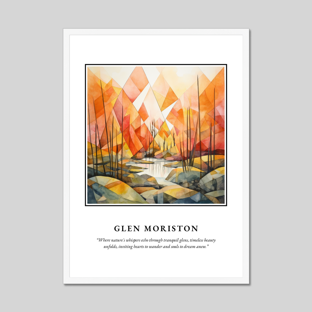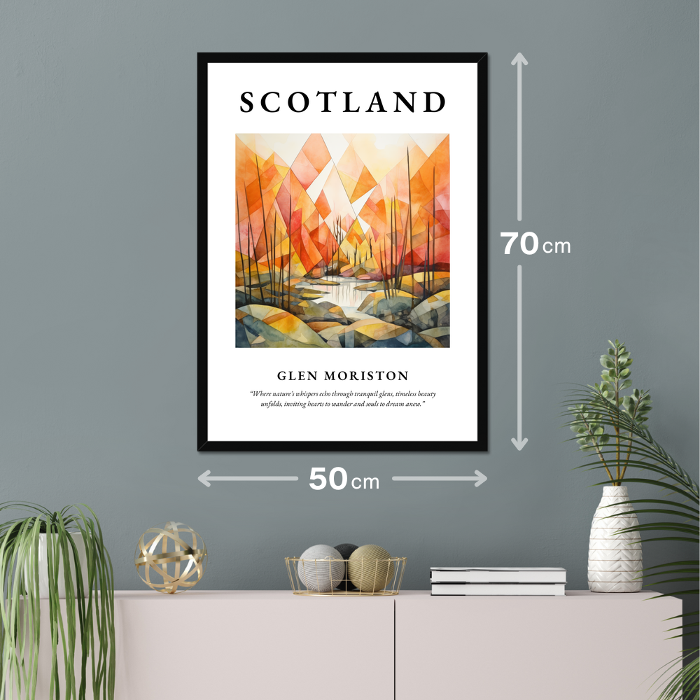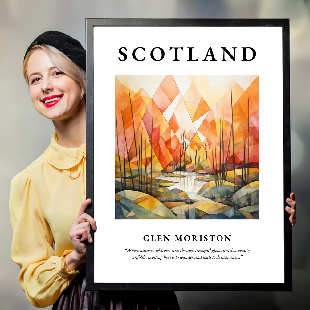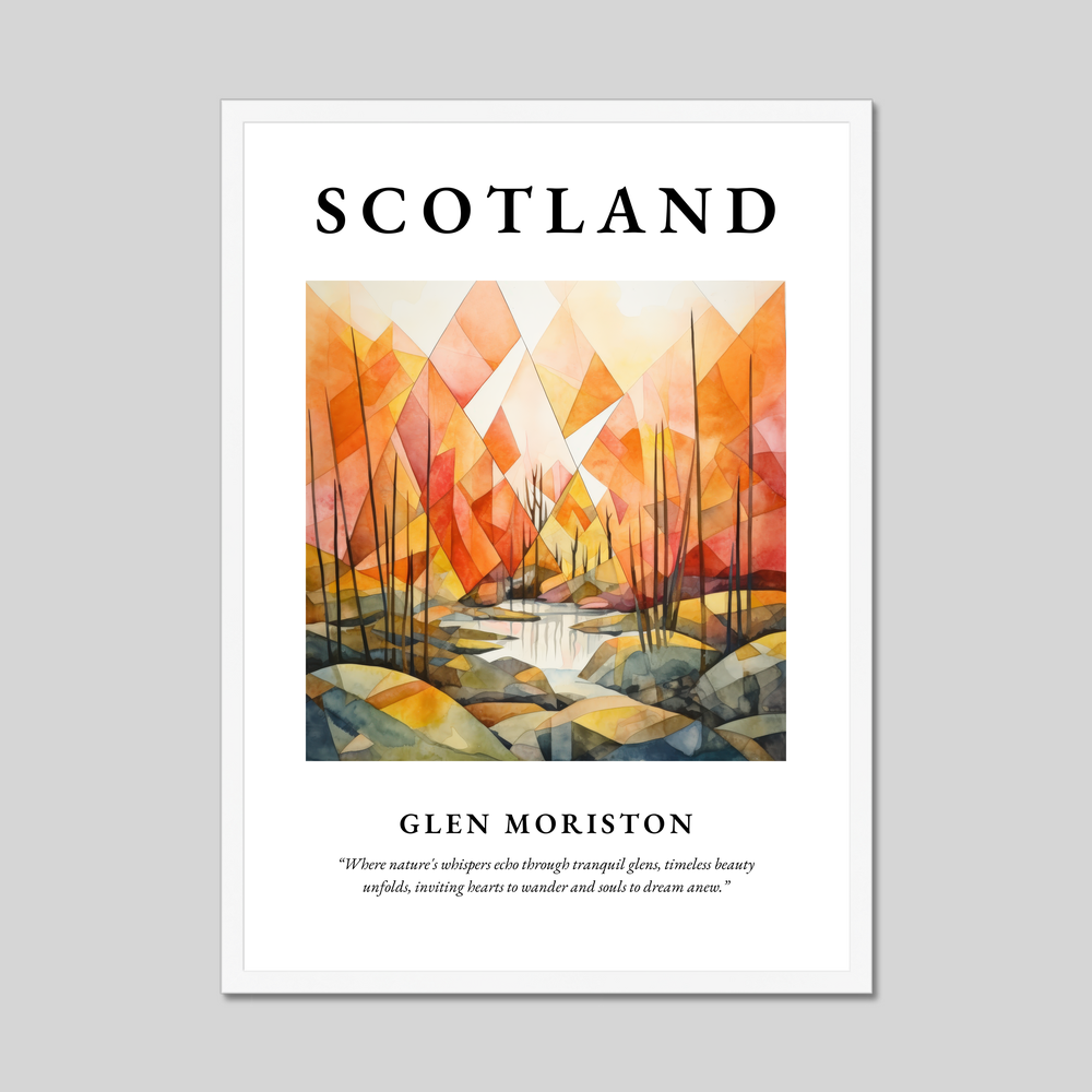 At the top, "SCOTLAND" is emblazoned in bold, commanding your attention as it introduces a world of serene wonder. Below lies a captivating painting of Glen Moriston rendered in a minimalism style. The composition breathes life through a symphony of serene hues and geometric forms, capturing the subtle whispers of nature that echo through Glen Moriston's tranquil landscape. Beneath the painting, a poetic quote invites reflection: “Where nature's whispers echo through tranquil glens, timeless beauty unfolds, inviting hearts to wander and souls to dream anew.”