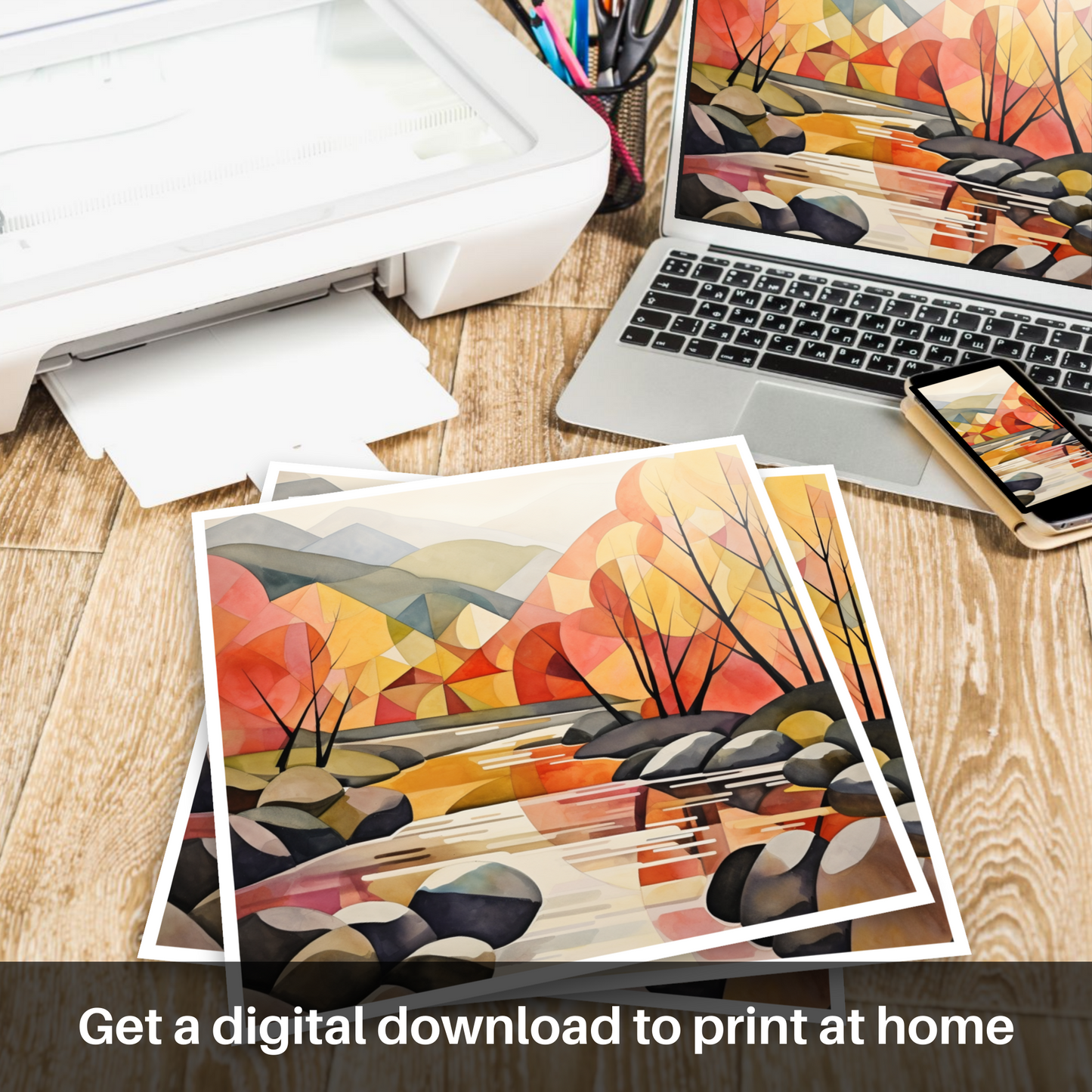Capturing the serene essence of River Tummel, this captivating print is a symphony of geometrical elegance and understated colour. The artwork presents a distinctive interpretation of the Scottish landscape, where simplicity and sophistication converge to create a unique visual experience.