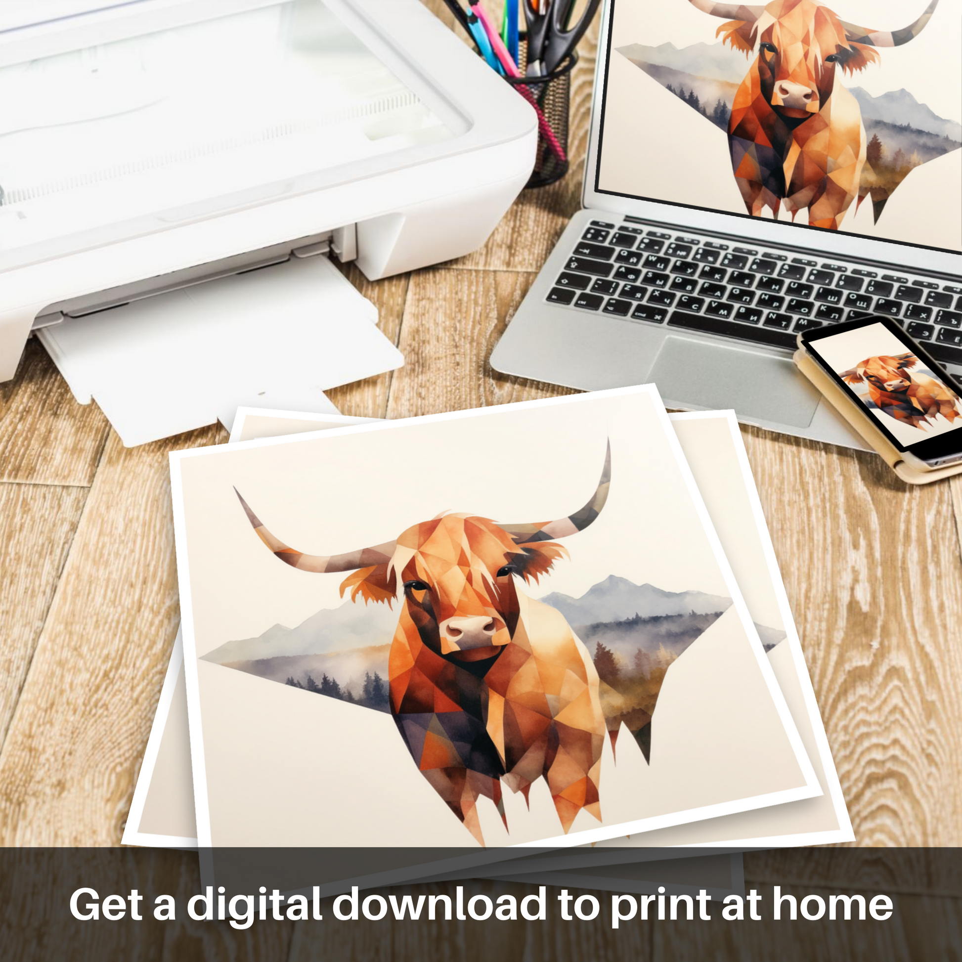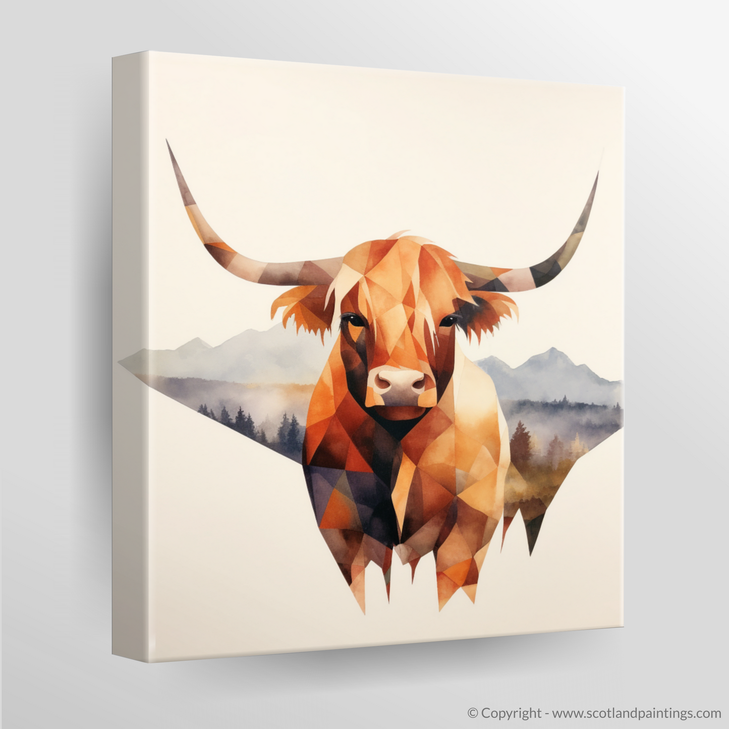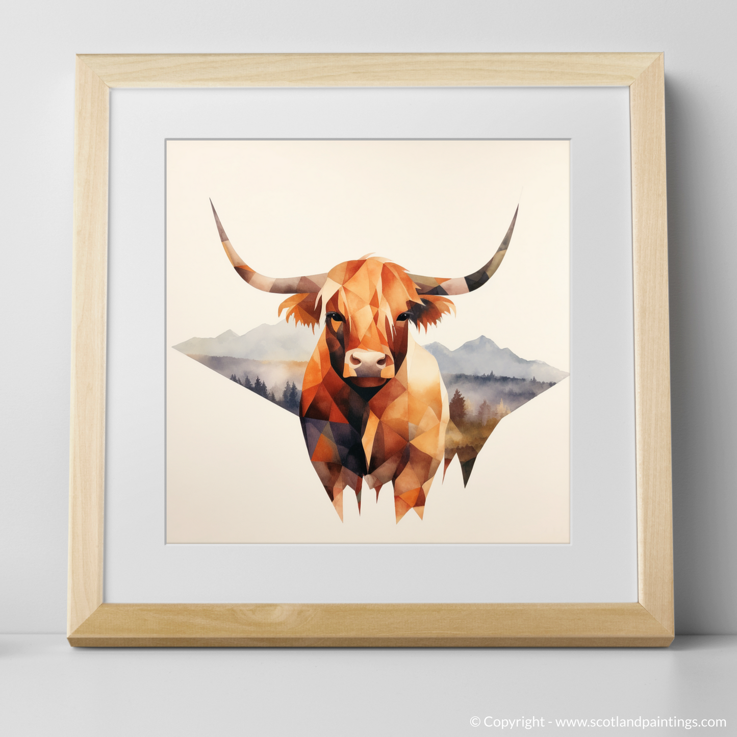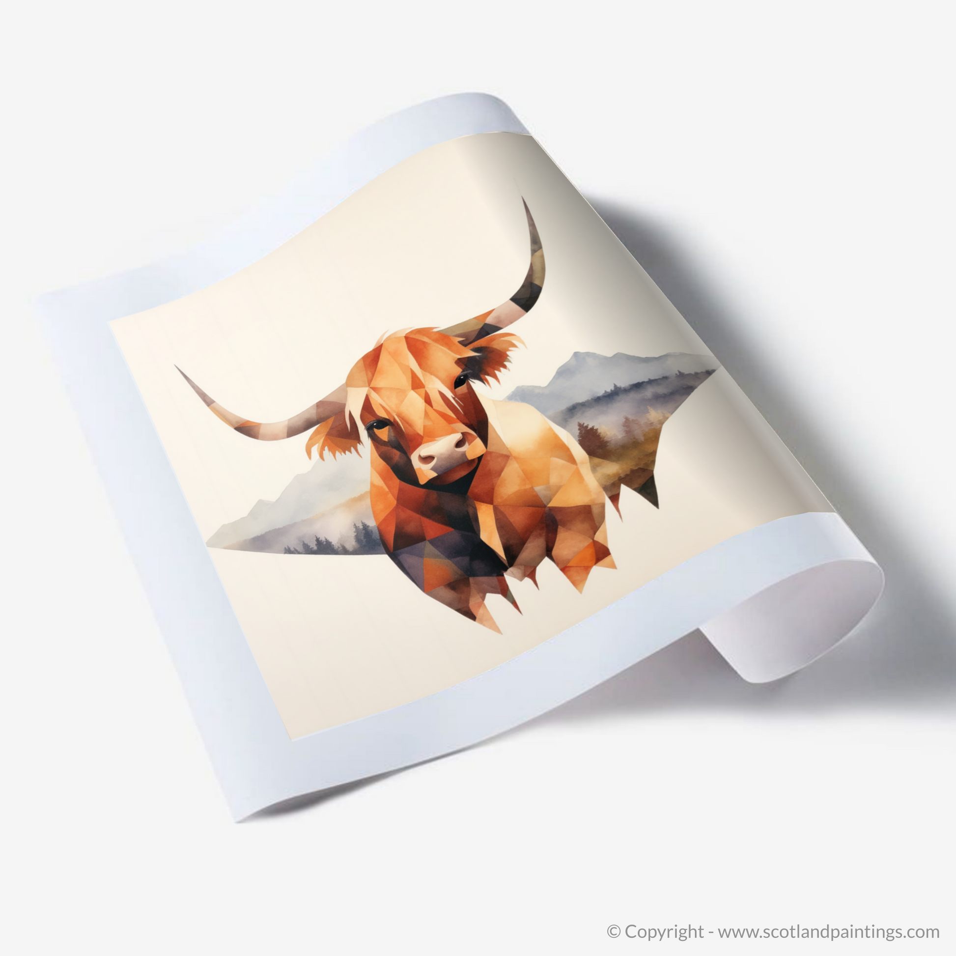 Captivating in its simplicity, this evocative print captures the rustic charm of a highland cow set against the ethereal backdrop of Scotland's natural landscape. The striking subject stands at the forefront, rendered with geometric precision that transforms its familiar form into a symphony of sharp lines and facets. The cow's warm, russet tones, ranging from burnt umber to soft caramel, are a harmonious tribute to the creature's rugged beauty and the autumnal hues of the highlands.
