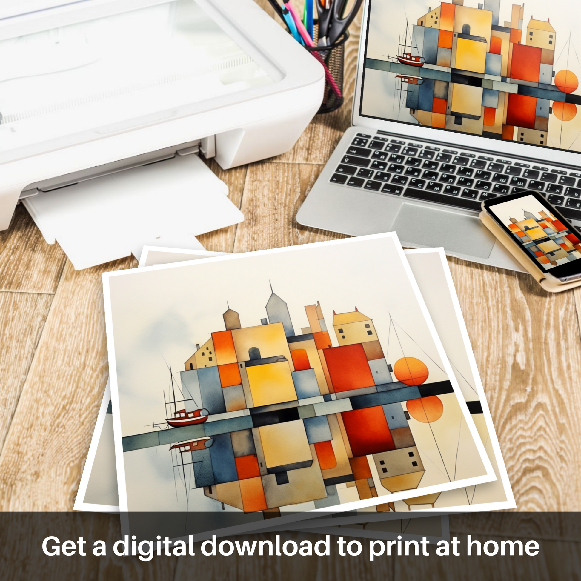 Immerse yourself in the quietude of Kirkwall Harbour with this minimalistic interpretation, a piece that exudes calm and pared-back elegance. The composition showcases a harmonious blend of warm ochres, gentle umbers, and soft greys, juxtaposed against the subtle wash of a clear sky background. The interplay of geometric shapes and flat planes of colour captures the essence of the harbour's architectural forms in a distilled, abstract fashion.