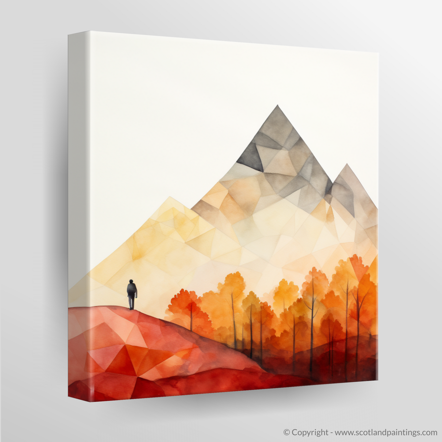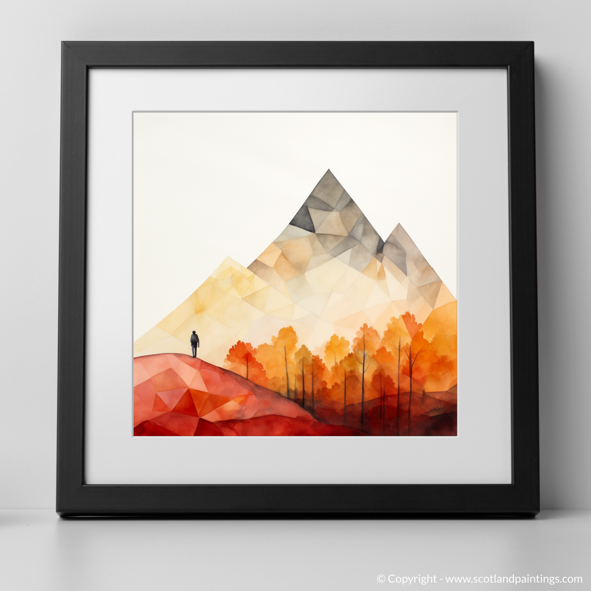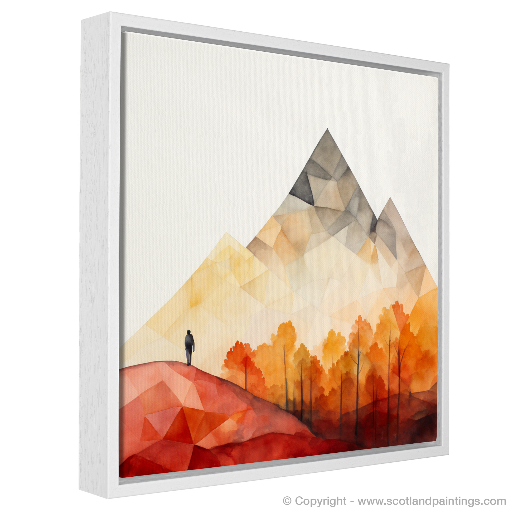 Summoning the essence of the Scottish Highlands with an impressive simplicity, this evocative piece captures a pristine moment of solitude in the rugged terrain of Glencoe. Geometry and colour coalesce to portray a minimalist vista where nature's grandeur is conveyed through bold, angular shapes and a striking, selective palette.