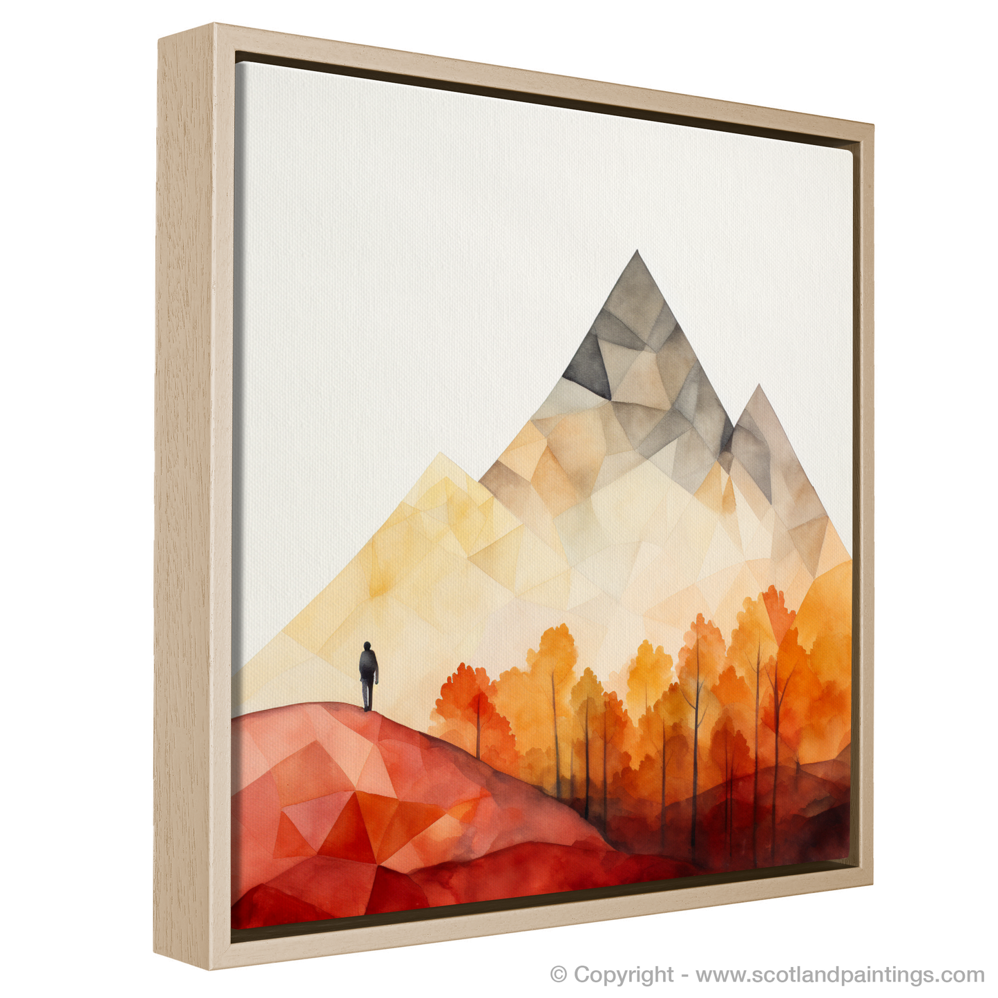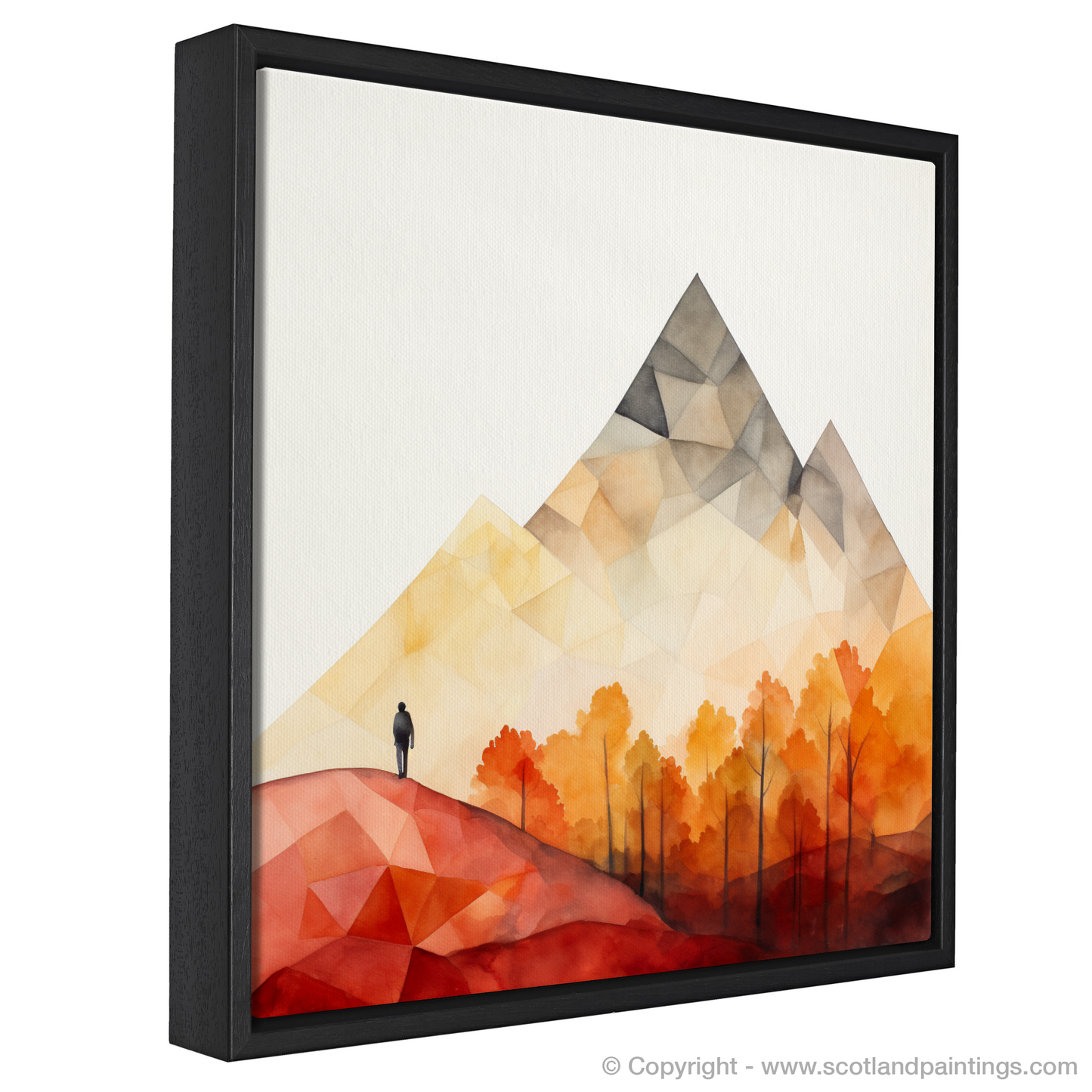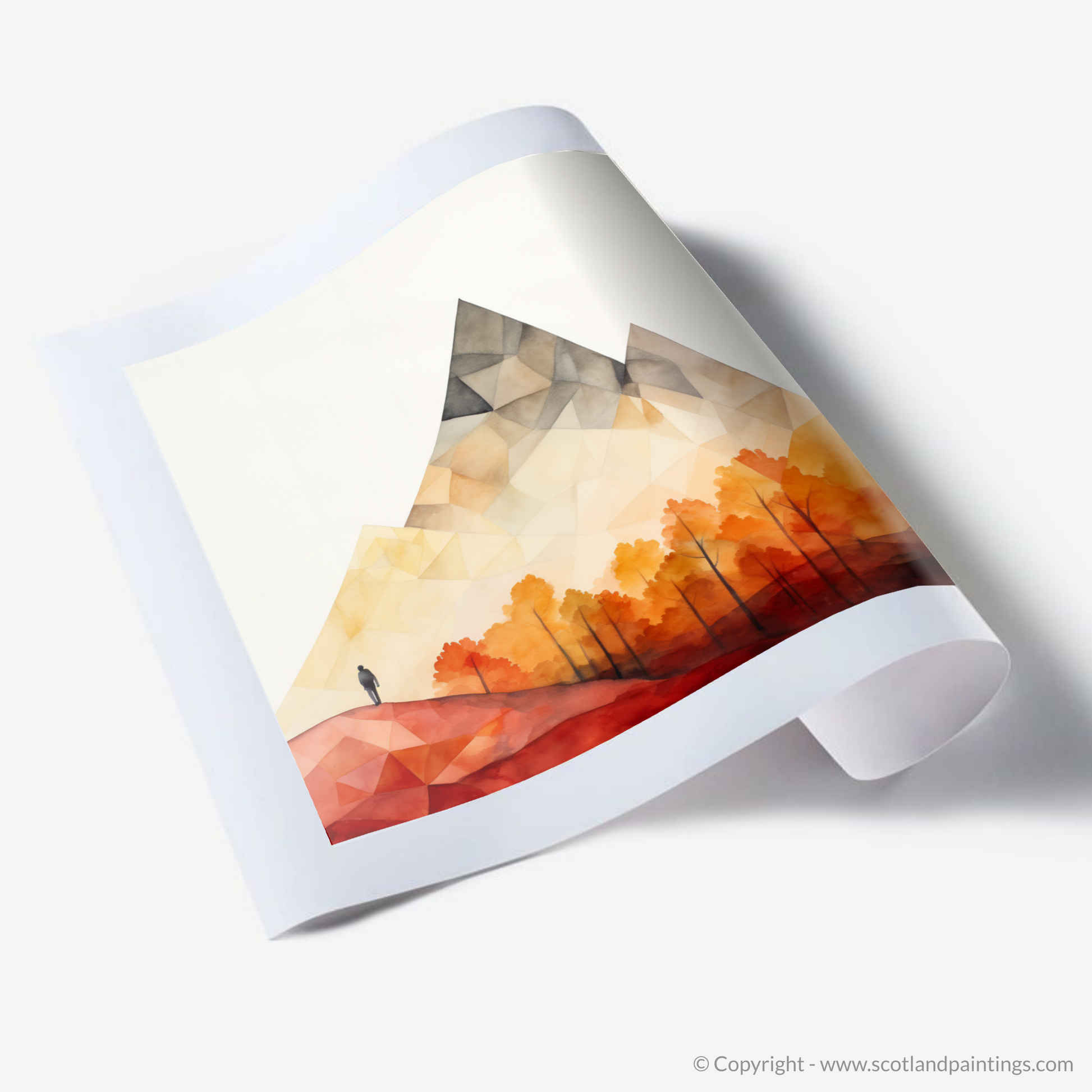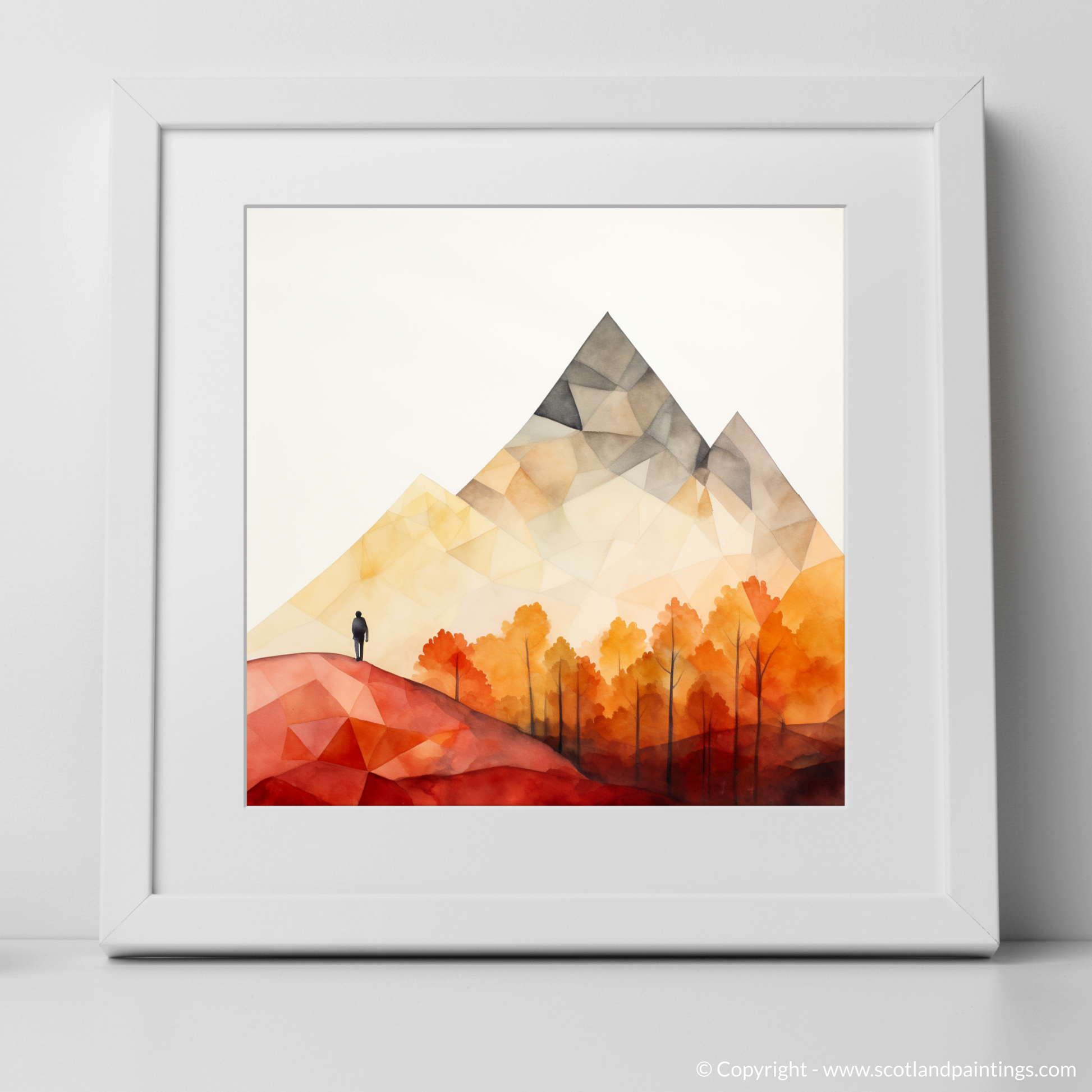 Summoning the essence of the Scottish Highlands with an impressive simplicity, this evocative piece captures a pristine moment of solitude in the rugged terrain of Glencoe. Geometry and colour coalesce to portray a minimalist vista where nature's grandeur is conveyed through bold, angular shapes and a striking, selective palette.