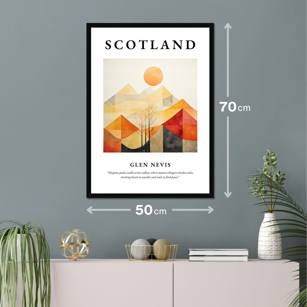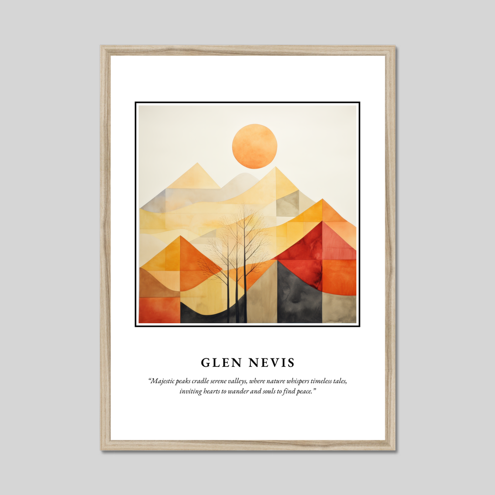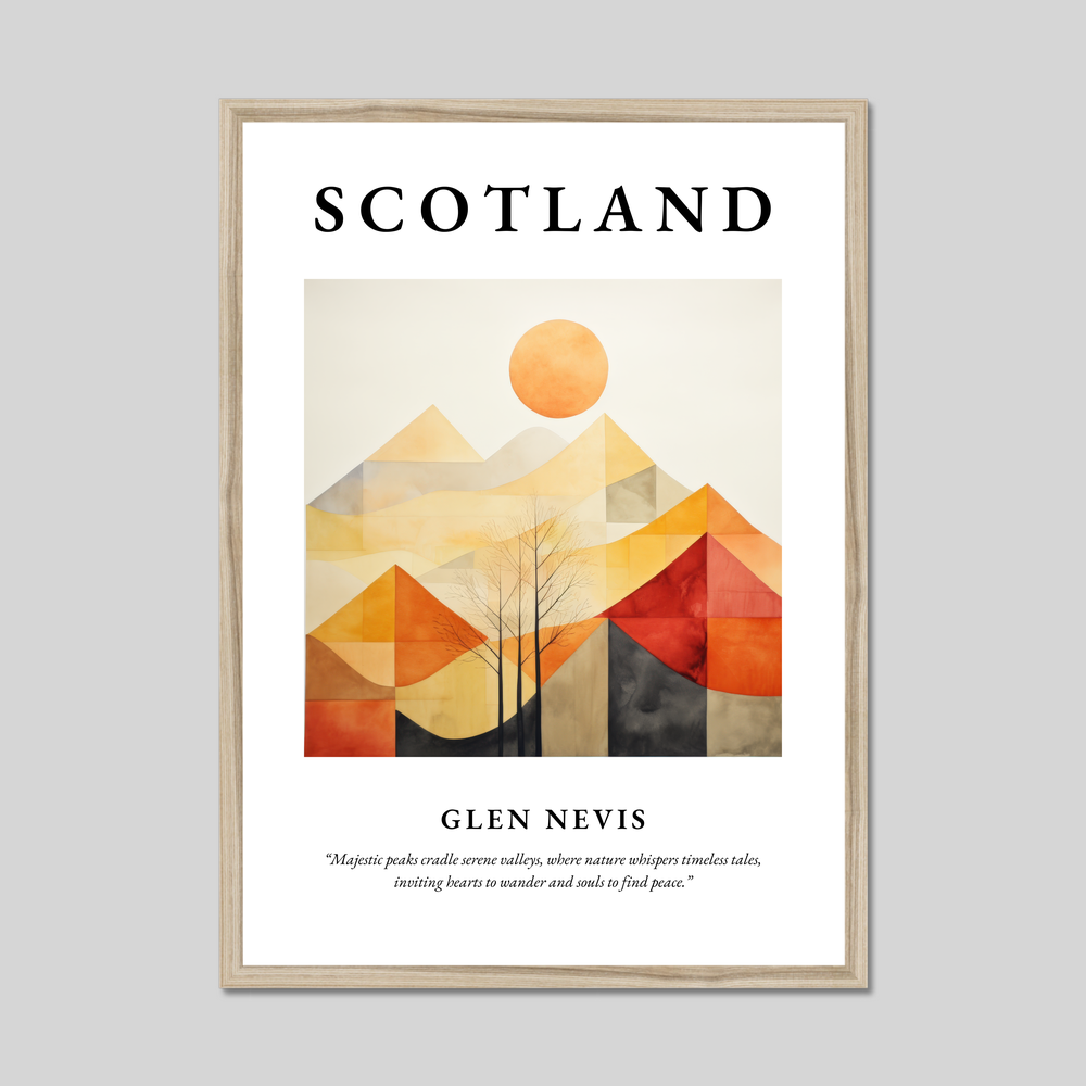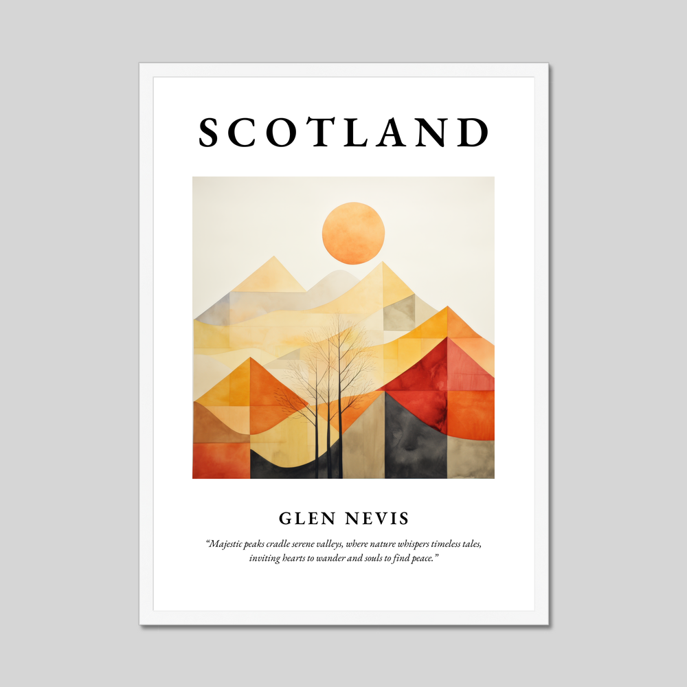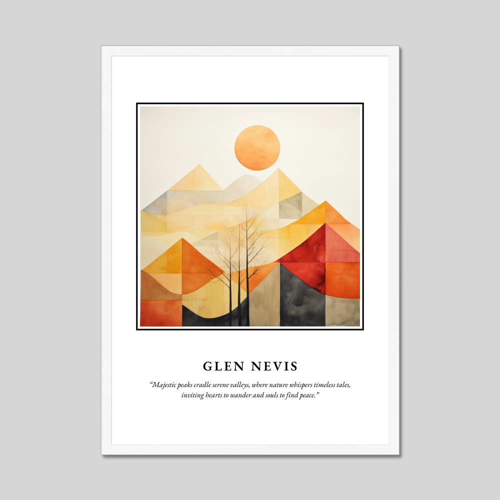 The minimalist representation in the artwork captures this serene wilderness, evoking the tranquil interplay of natural elements. Glen Nevis inspires a sense of wonder and exploration, and this beautifully crafted poster allows you to experience that magic every day, right from your own home.