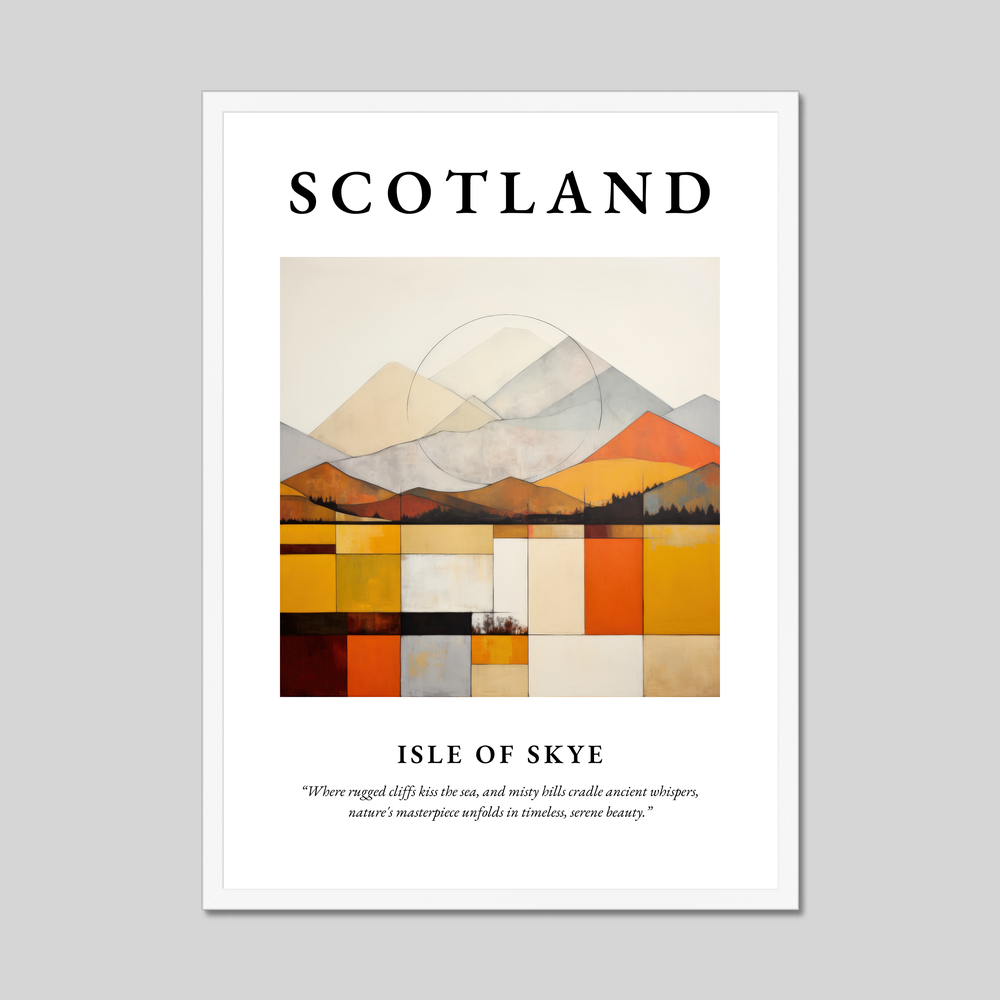 At the top, the bold declaration of “SCOTLAND” immediately captures attention, setting the stage for a journey through the majestic Scottish landscape. Below is a minimalistic painting of the Isle of Skye, where abstract shapes and soothing earth tones blend harmoniously, capturing the ethereal beauty of this iconic location. The lower section features the poetic quote: “Where rugged cliffs kiss the sea, and misty hills cradle ancient whispers, nature's masterpiece unfolds in timeless, serene beauty.” This description adds a layer of depth, inviting one to dream of distant, mystical lands.