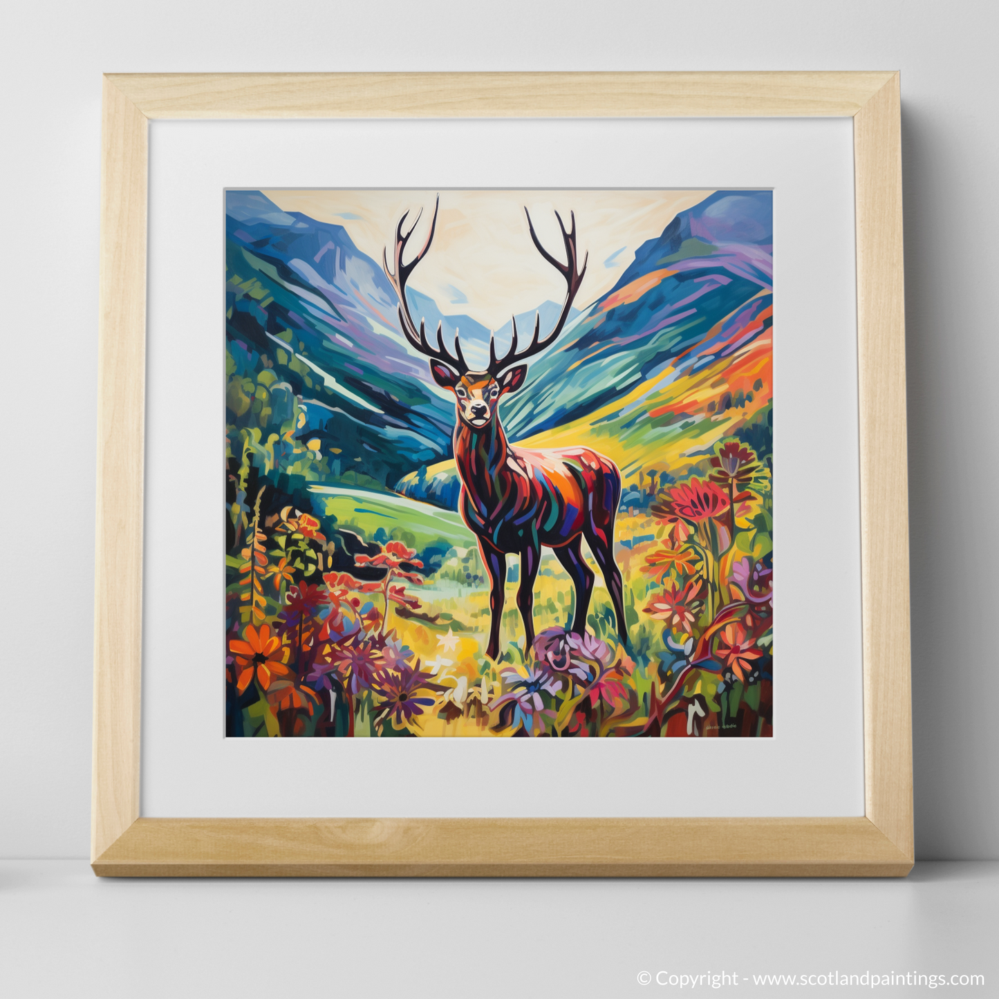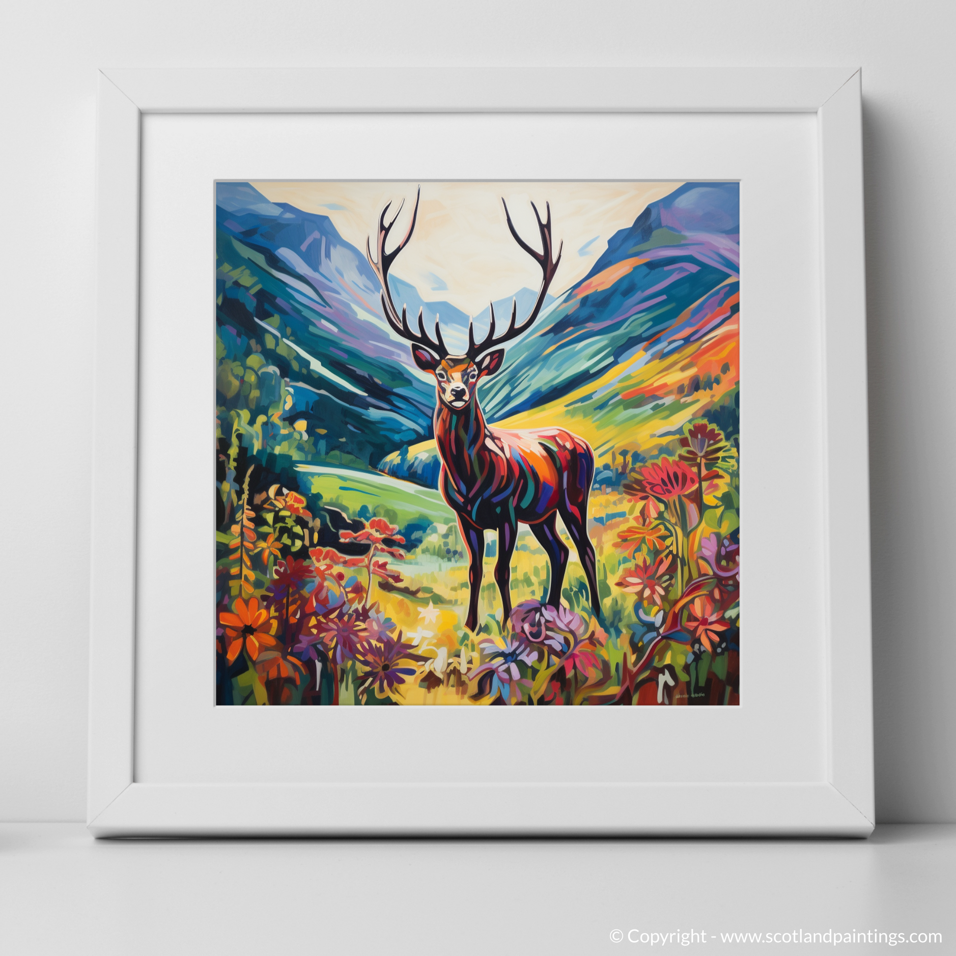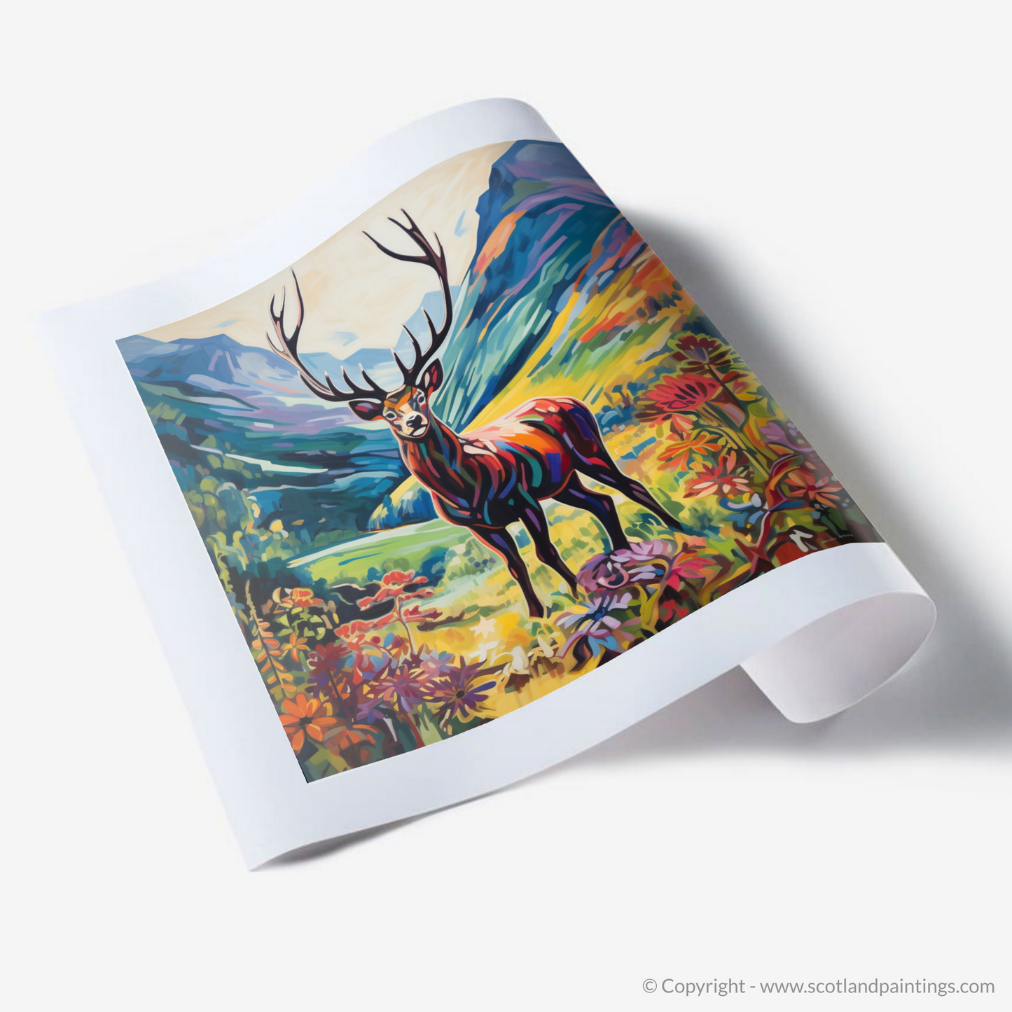 Immerse yourself in the vigorous vibrancy of a Scottish summer with this spirited Fauvist-inspired print. Bold hues and untamed brushstrokes capture the regal stance of a stag amidst the swirling colours of Glencoe's grandeur.