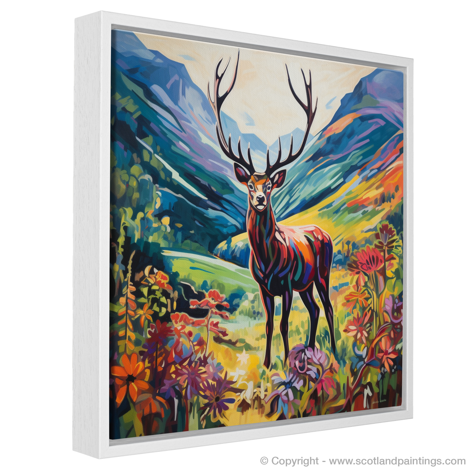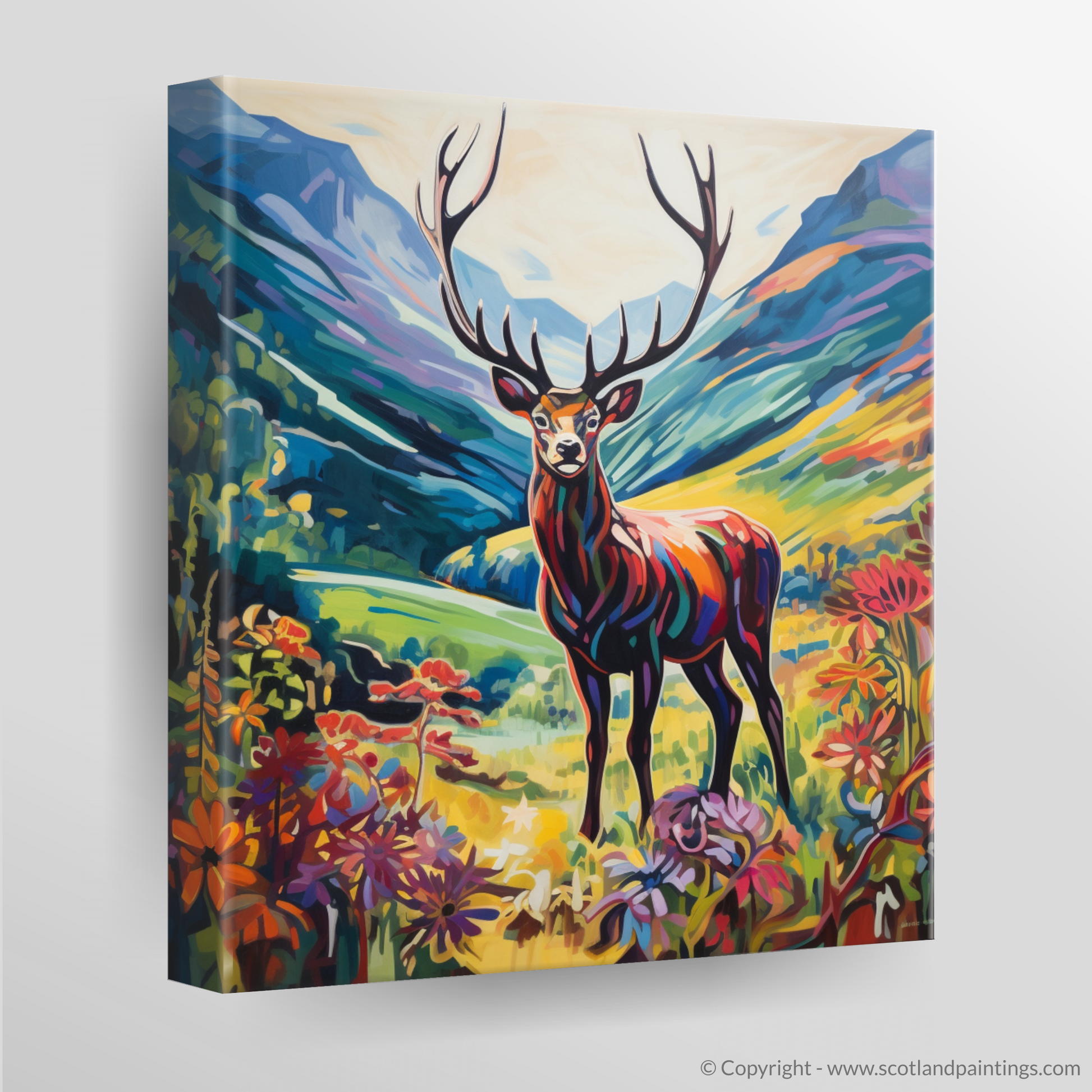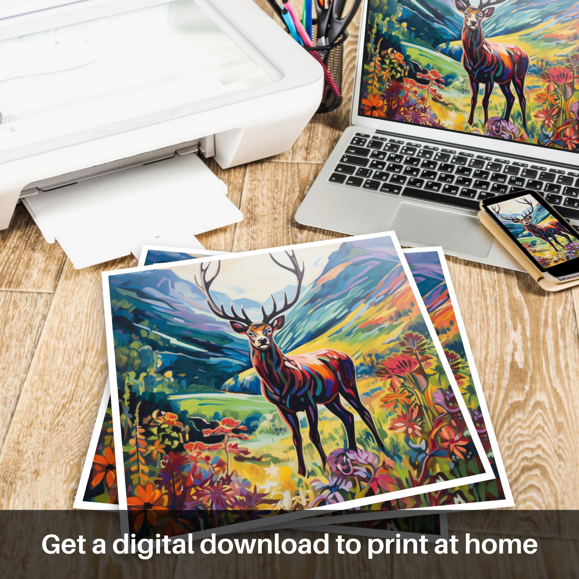 Immerse yourself in the vigorous vibrancy of a Scottish summer with this spirited Fauvist-inspired print. Bold hues and untamed brushstrokes capture the regal stance of a stag amidst the swirling colours of Glencoe's grandeur.