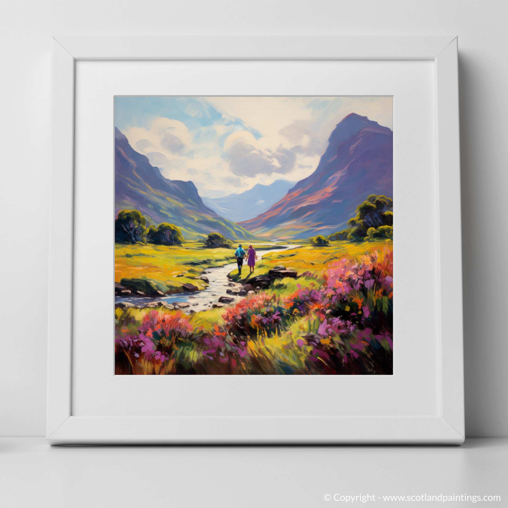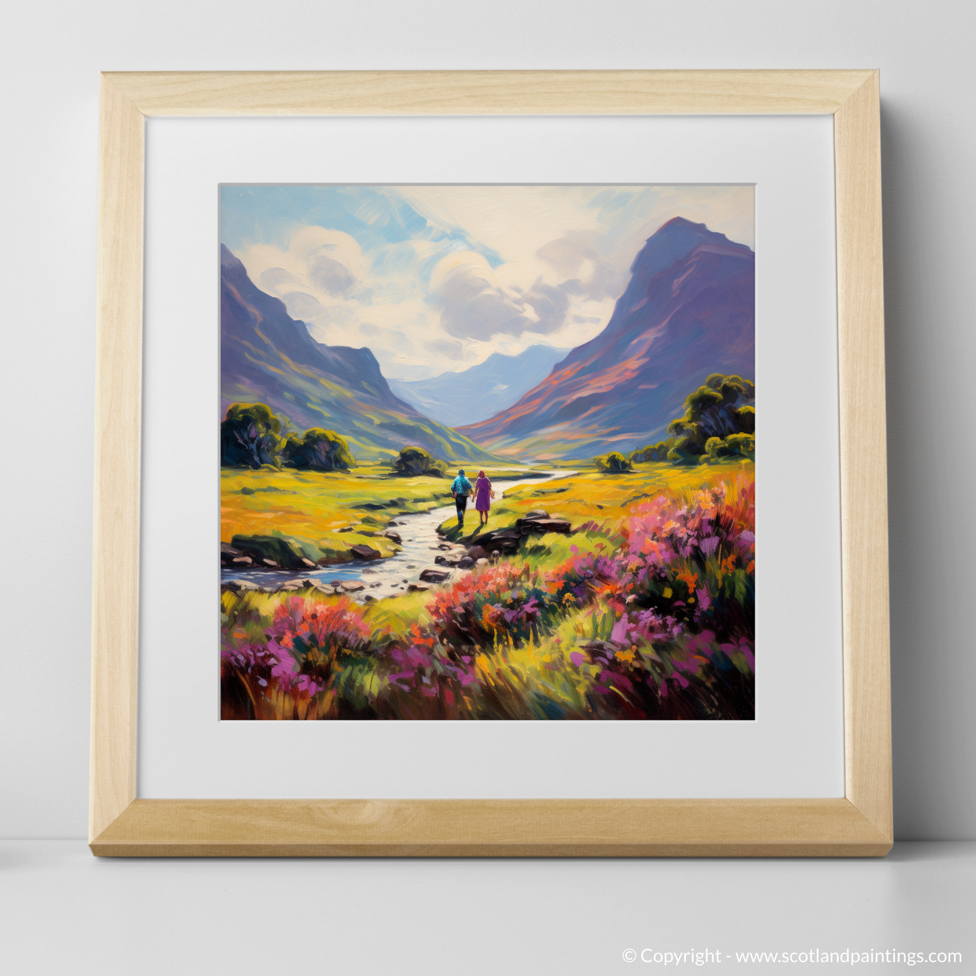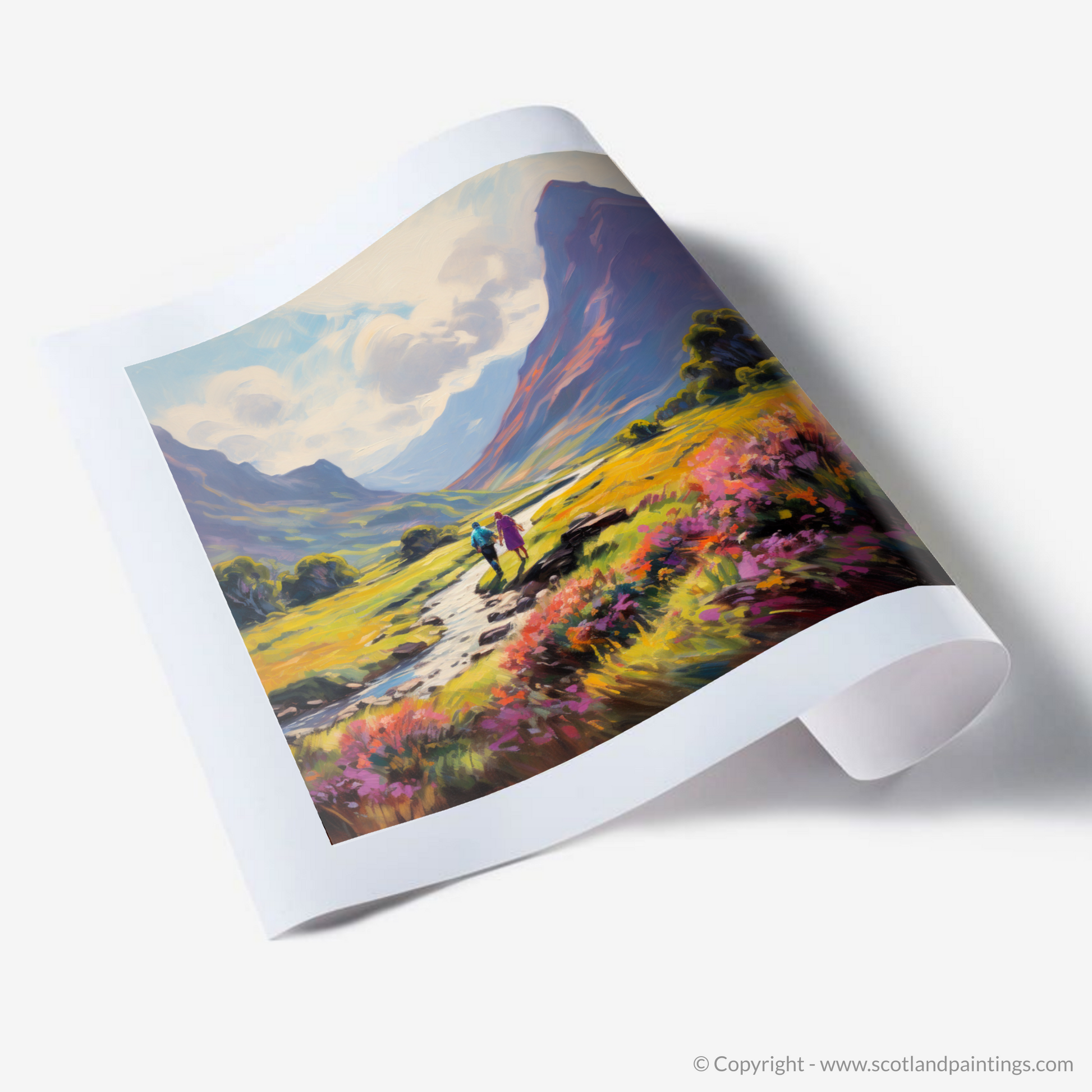 Enveloped in the warm embrace of a Scottish summer, this evocative print transports you to the serene Glencoe, a masterpiece of nature's own making. The lush, richly pigmented landscape unfolds beneath an expansive sky, where soft cloud swirls echo the gentle motion of the impressionist's brush.