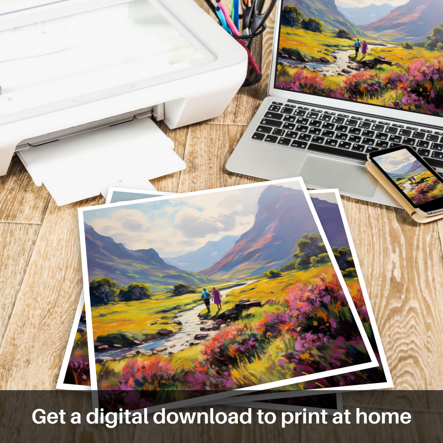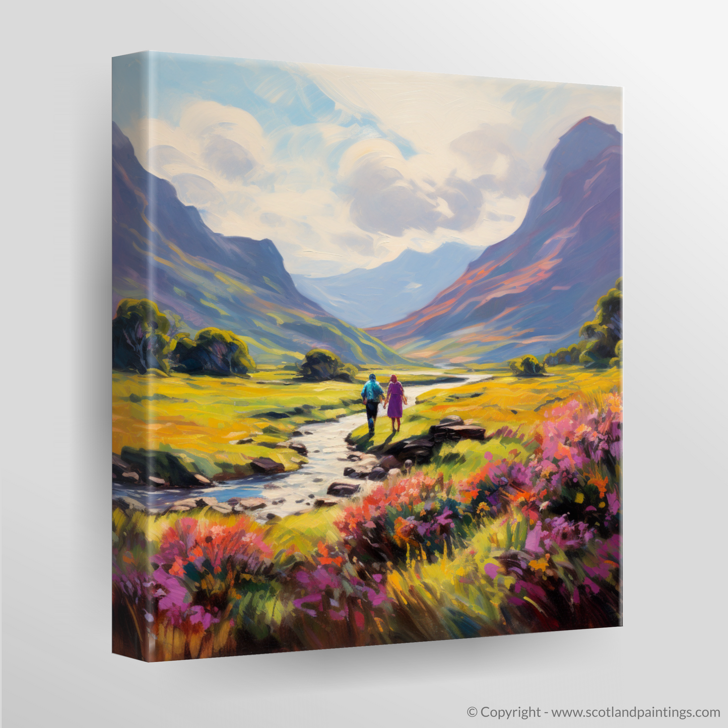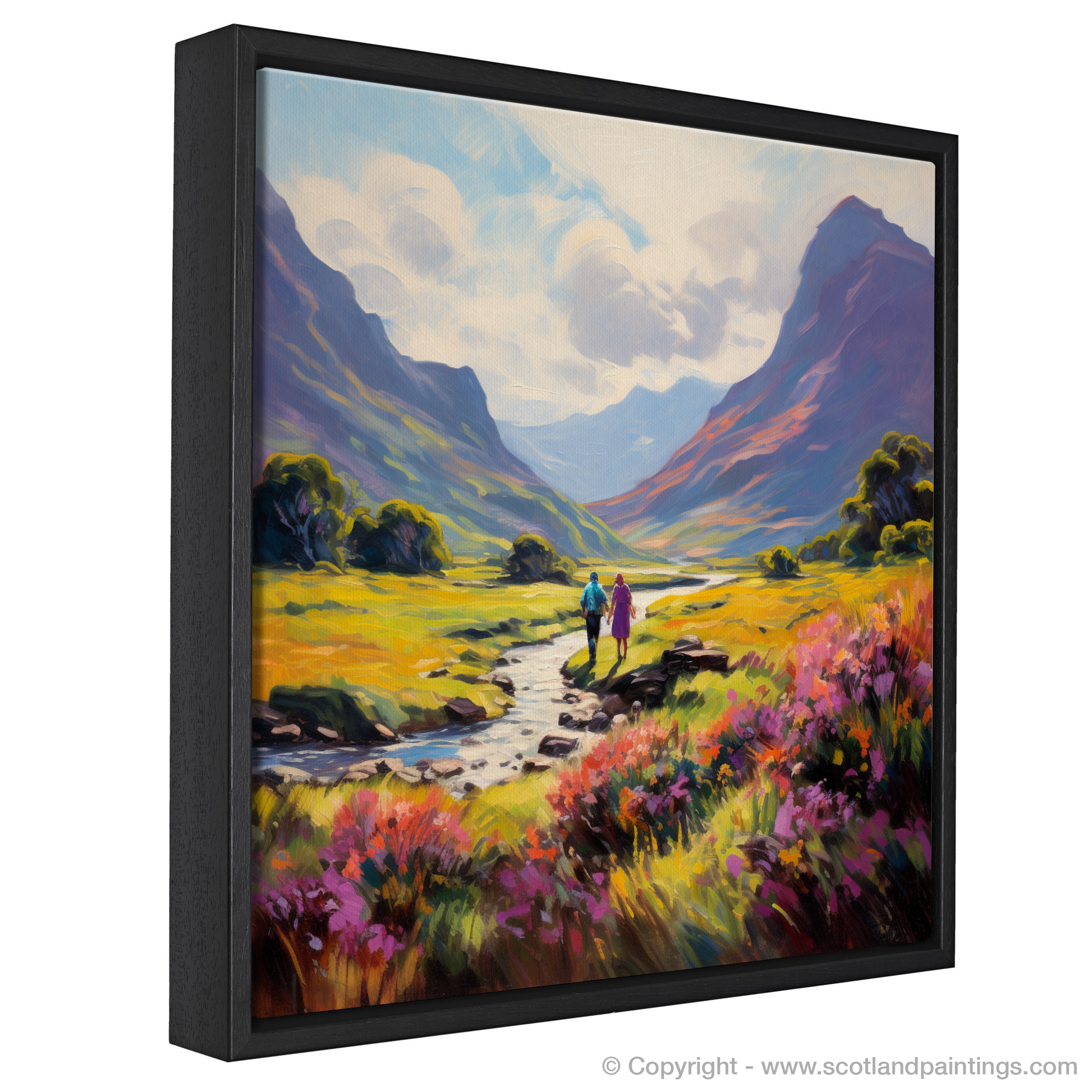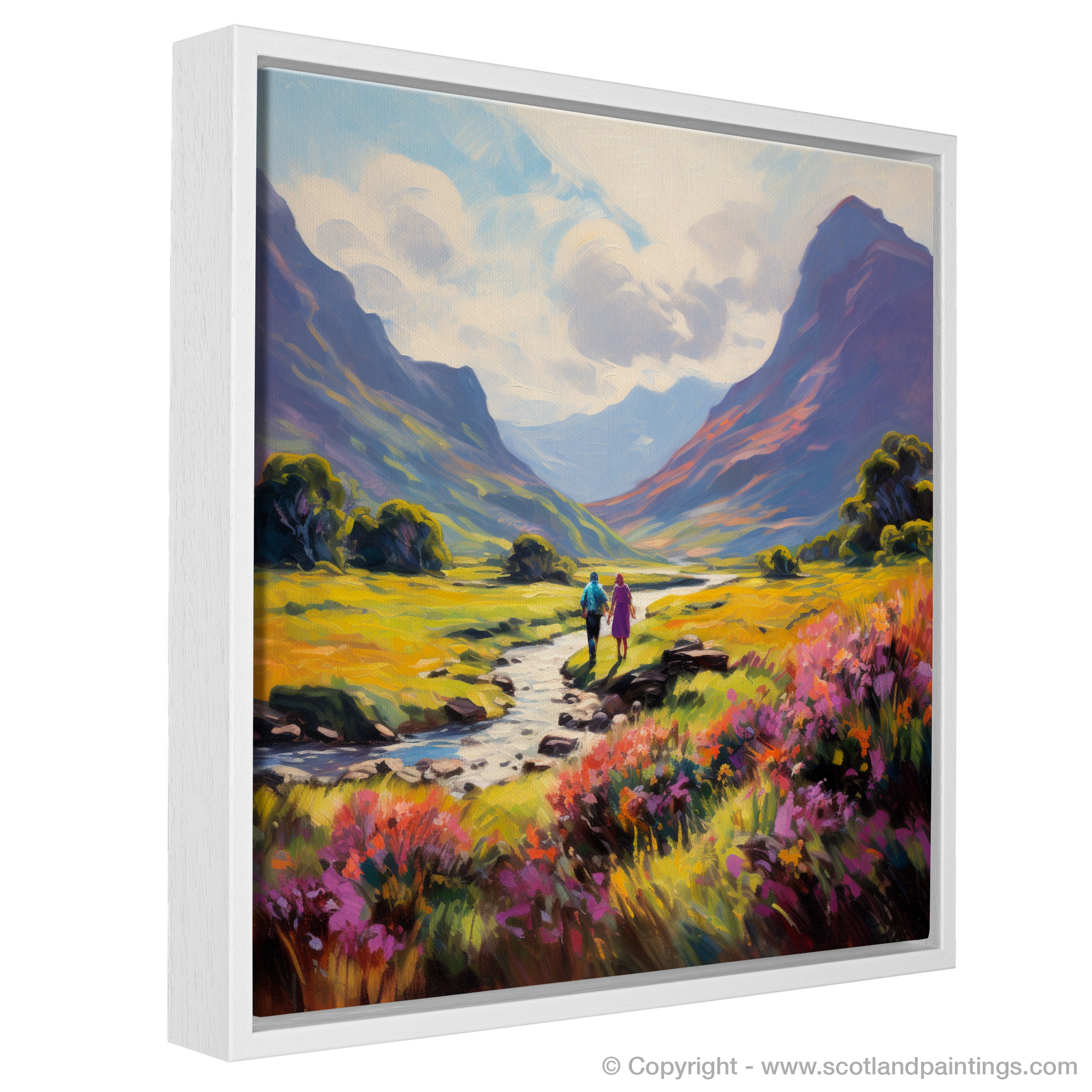 Enveloped in the warm embrace of a Scottish summer, this evocative print transports you to the serene Glencoe, a masterpiece of nature's own making. The lush, richly pigmented landscape unfolds beneath an expansive sky, where soft cloud swirls echo the gentle motion of the impressionist's brush.