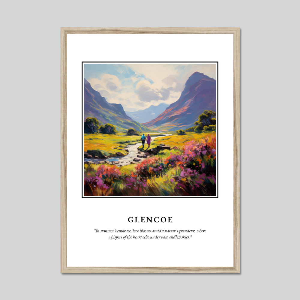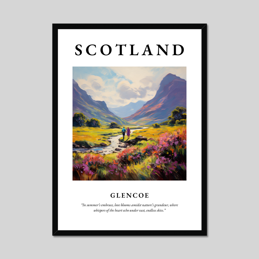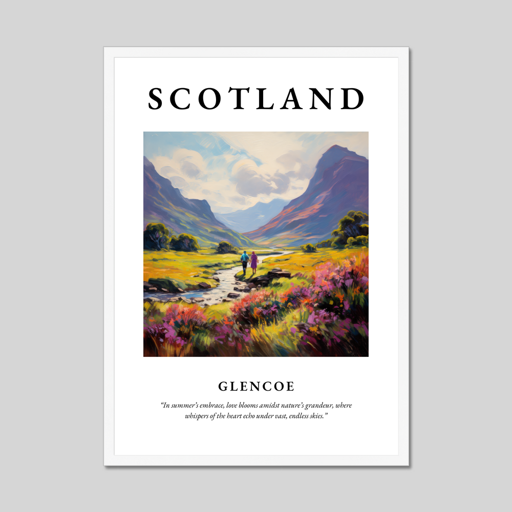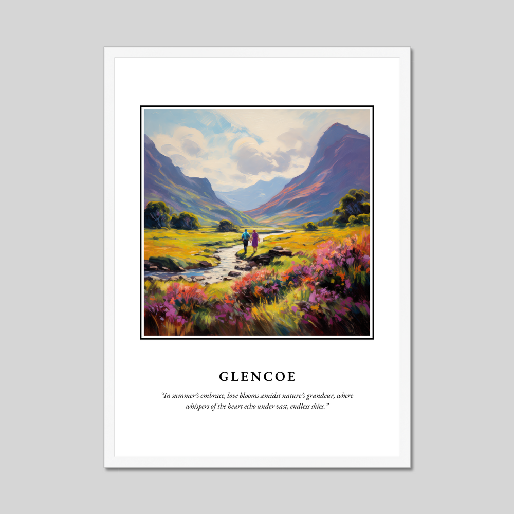 The poster features a transportive depiction of Glencoe, its rolling hills and lush valleys captured in vibrant brushstrokes that evoke the enchanting allure of the Scottish landscape. Rich hues merge seamlessly, reflecting the dance of light across the peaks and valleys, while a tranquil stream invites you into the scene. Beneath, a tender quote whispers of love blooming amid nature's grandeur: “In summer’s embrace, love blooms amidst nature’s grandeur, where whispers of the heart echo under vast, endless skies.” This piece is an ideal gift for art enthusiasts, lovers of Impressionism, or anyone with fond memories of this iconic location.