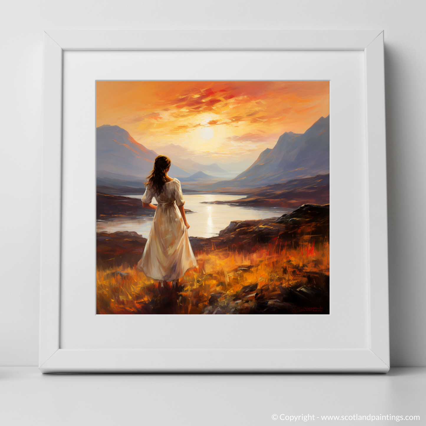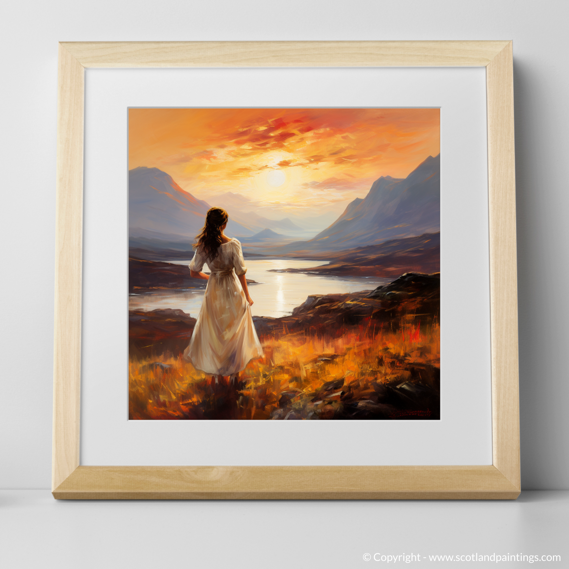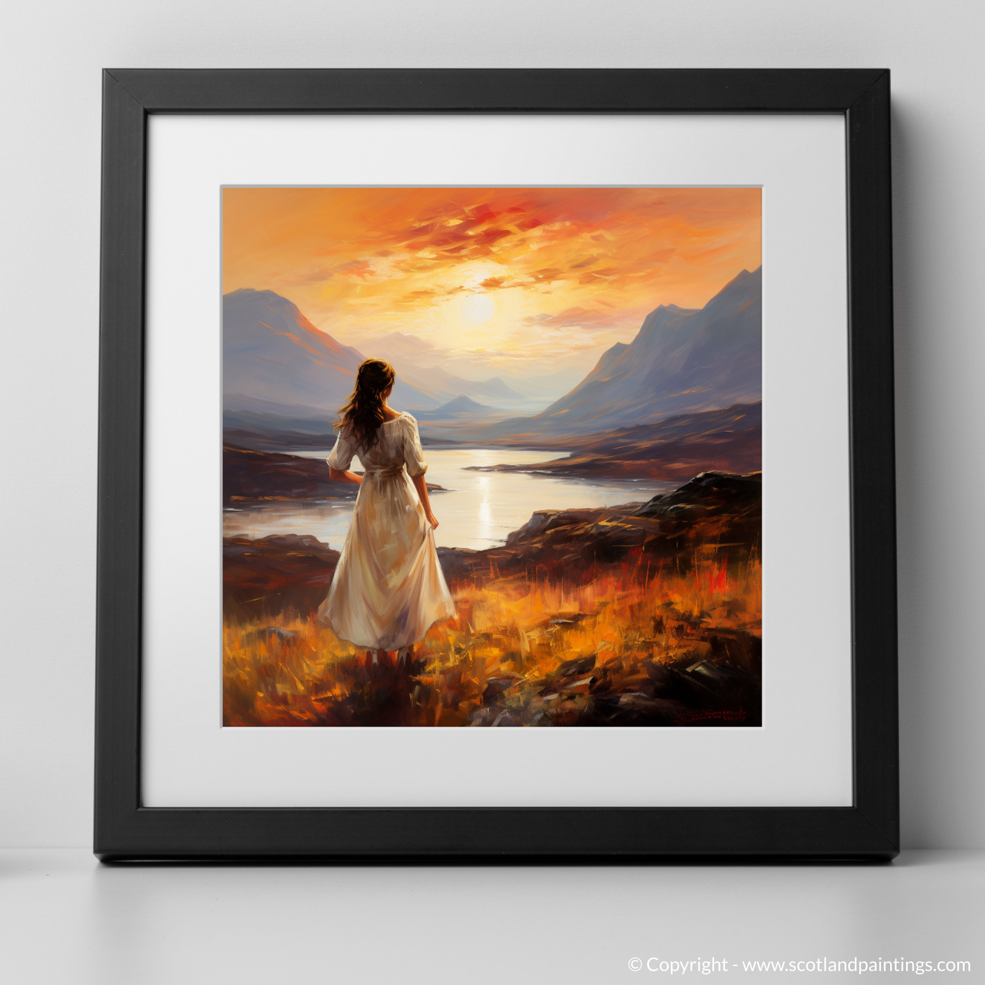 With a palette that echoes the warmth of Scottish evenings, the print invites viewers to be lost in the myriad of colours that dance across the sky. From fiery oranges to mellow purples, each brushstroke is infused with the vibrant glow of the fading sun, its reflection shimmering on the serene loch beneath the majesty of the stoic peaks. The atmosphere is laden with an almost audible silence, broken only by the whisper of the wind that we can imagine playing with the woman's hair and the hem of her dress.