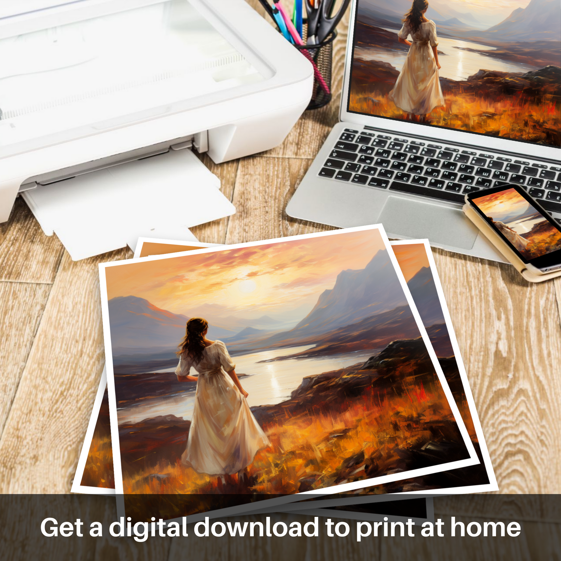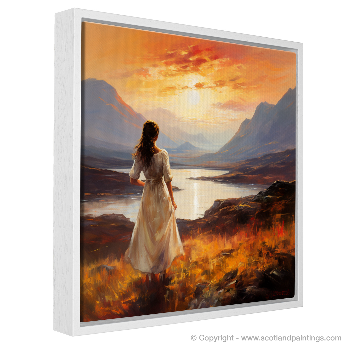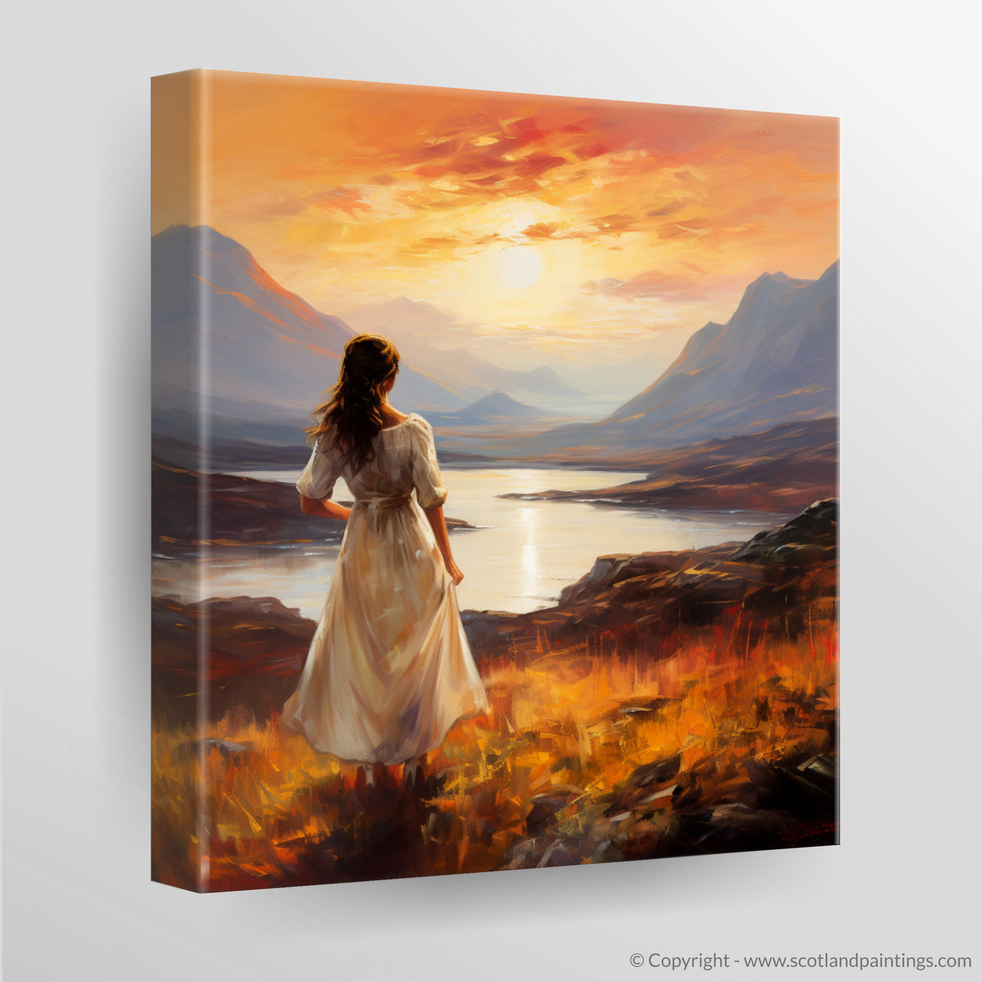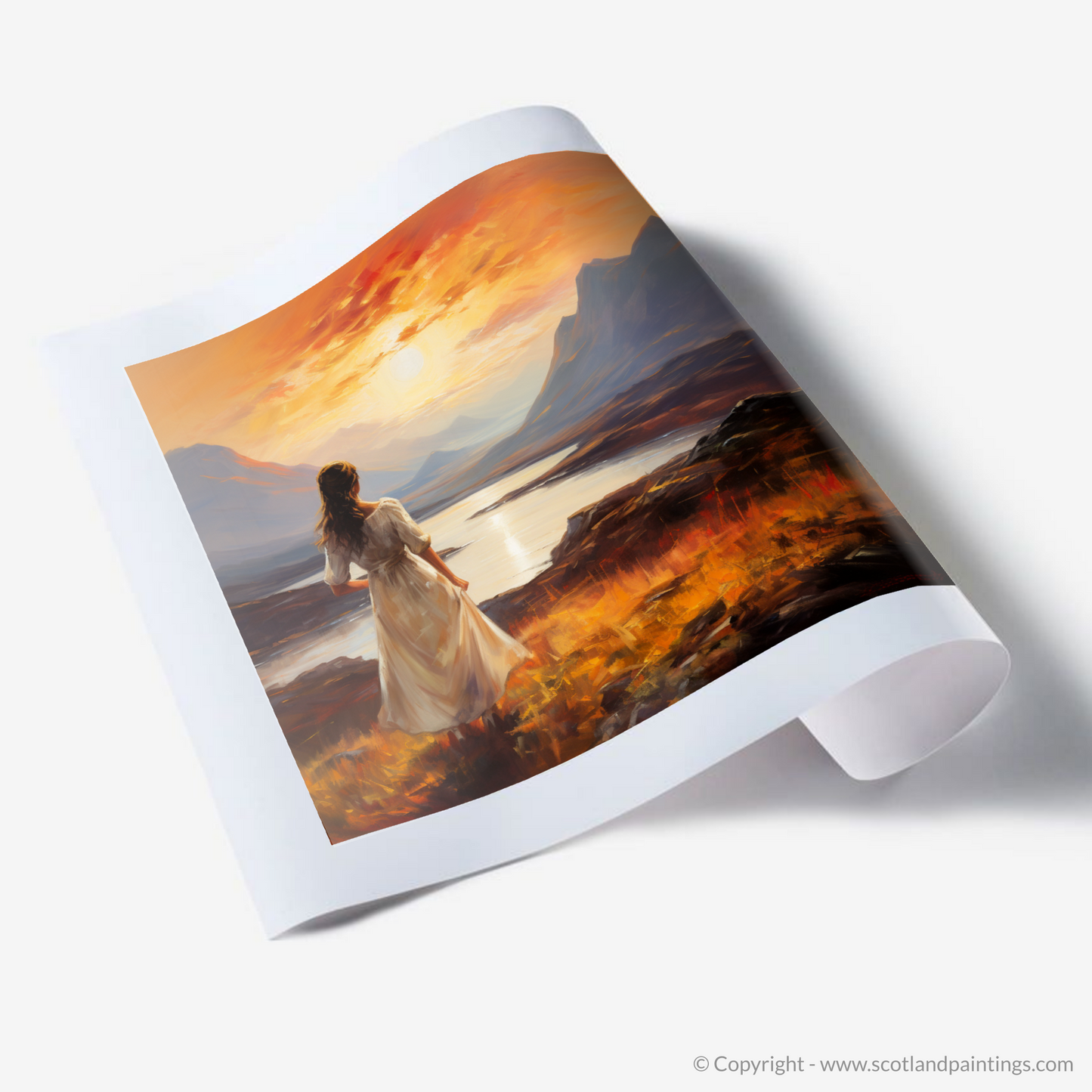 With a palette that echoes the warmth of Scottish evenings, the print invites viewers to be lost in the myriad of colours that dance across the sky. From fiery oranges to mellow purples, each brushstroke is infused with the vibrant glow of the fading sun, its reflection shimmering on the serene loch beneath the majesty of the stoic peaks. The atmosphere is laden with an almost audible silence, broken only by the whisper of the wind that we can imagine playing with the woman's hair and the hem of her dress.