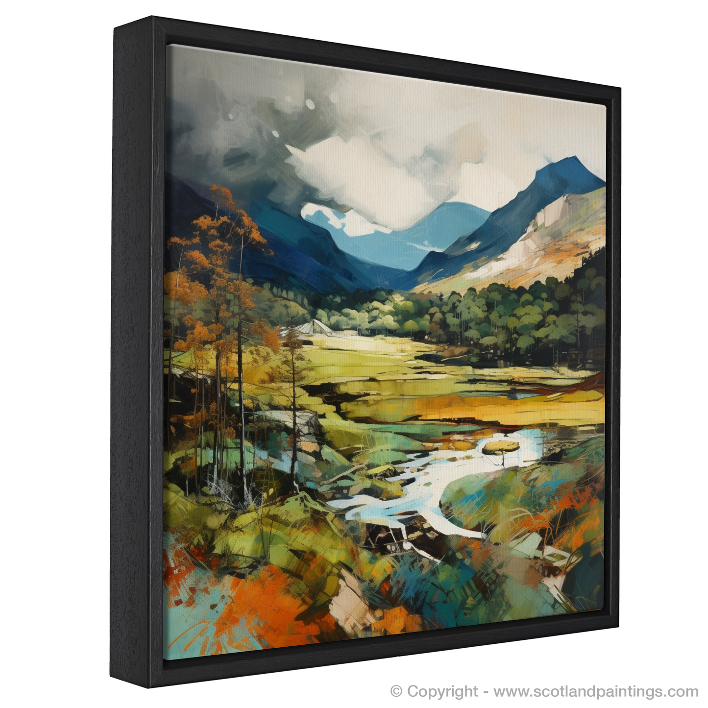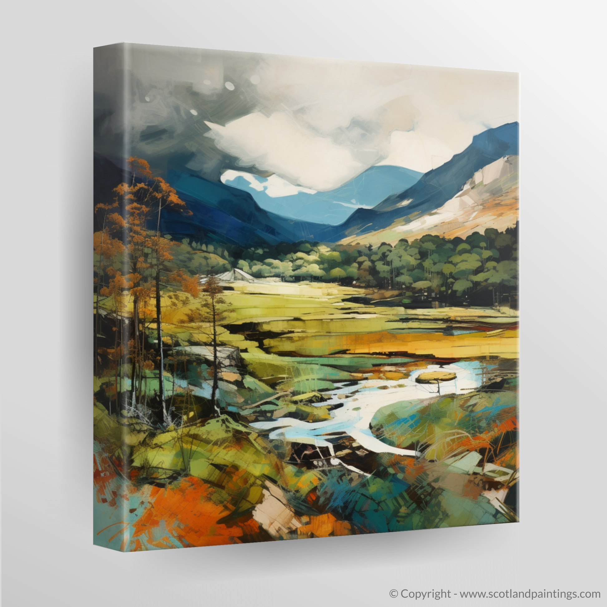 Verdant greens and earthen hues reflect the undulating terrain, whilst the use of vibrant oranges and reds evoke the wild flora that speckle the locale's rich tapestry. Deep blues and sombre greys interplay across the canvas, suggesting a dynamic sky that shifts with the volatile Highland weather. The juxtaposition of light and shadow, coupled with the fragmented reflections in the serene waters, invite contemplation and offer a sublime sense of depth.