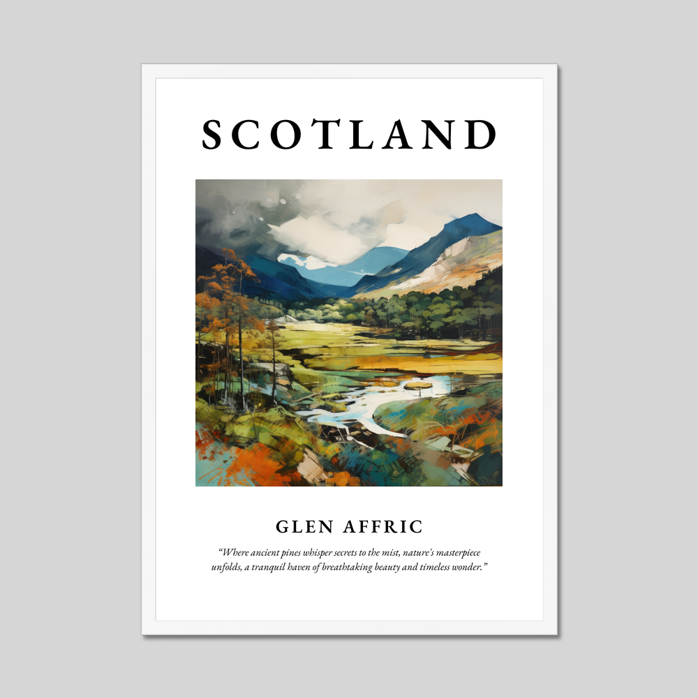 At the top of the poster, the word "SCOTLAND" is boldly declared, setting the stage for the enchanting landscape below. The painting reveals Glen Affric through a Cubist lens, depicting the layered textures and vibrant hues of its rugged terrain. Each facet of the artwork embodies the dynamic interplay of form and colour, capturing the majesty of ancient pines and the serenity of the glen. Underneath, in elegant smaller text, lies the evocative quote: “Where ancient pines whisper secrets to the mist, nature's masterpiece unfolds, a tranquil haven of breathtaking beauty and timeless wonder.”