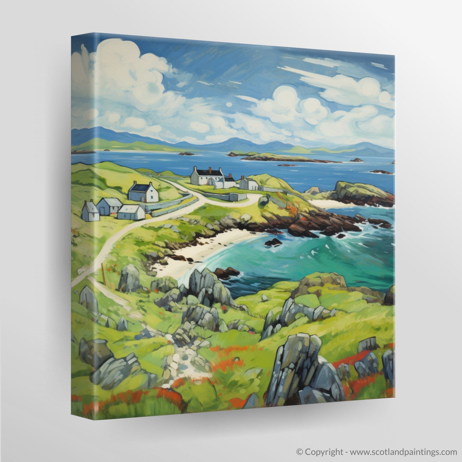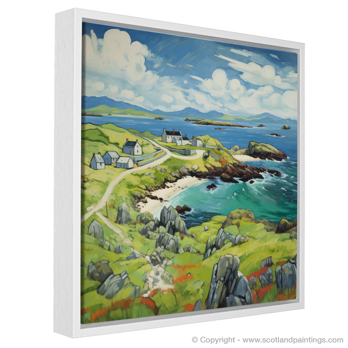 The image overflows with the raw beauty of Iona, featuring its rolling green hillsides dotted with humble cottages, their white walls reflecting the gentle sunlight. Each building looks snugly nestled within the landscape, with slate-grey roofs that harmonise perfectly with the rocky outcrops strewn across the fields.