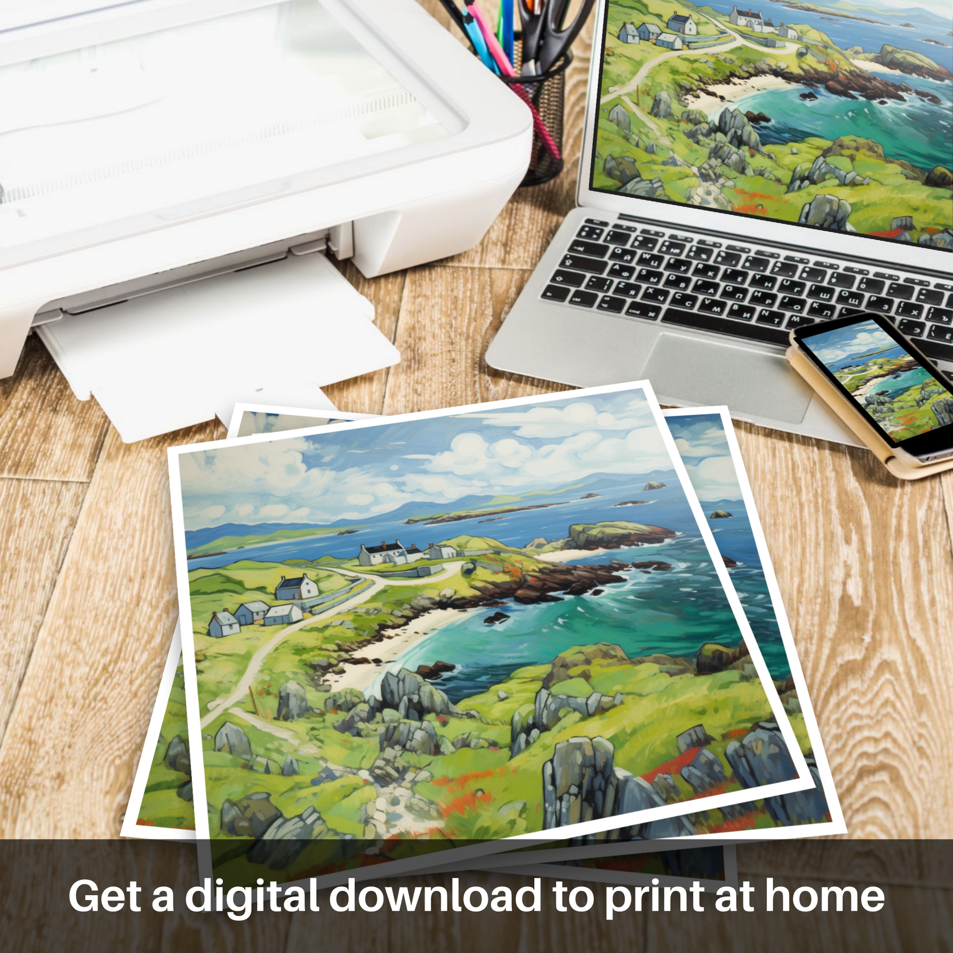 For lovers of Scotland's natural splendour, this print is not merely wall decor but a portal to the soul-soothing landscapes that define the nation's untamed beauty. It's a visual celebration of a special place, simple in its execution yet rich in its ability to evoke fond memories or dreams of tranquil island escapes.