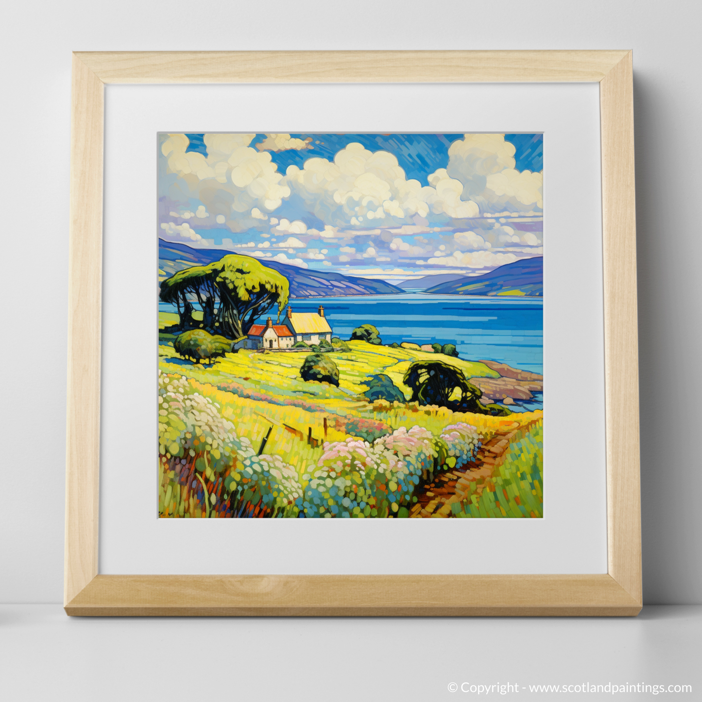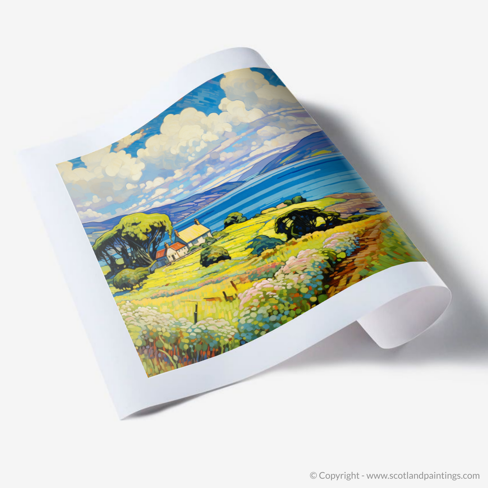 Let the warm embrace of a Scottish summer sweep over you with this stirring illustration inspired by the Isle of Bute, nestled in the serene Firth of Clyde. Awash with the vibrant hues of the season, this artwork captures the quintessence of Art Nouveau, a style that celebrates the harmonious flow of nature.