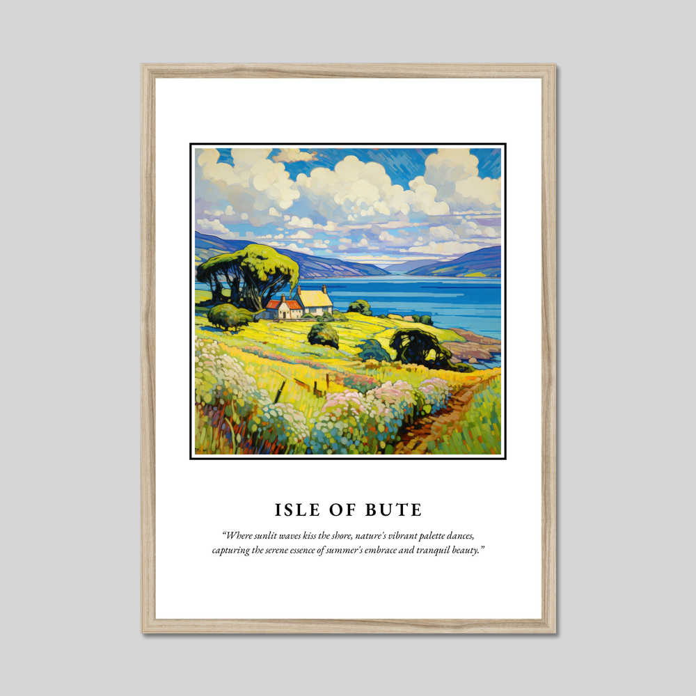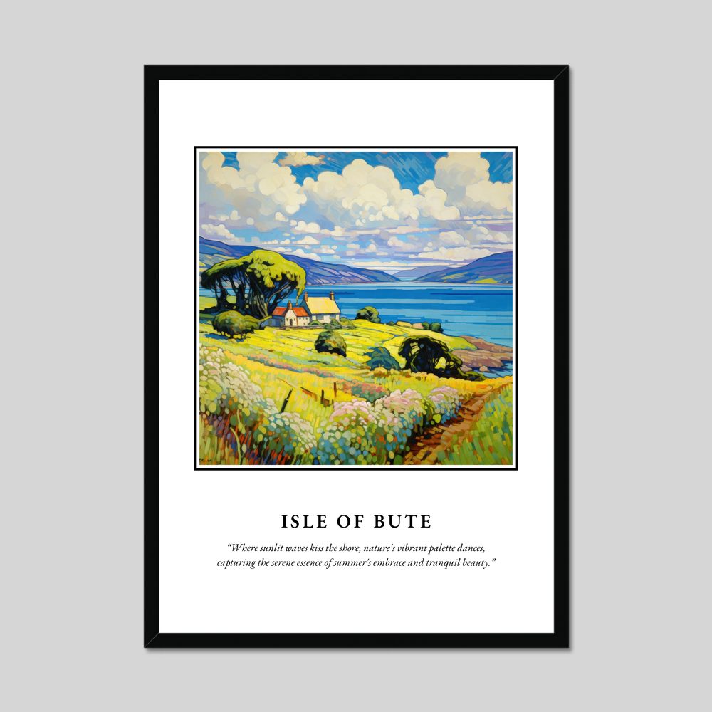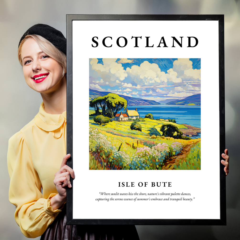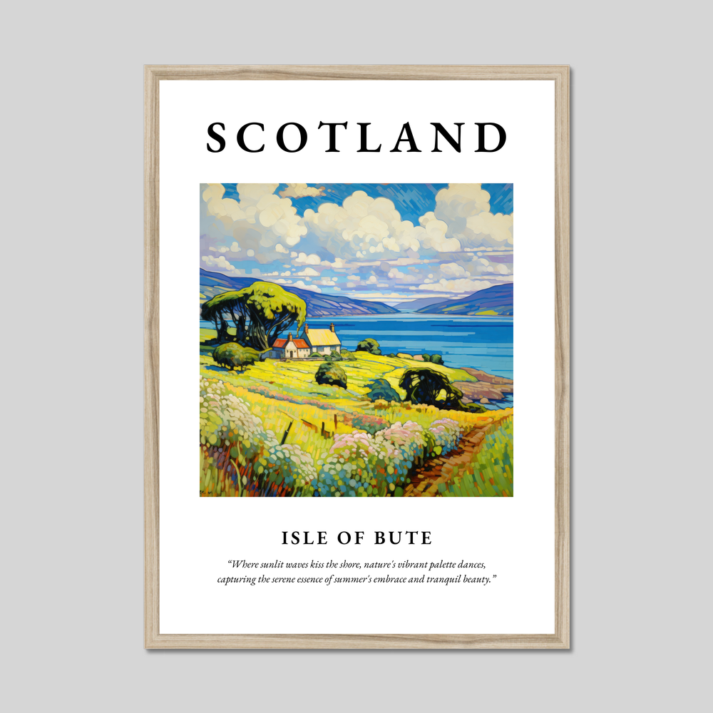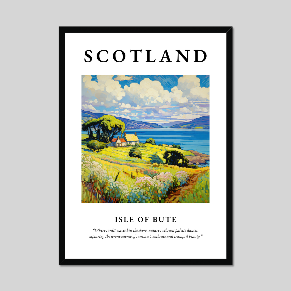 The Isle of Bute, lovingly depicted in this artwork, is a hidden gem off Scotland's west coast. Known for its stunning landscapes and a gentle climate that invites exploration, the island is a haven for both nature lovers and history buffs. Famed for its diverse birdlife and exquisite gardens, such as those at Mount Stuart, Bute offers a tranquil escape where the modern world feels a world away. The poster's scene, reflecting the isle's natural glory, invites you to wander its inviting beaches and verdant hillsides, promising an endless summer of discovery right from your wall.