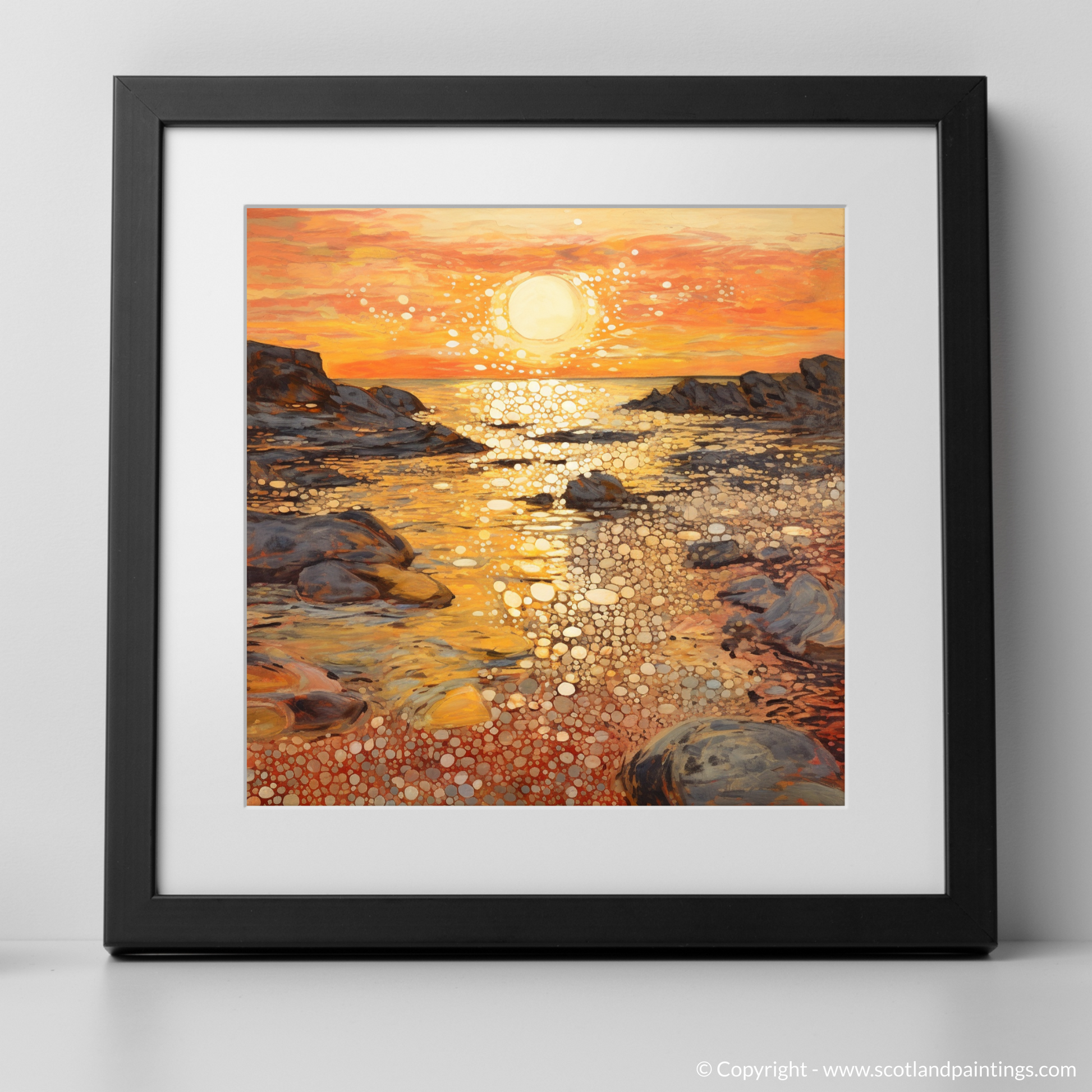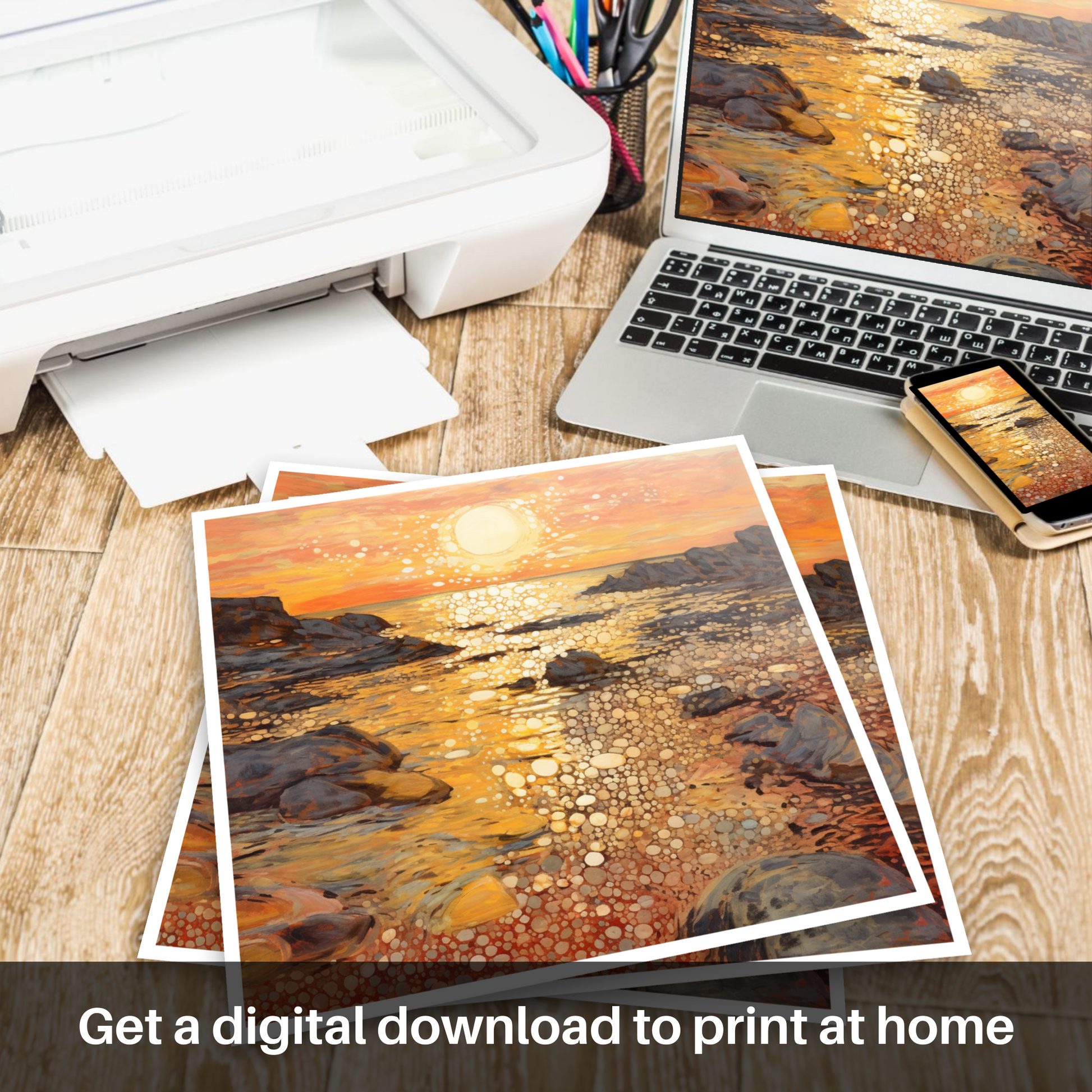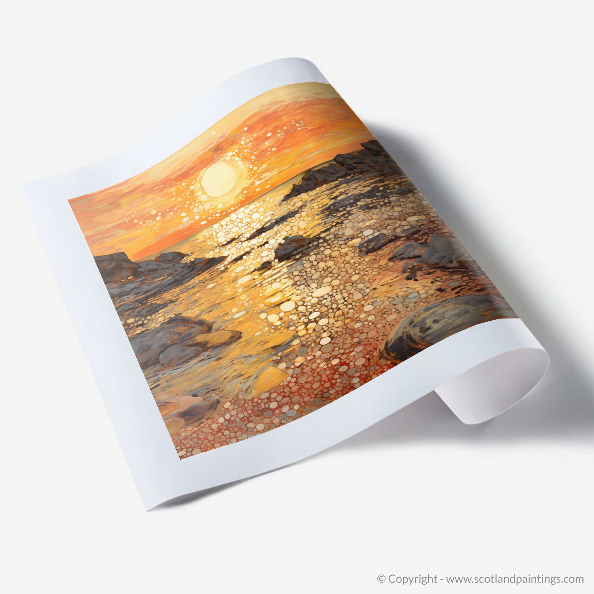 The artwork showcases the bay’s rugged coastline, where jagged rocks and smooth stones lie scattered, each one gently kissed by the fading sunlight. The sea mirrors the sky, a tapestry of fiery oranges, soft golds, and gentle pinks, interrupted only by the soothing ebb and flow of the tide. Above, the heavens are ablaze with the rich palette of twilight, centred around a sun that hovers like a radiant orb on the brink of nightfall.