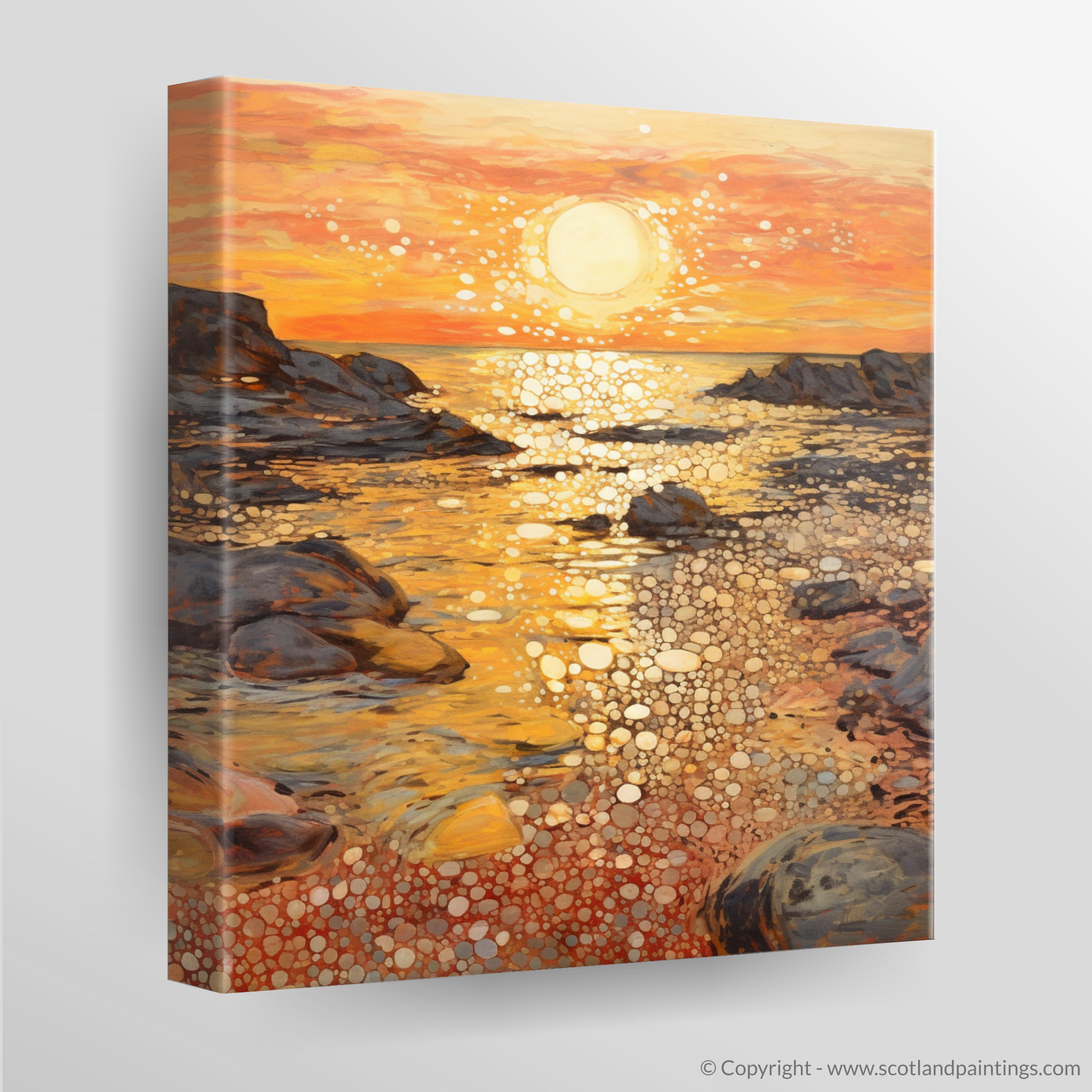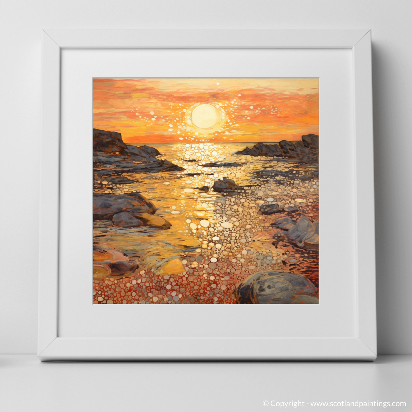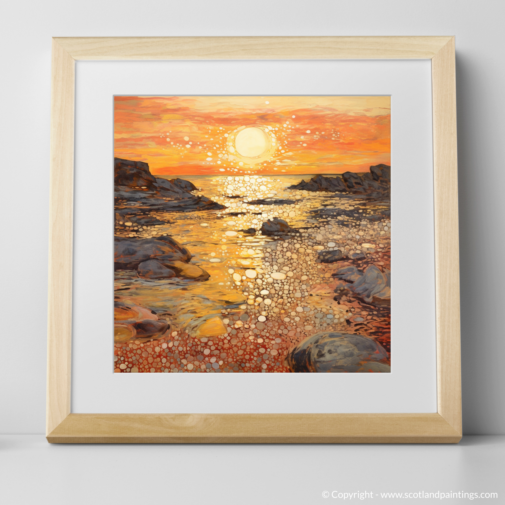 The artwork showcases the bay’s rugged coastline, where jagged rocks and smooth stones lie scattered, each one gently kissed by the fading sunlight. The sea mirrors the sky, a tapestry of fiery oranges, soft golds, and gentle pinks, interrupted only by the soothing ebb and flow of the tide. Above, the heavens are ablaze with the rich palette of twilight, centred around a sun that hovers like a radiant orb on the brink of nightfall.