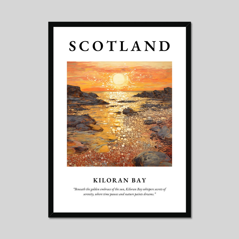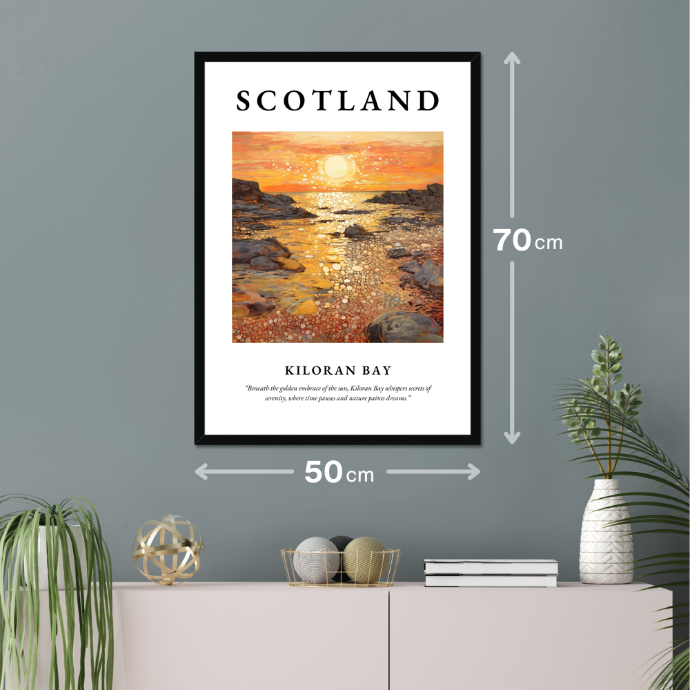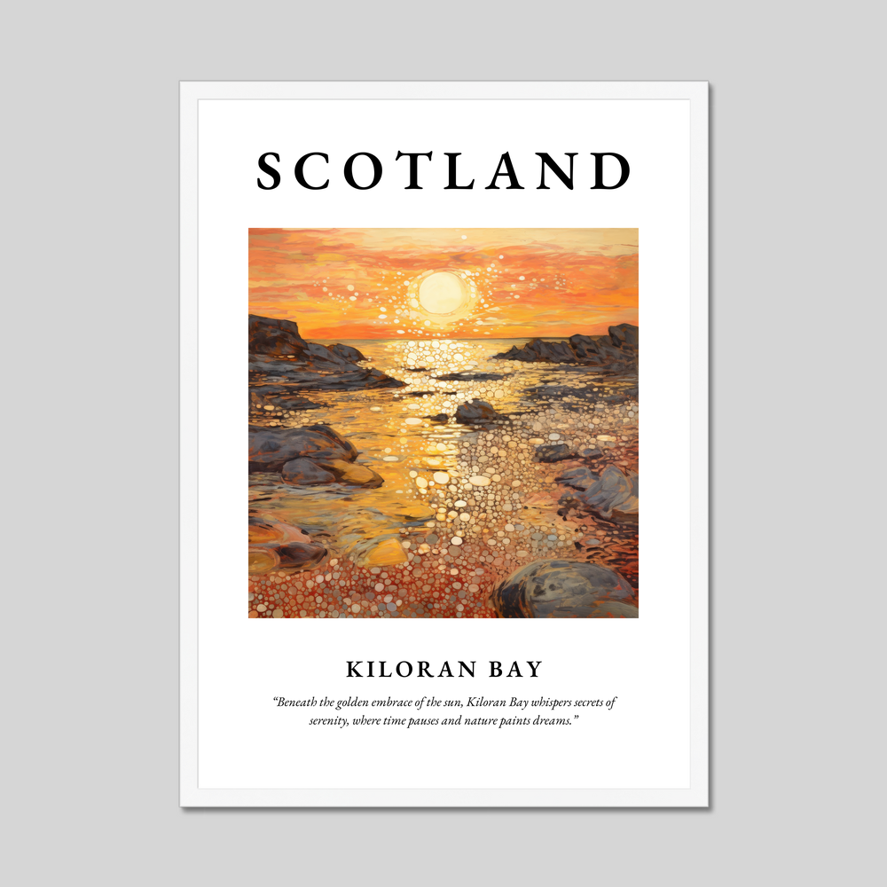 Immerse yourself in the serene beauty of Scotland with our Kiloran Bay art print, masterfully capturing the enchanting essence of this spectacular location. Measuring a generous 50cm x 70cm, this poster is an affordable way to bring a substantial piece of art into your home, occupying a prominent place on any wall without overwhelming your space. The bold word "SCOTLAND" at the top proudly introduces the piece, while the scene beneath it speaks volumes.