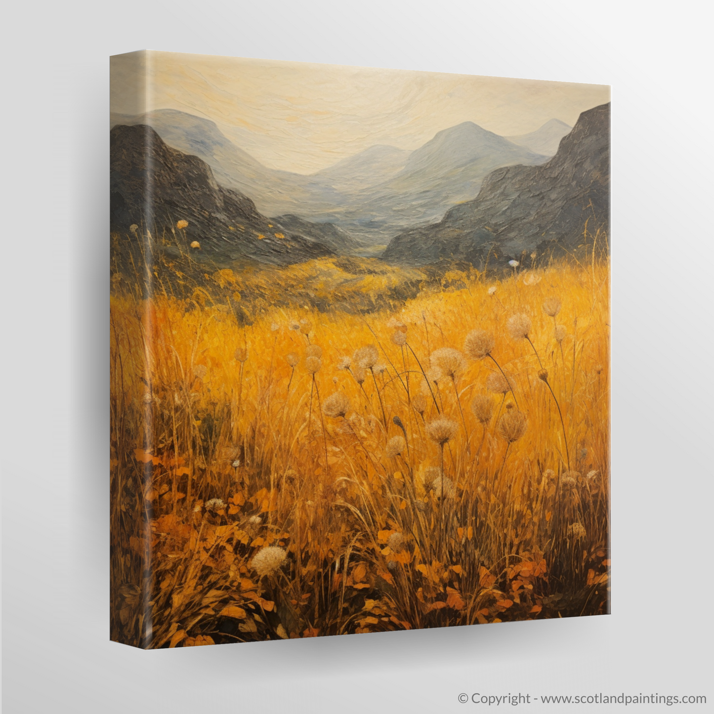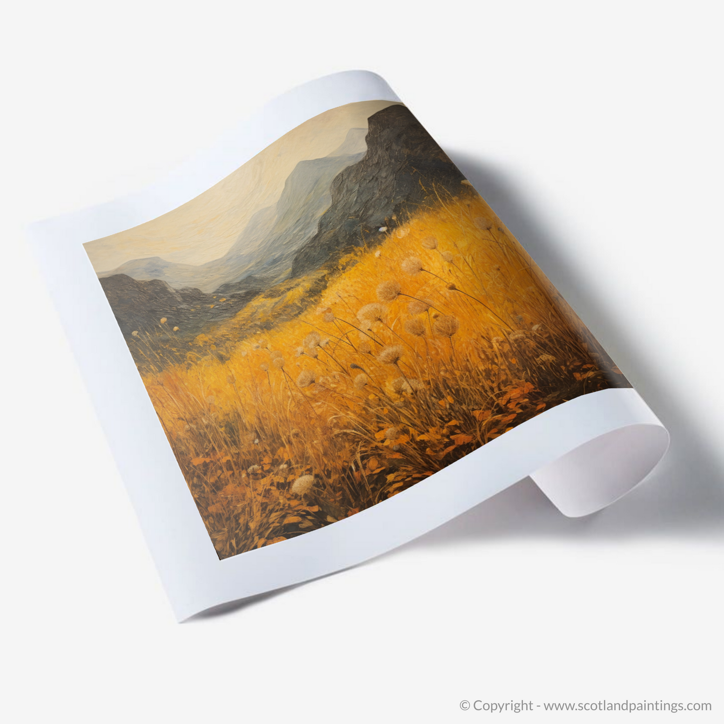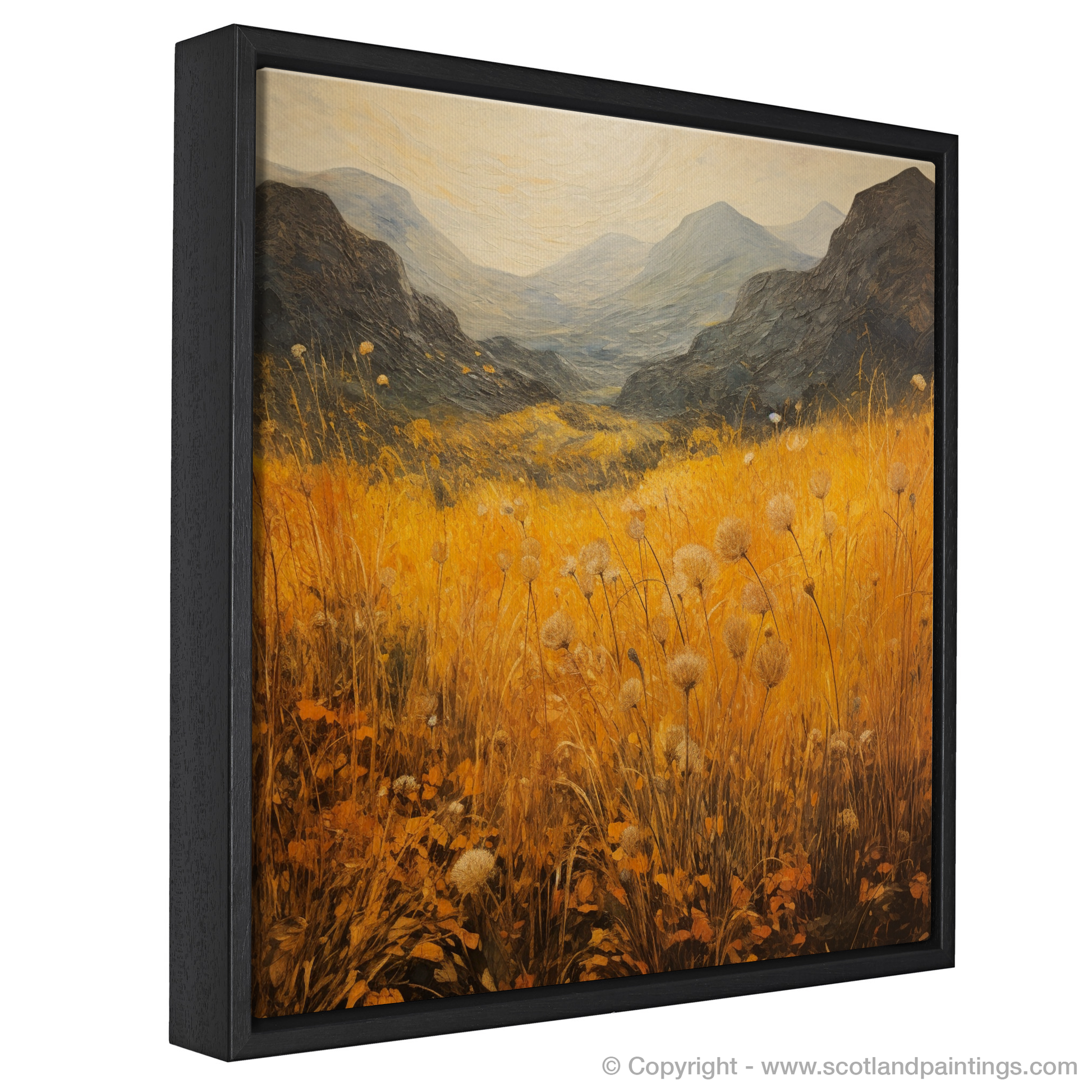 Immerse yourself in the wild beauty of Glencoe with this evocative print, capturing the essence of the Scottish Highlands' Golden bracken. The expansive canvas is alive with vibrant hues of gold and amber as it portrays the rolling hills and lush vegetation that characterises this majestic landscape. The foreground is awash with warm, sun-kissed tones, where delicate bracken fronds dance above the earth-tone underbrush, their crisp, defined edges contrasting with the soft, impressionistic backdrop.