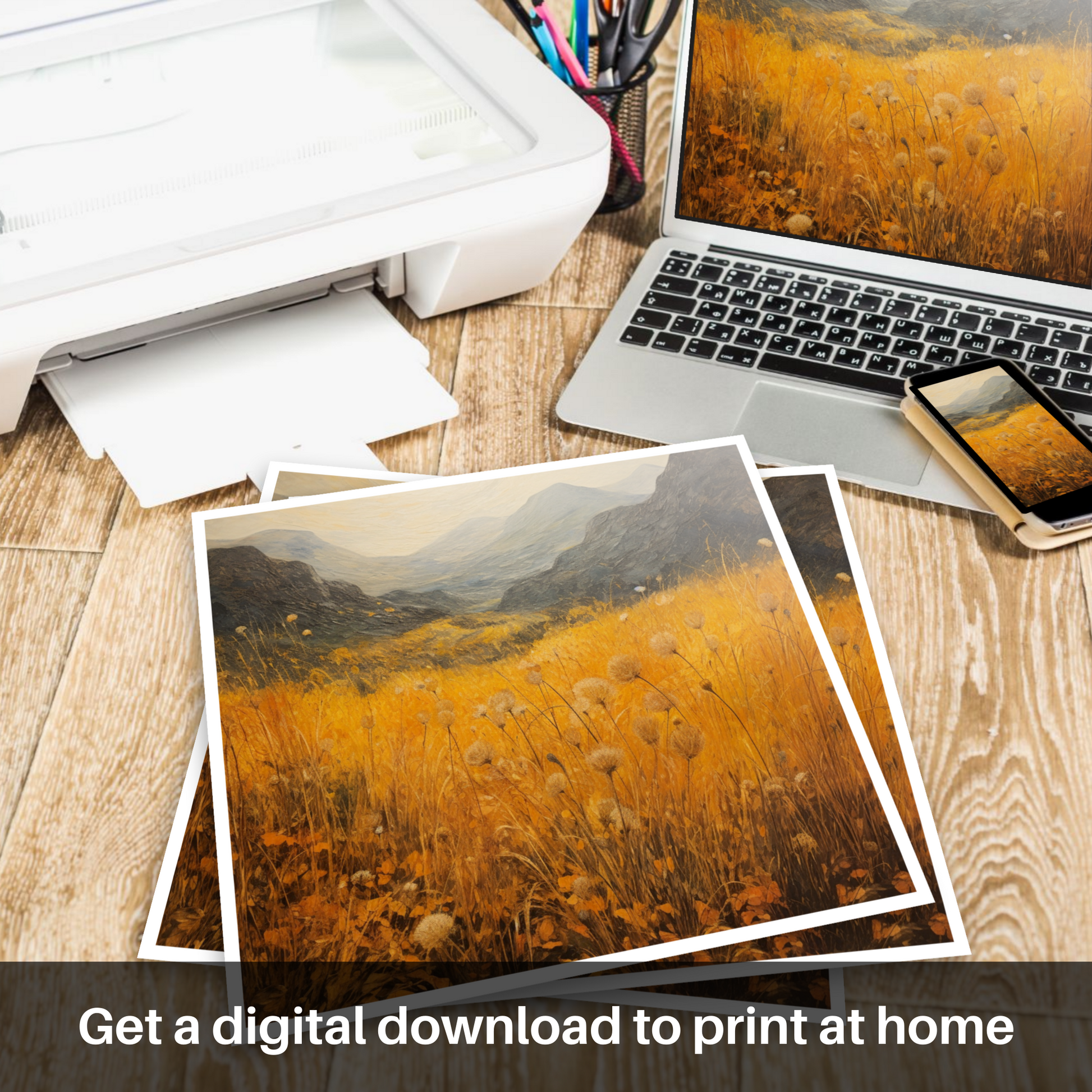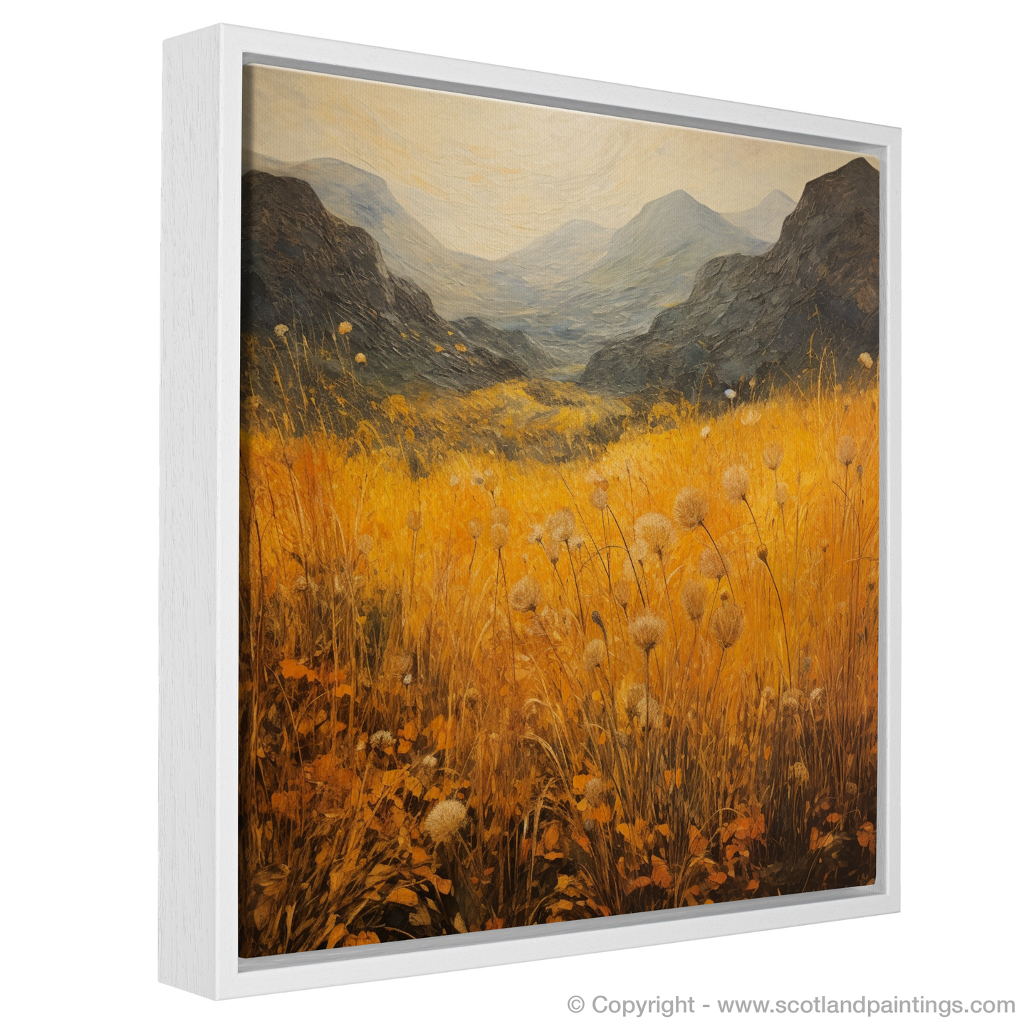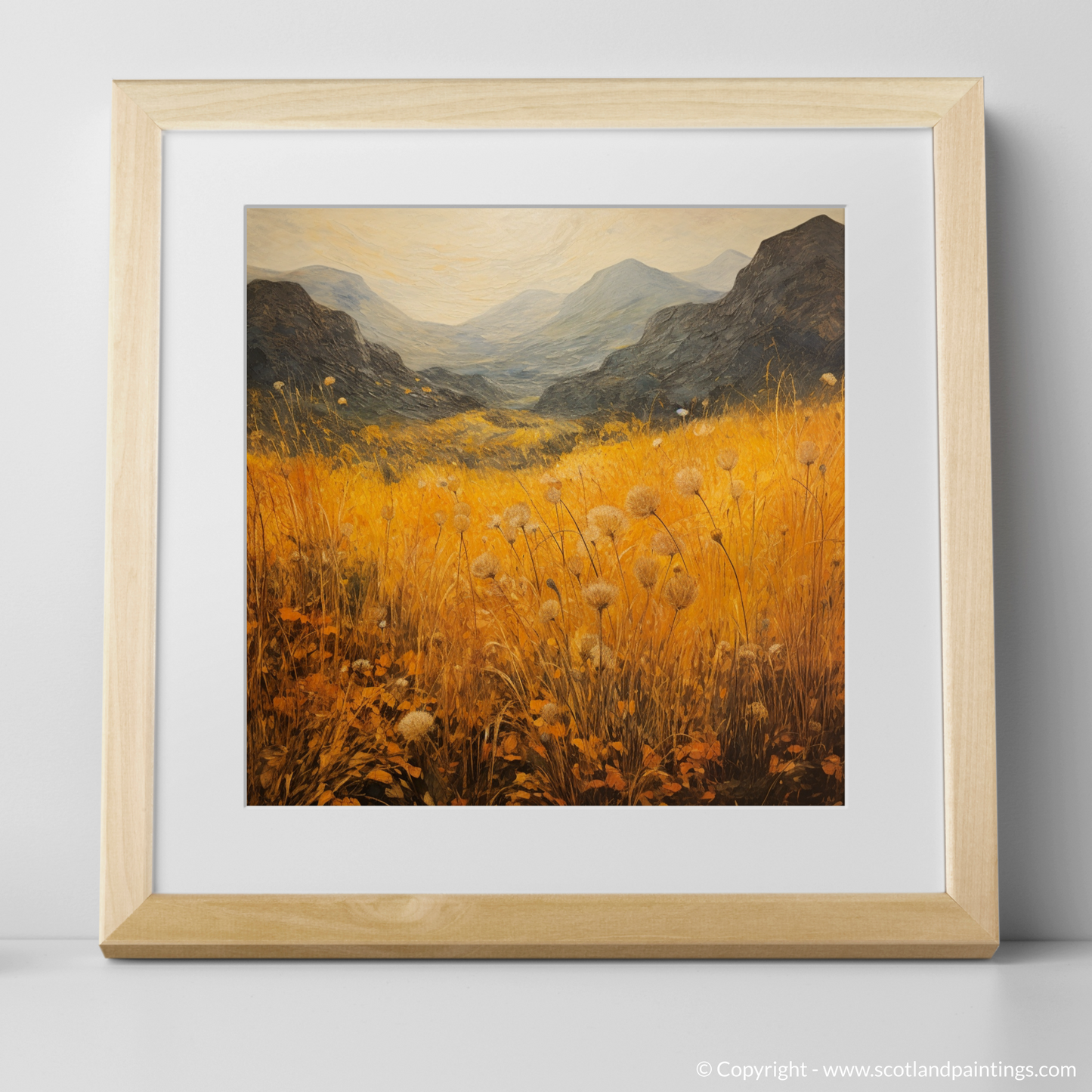 Immerse yourself in the wild beauty of Glencoe with this evocative print, capturing the essence of the Scottish Highlands' Golden bracken. The expansive canvas is alive with vibrant hues of gold and amber as it portrays the rolling hills and lush vegetation that characterises this majestic landscape. The foreground is awash with warm, sun-kissed tones, where delicate bracken fronds dance above the earth-tone underbrush, their crisp, defined edges contrasting with the soft, impressionistic backdrop.
