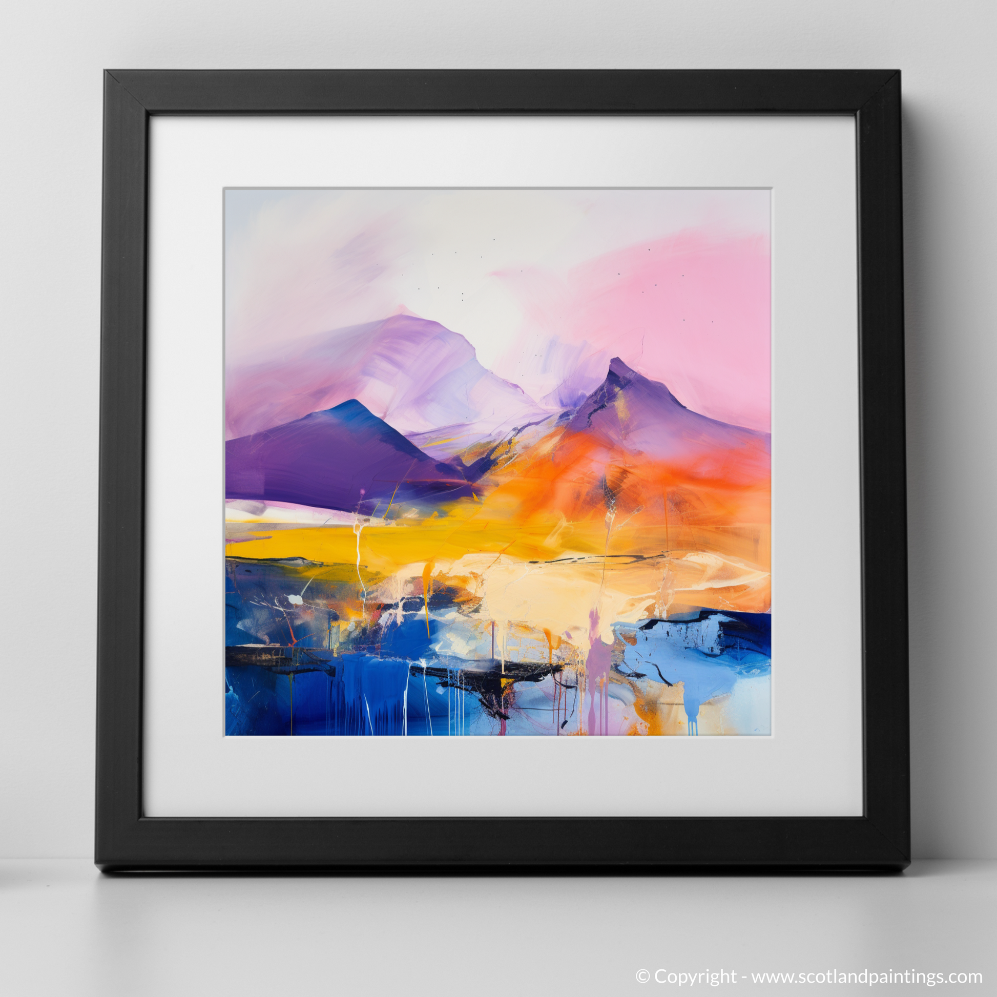 Capturing the essence of Scotland's rugged landscape, this captivating abstract piece from our 'Scottish Munros' collection embodies the towering ascent and majestic presence of Ben Lawers. Swaths of vivid colour evoke the raw beauty of this famous Highland peak. In this composition, bold ultramarine and deep purples form an undulating silhouette of mountain ridges, while splashes of tangerine, gold, and lemon suggest a setting sun casting its warm glow across the heather-clad hills.
