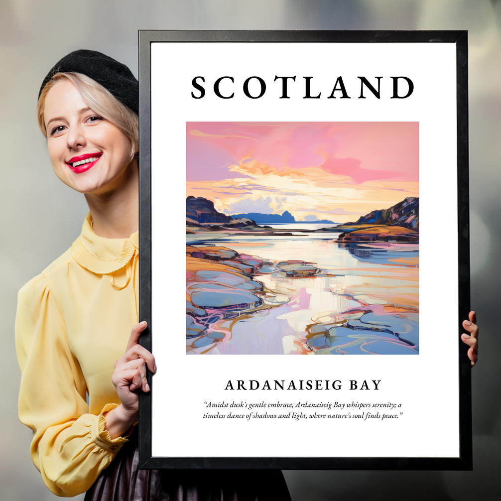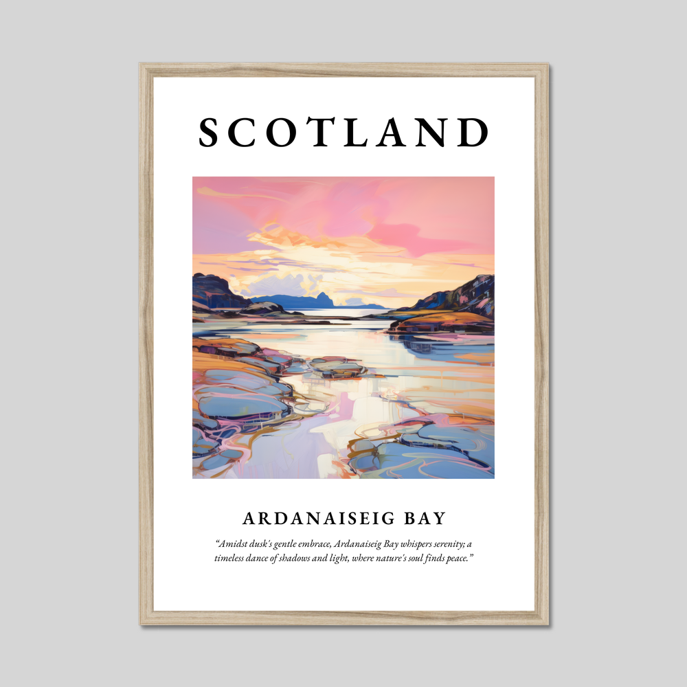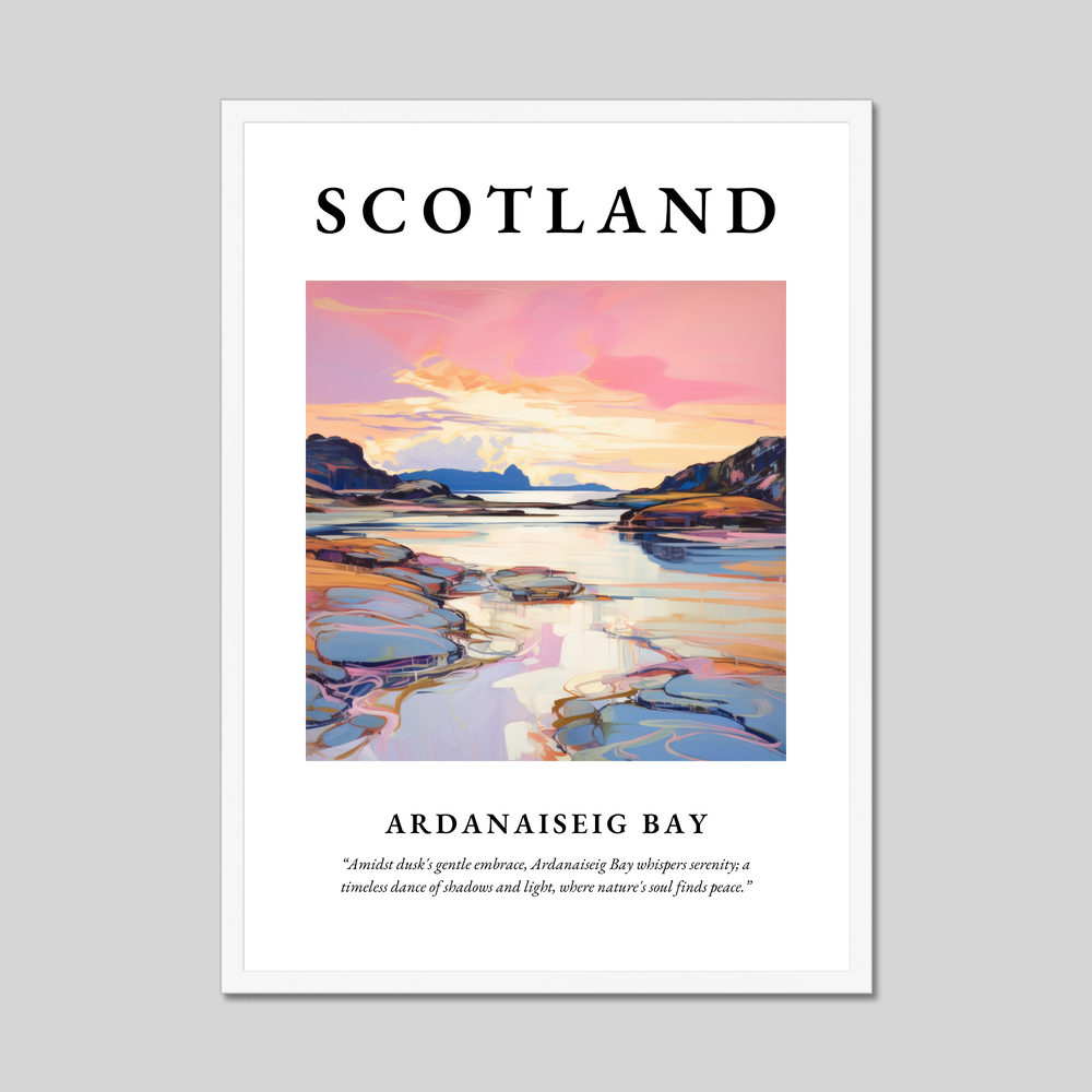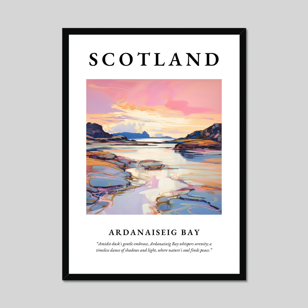 Ardanaiseig Bay, nestled amidst Scotland's idyllic wilderness, is a place where time seems to stand still. Known for its tranquil waters and captivating natural beauty, it offers a peaceful escape from the humdrum of everyday life. As depicted in the artwork, the bay is home to serene sunsets and a harmonious blend of colours that shift with the changing light, inviting you to experience a moment of pure tranquillity. Whether you've wandered its shores, long to visit, or simply seek to bring a piece of Scotland's wilderness into your space, this framed poster is a poignant reminder of nature's grace.